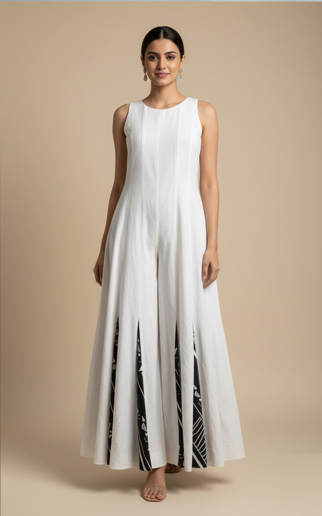 Solid sleeveless jumpsuit with round neck and printed panels and flared bottom