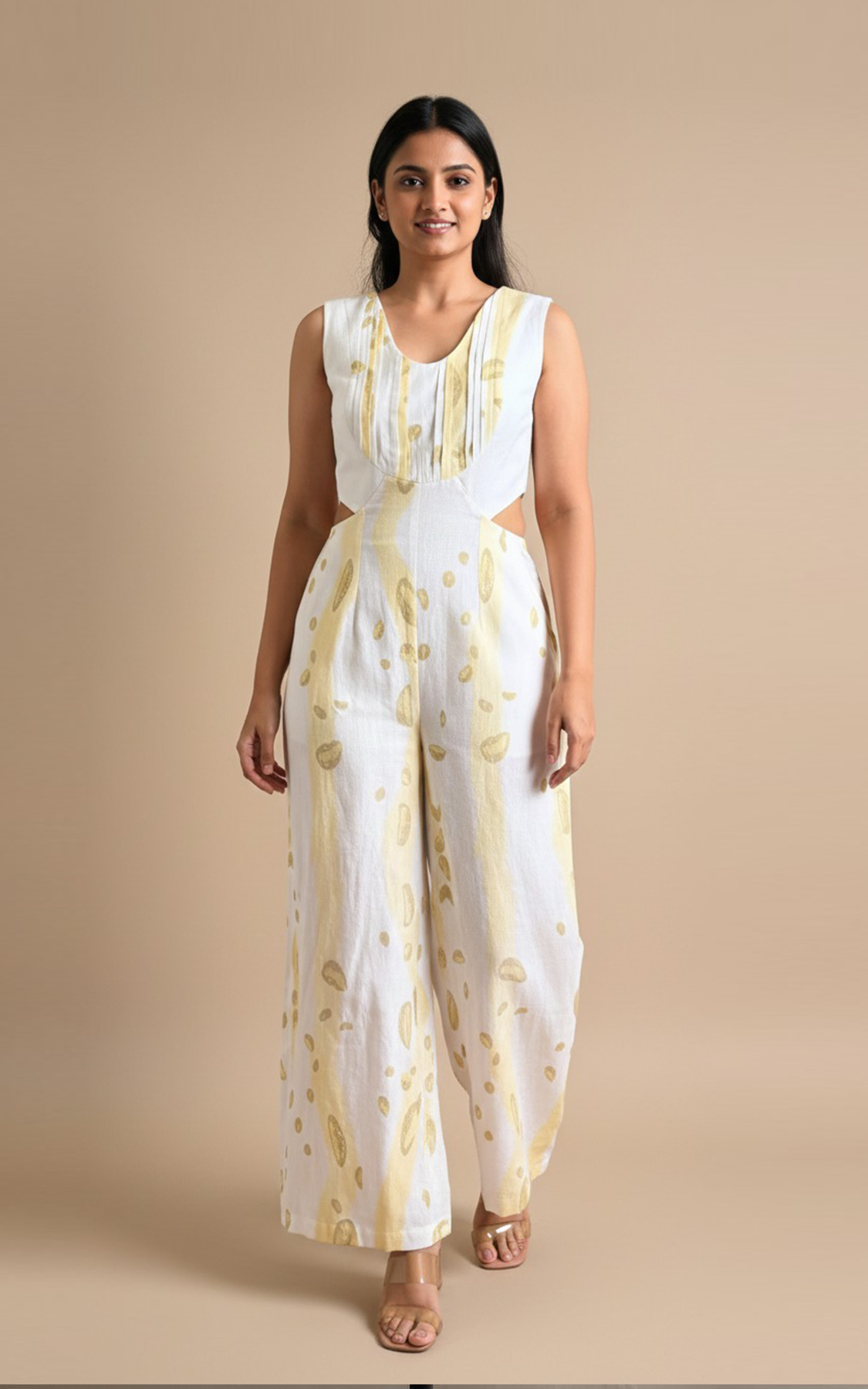 Yellow waterdrops abstract printed sleeveless jumpsuit with pockets. It has a cut out detailing on the waist and pleating detailing on the yoke.