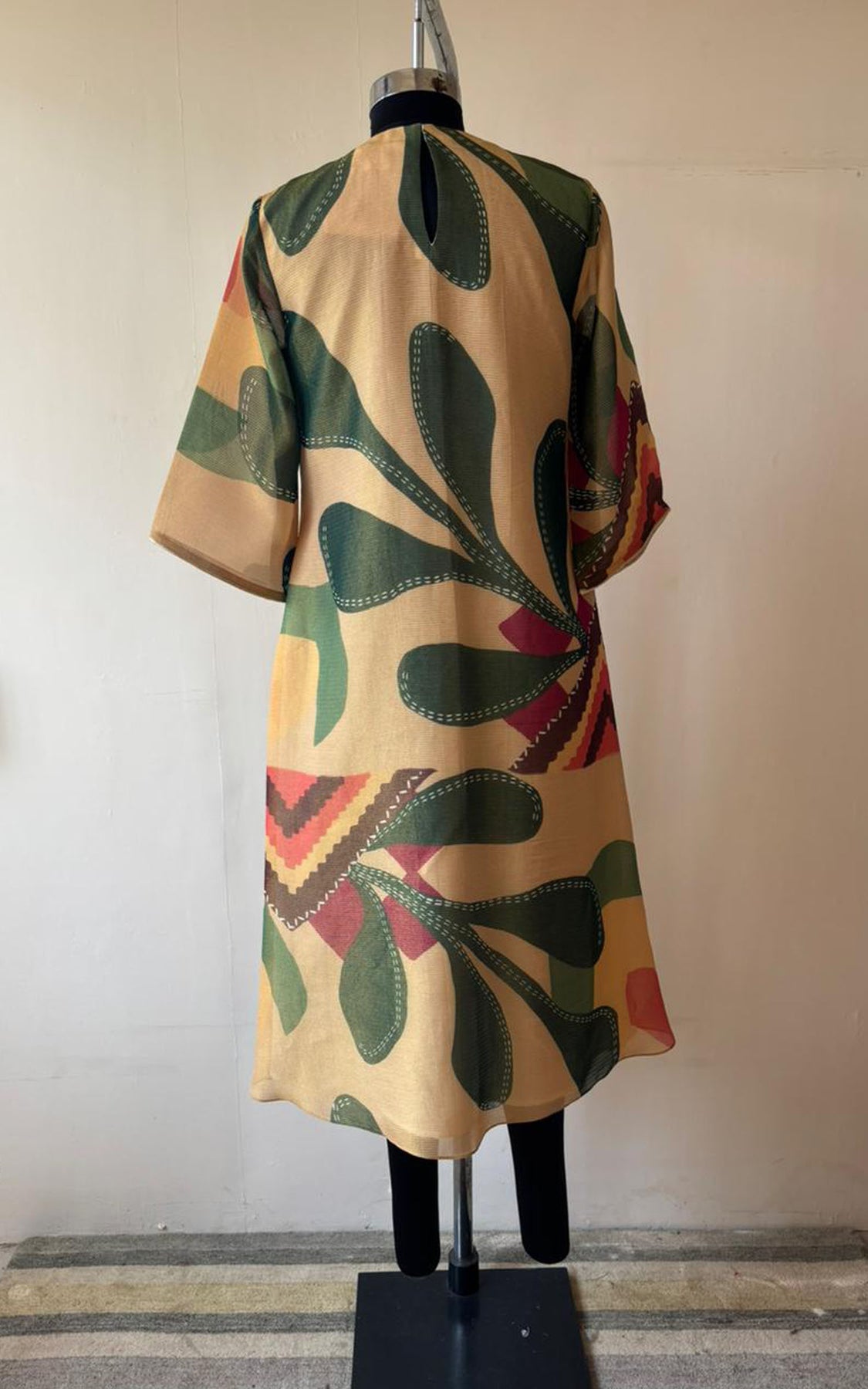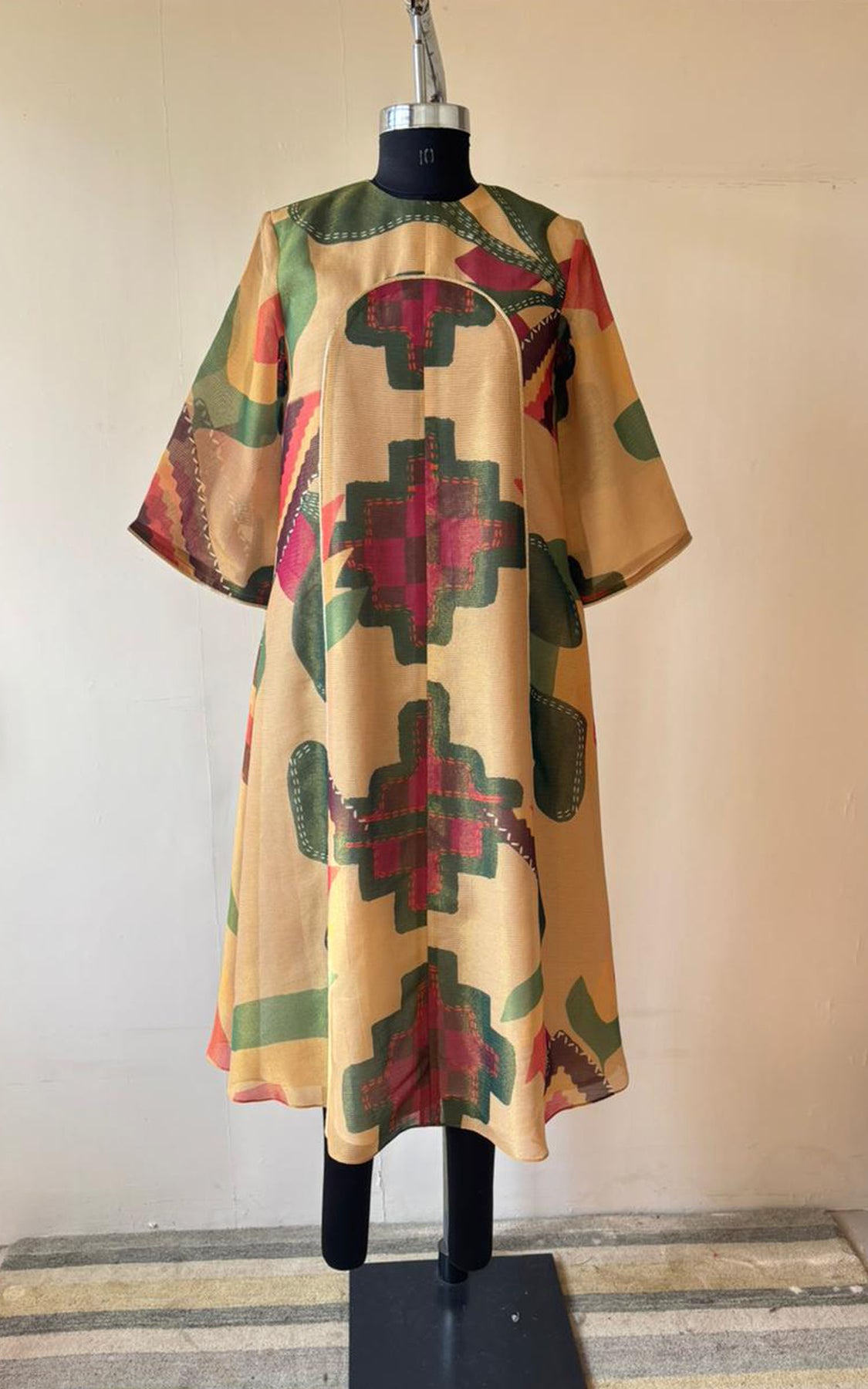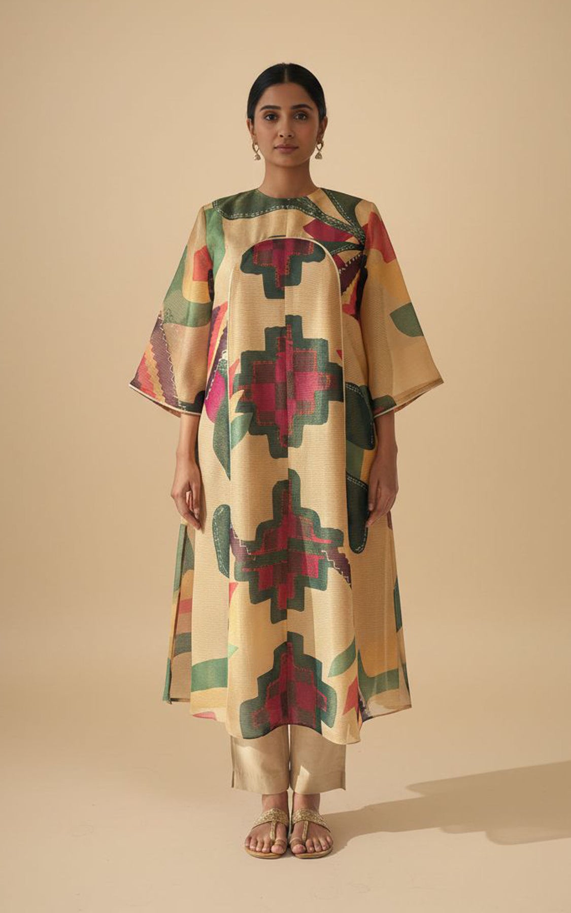 Beige printed paneled Kurta with gold panel detailing in the front and gold borders on sleeves.
