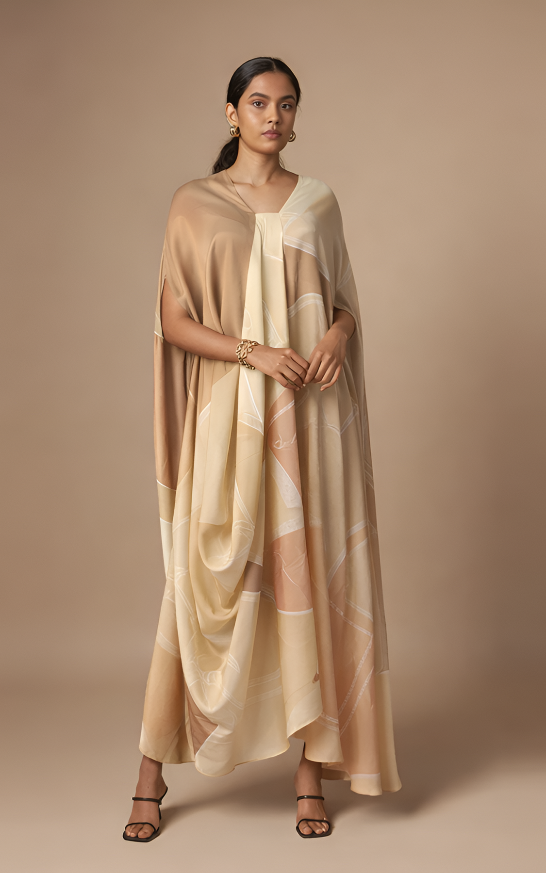 An abstract printed kaftan-style drape crafted in a fluid, flowy silhouette that drapes beautifully and flatters all body types with effortless ease.
