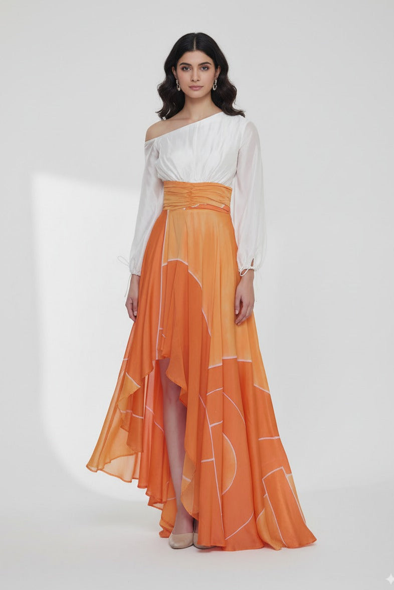 Abstract printed asymmetric long dress with tie up at the Sleeves and gathered texture at the yoke.