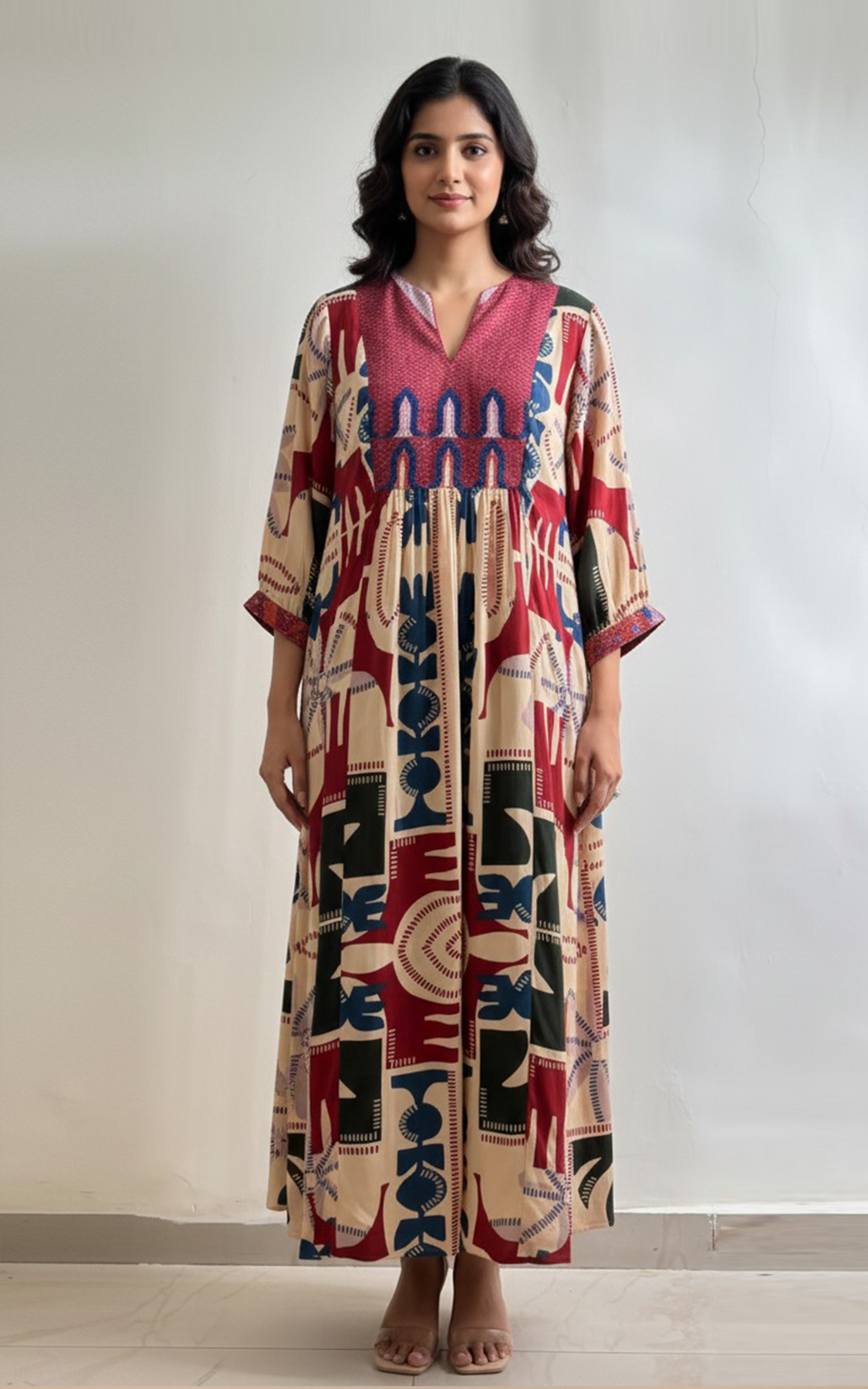 Abstract printed long dress with sequin detailing on yoke and cuff.