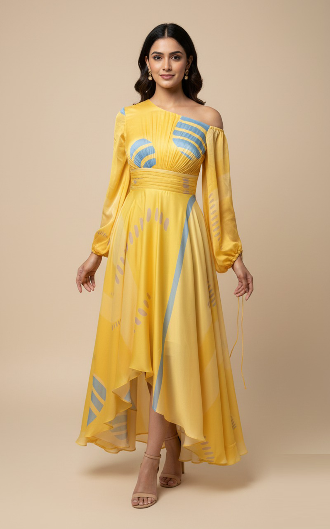 Abstract printed asymmetric long dress with tie up at the Sleeves and gathered texture at the yoke.