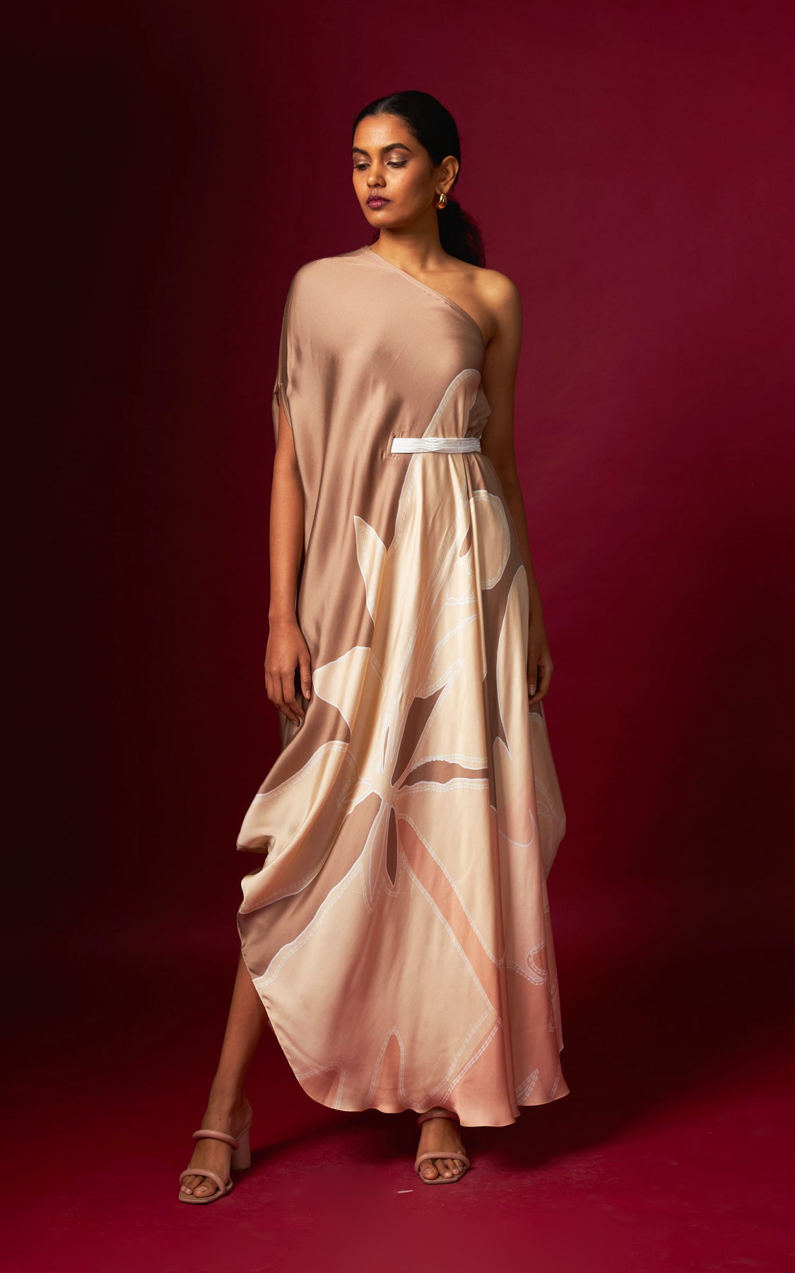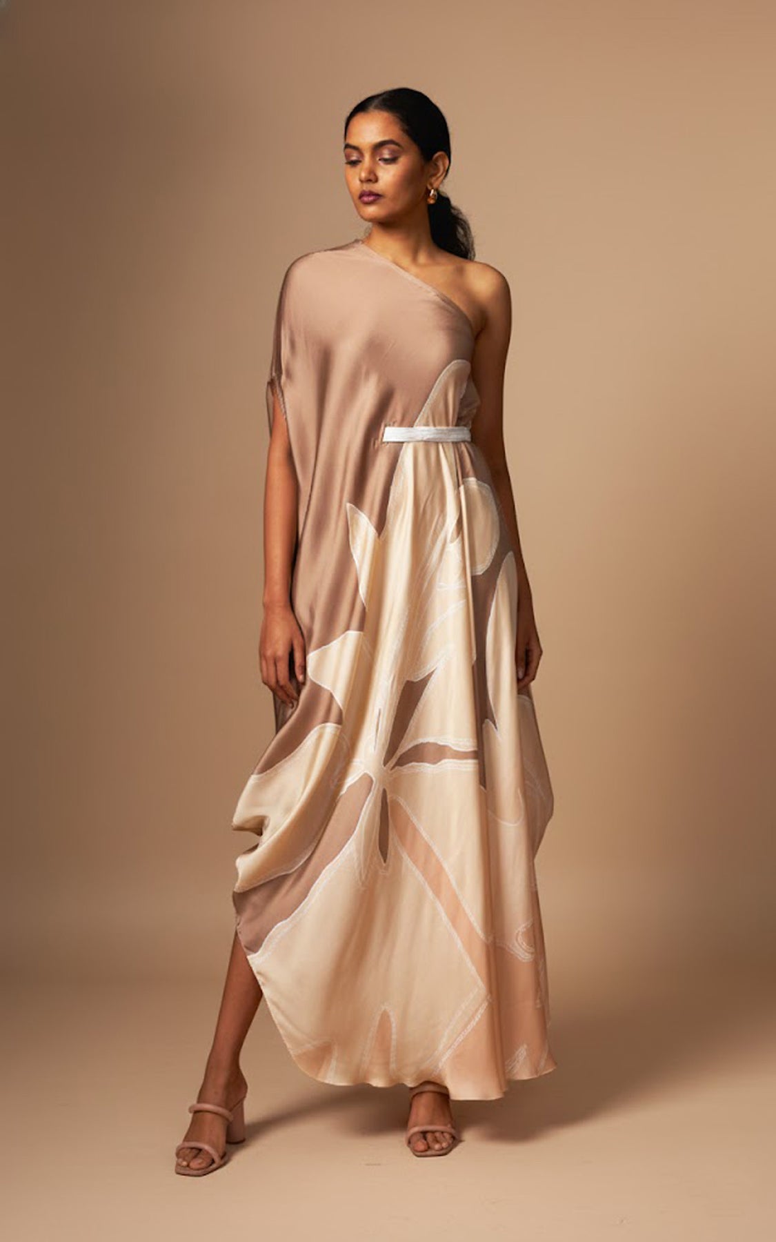 A beige abstract printed one-shoulder drape dress, finished with a detachable belt that cinches the waist on one side for a flattering fit. Designed in a fluid, flowy silhouette, this style drapes beautifully and complements all body types with effortless ease.