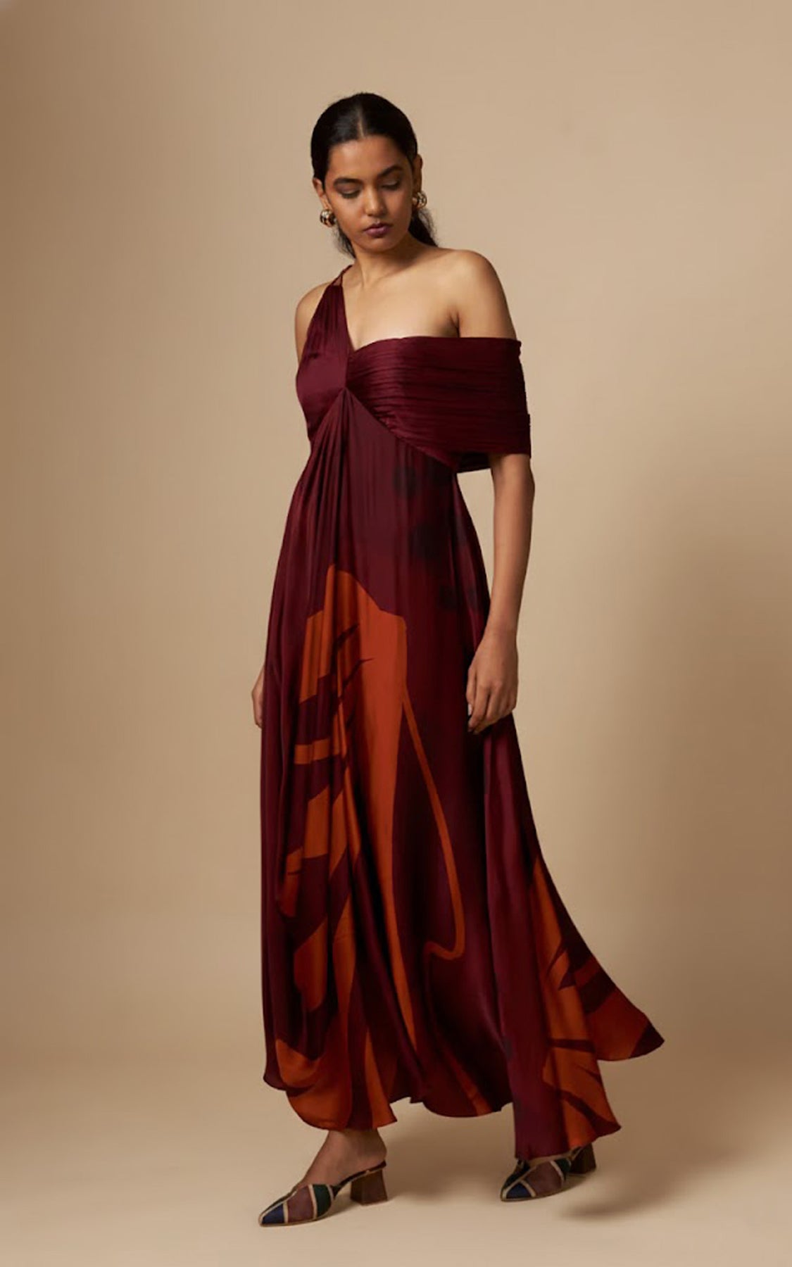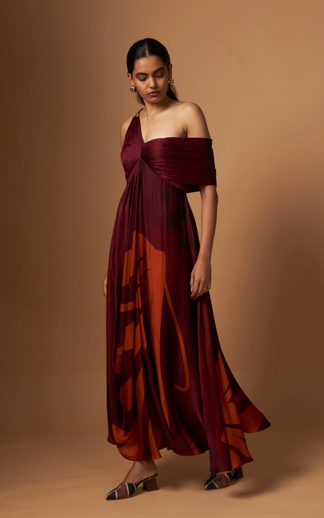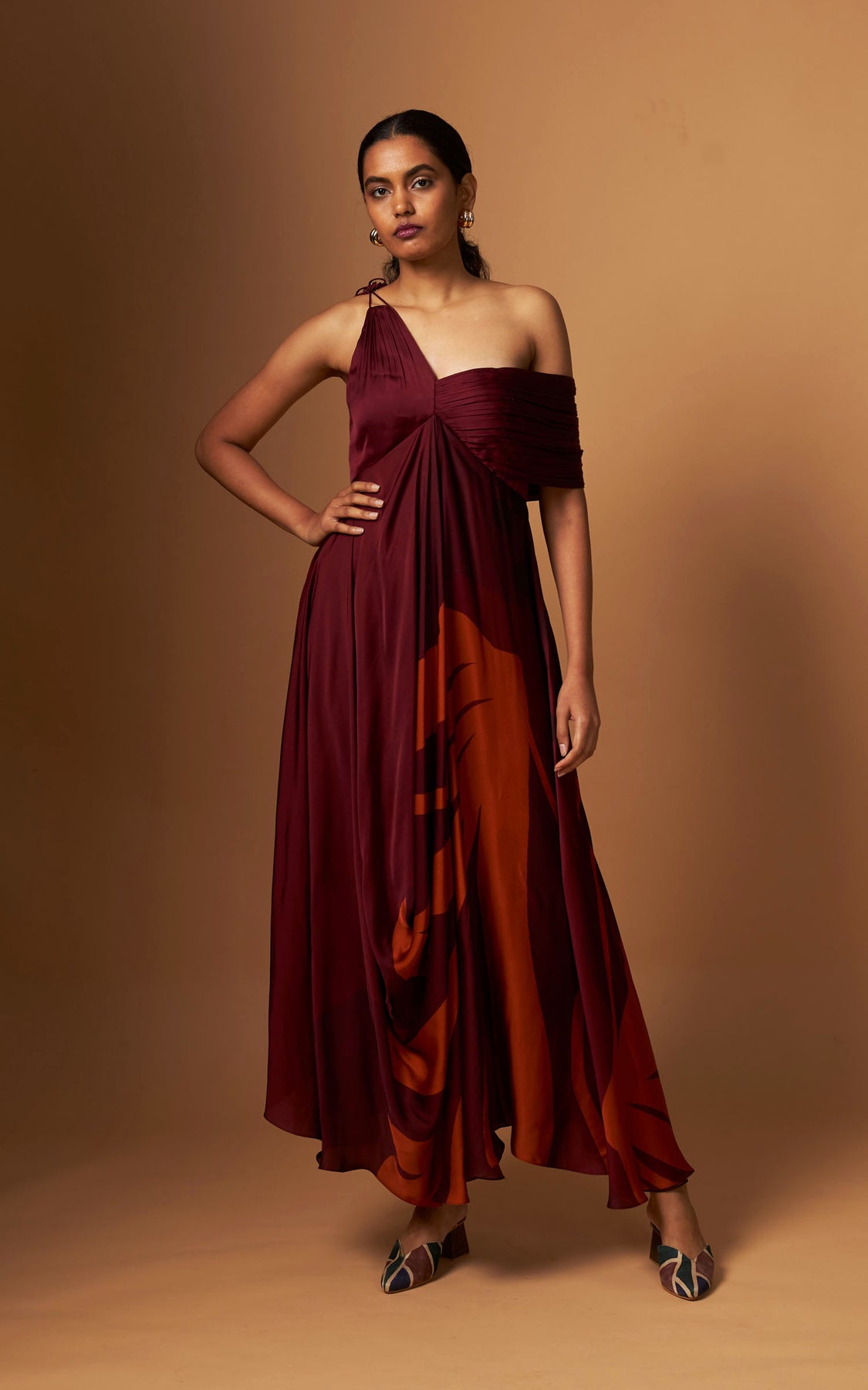 Maroon abstract print one-shoulder drape dress featuring an adjustable tie-up shoulder strap and a hand pleated drop shoulder that elegantly covers the arms.