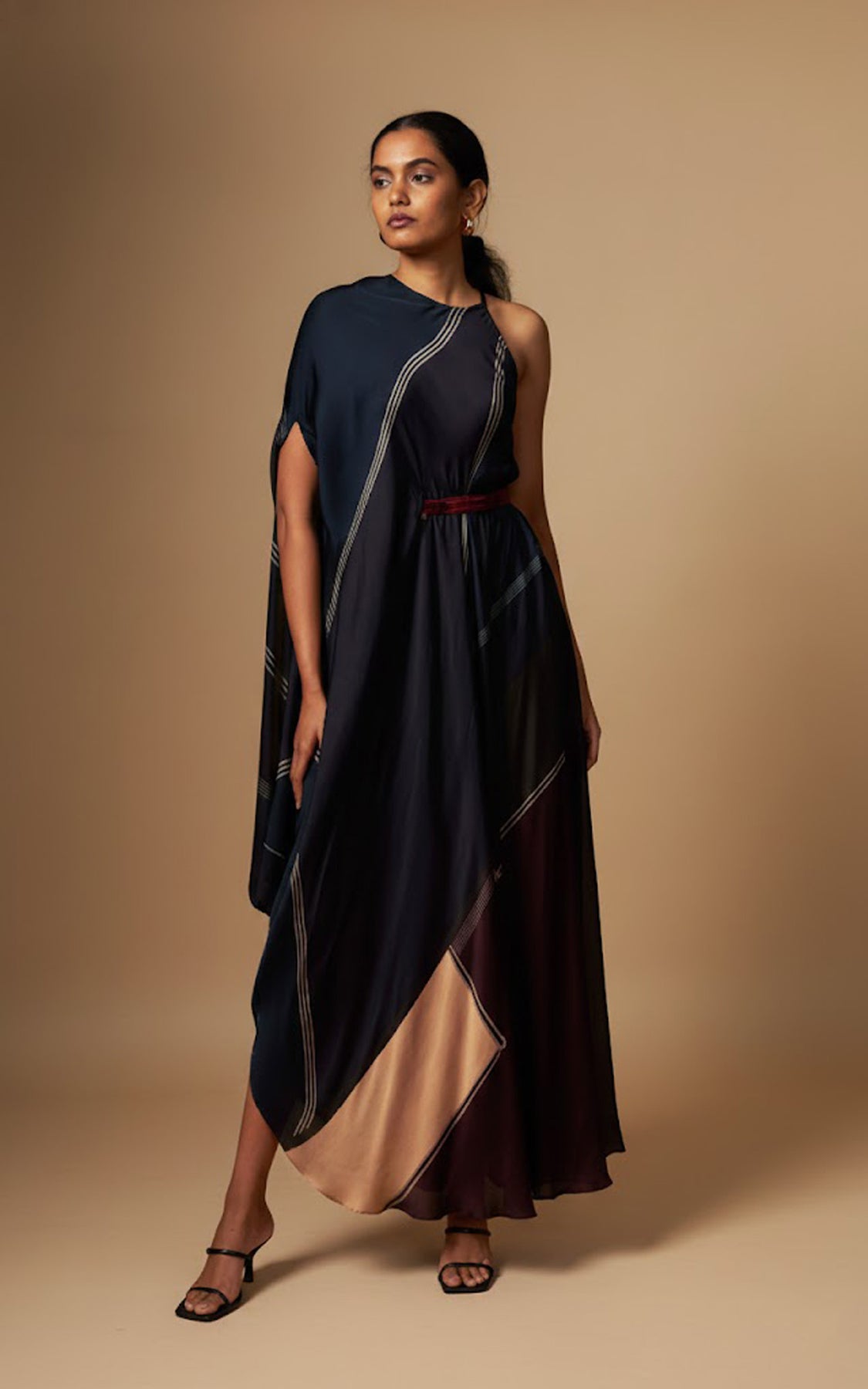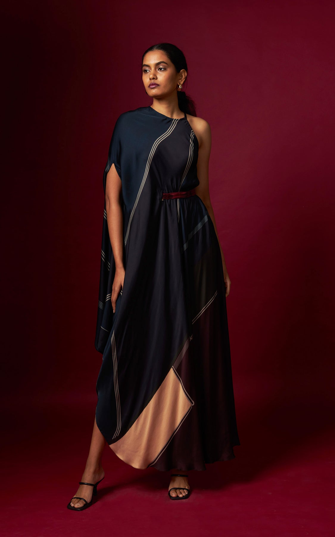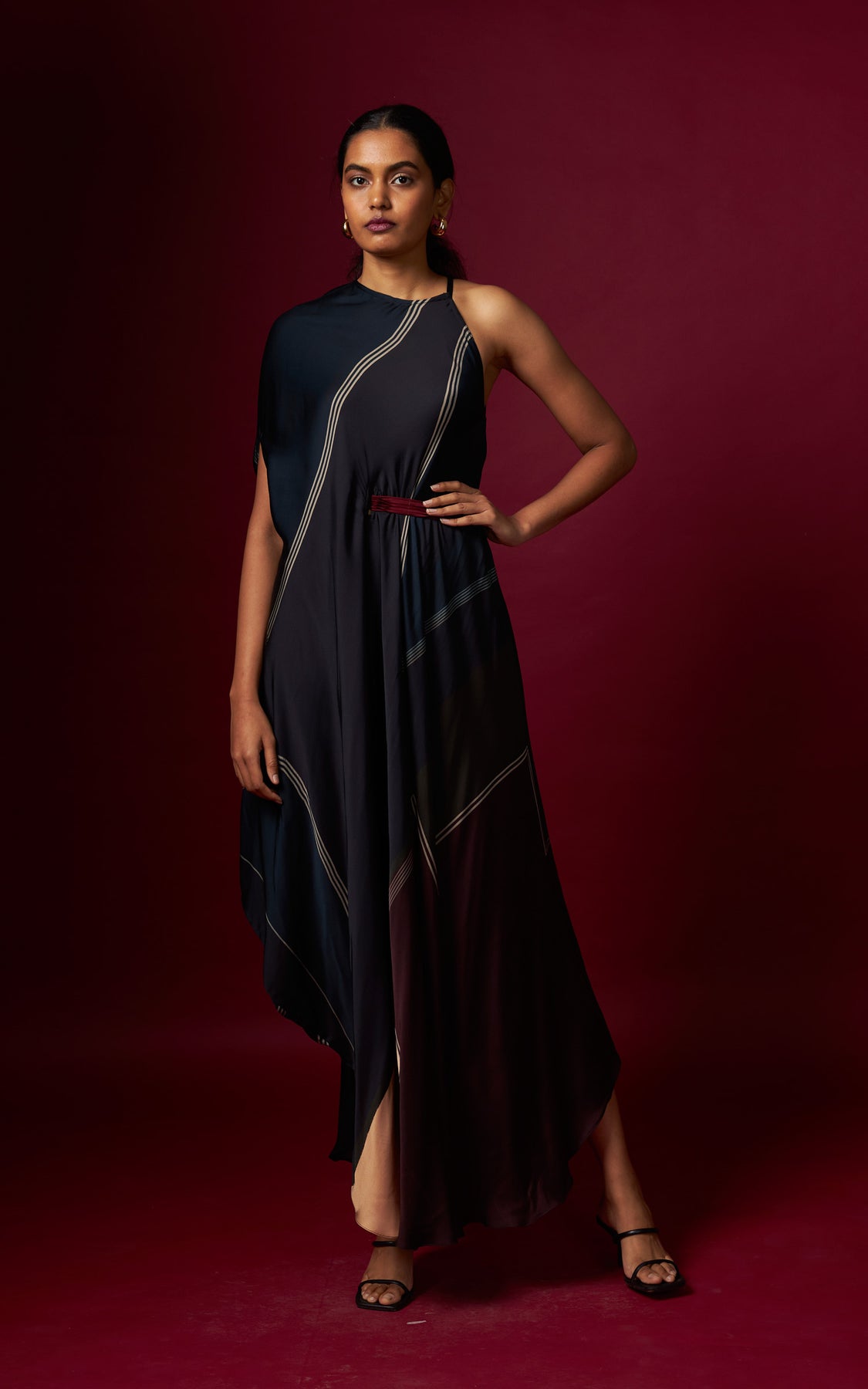 An abstract print incut drape, finished with a detachable belt that cinches the waist on one side for a flattering fit. Crafted in a fluid, flowy silhouette, this style drapes beautifully and complements all body types with effortless elegance.
