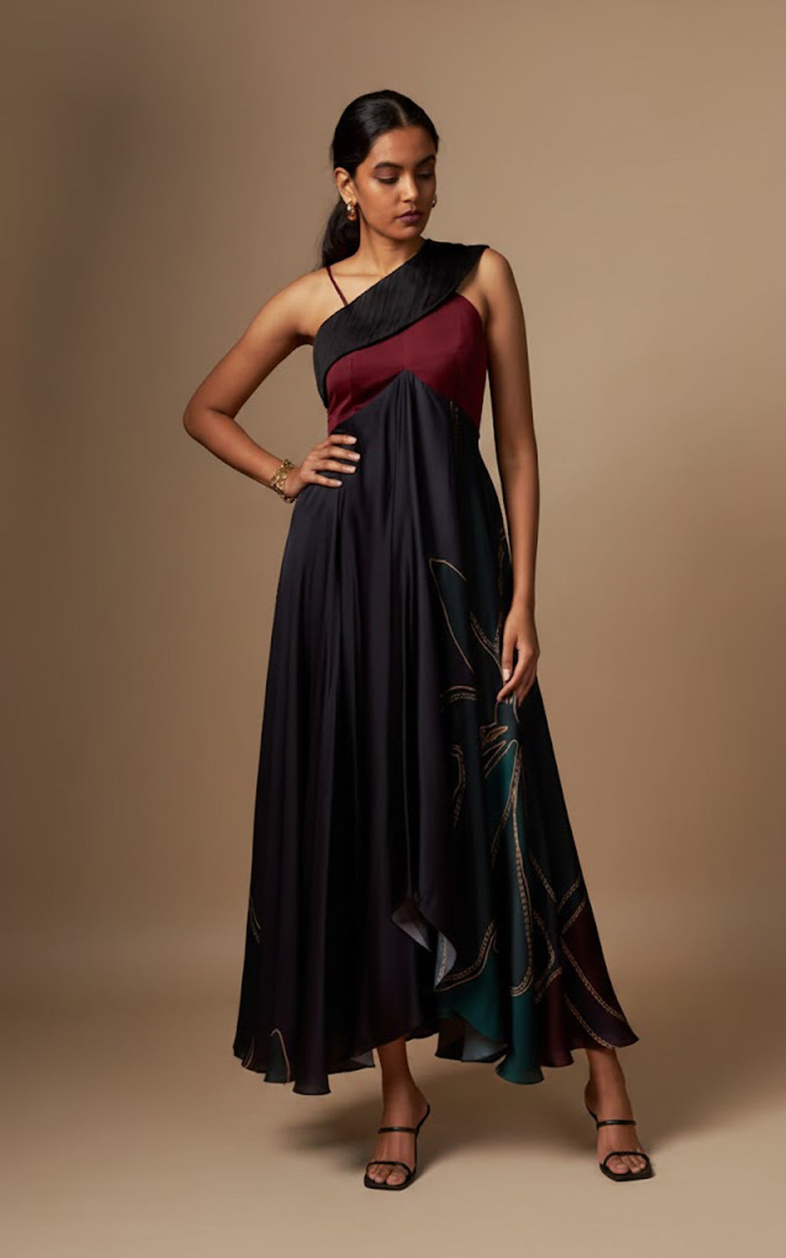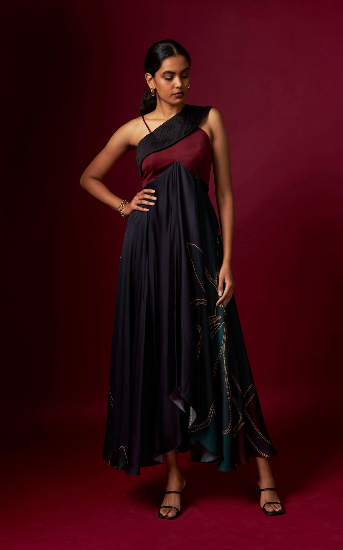 This abstract print one-shoulder dress is designed with an asymmetric hemline and intricate hand-pleating on the yoke for added texture and movement.