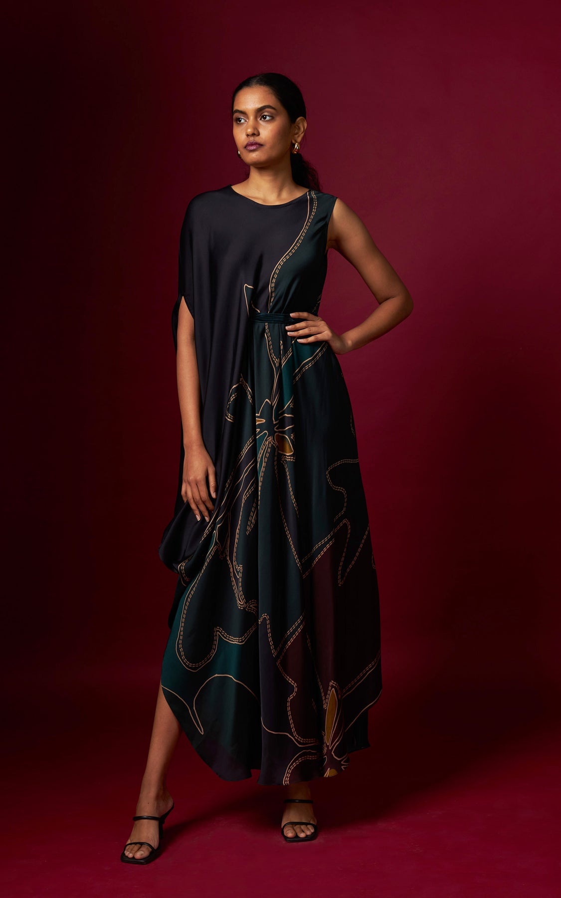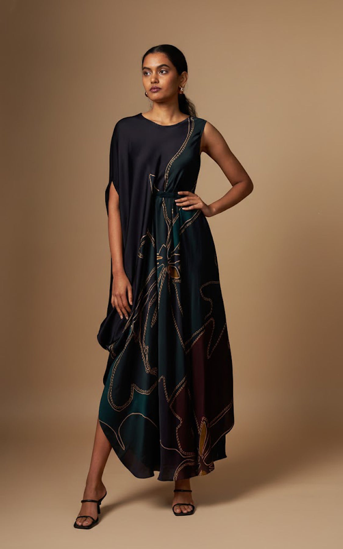 Abstract print sleeveless drape, finished with a detachable belt that cinches the waist on one side for a flattering fit. Designed in a fluid, flowy silhouette, this style drapes beautifully and complements all body types with effortless elegance.