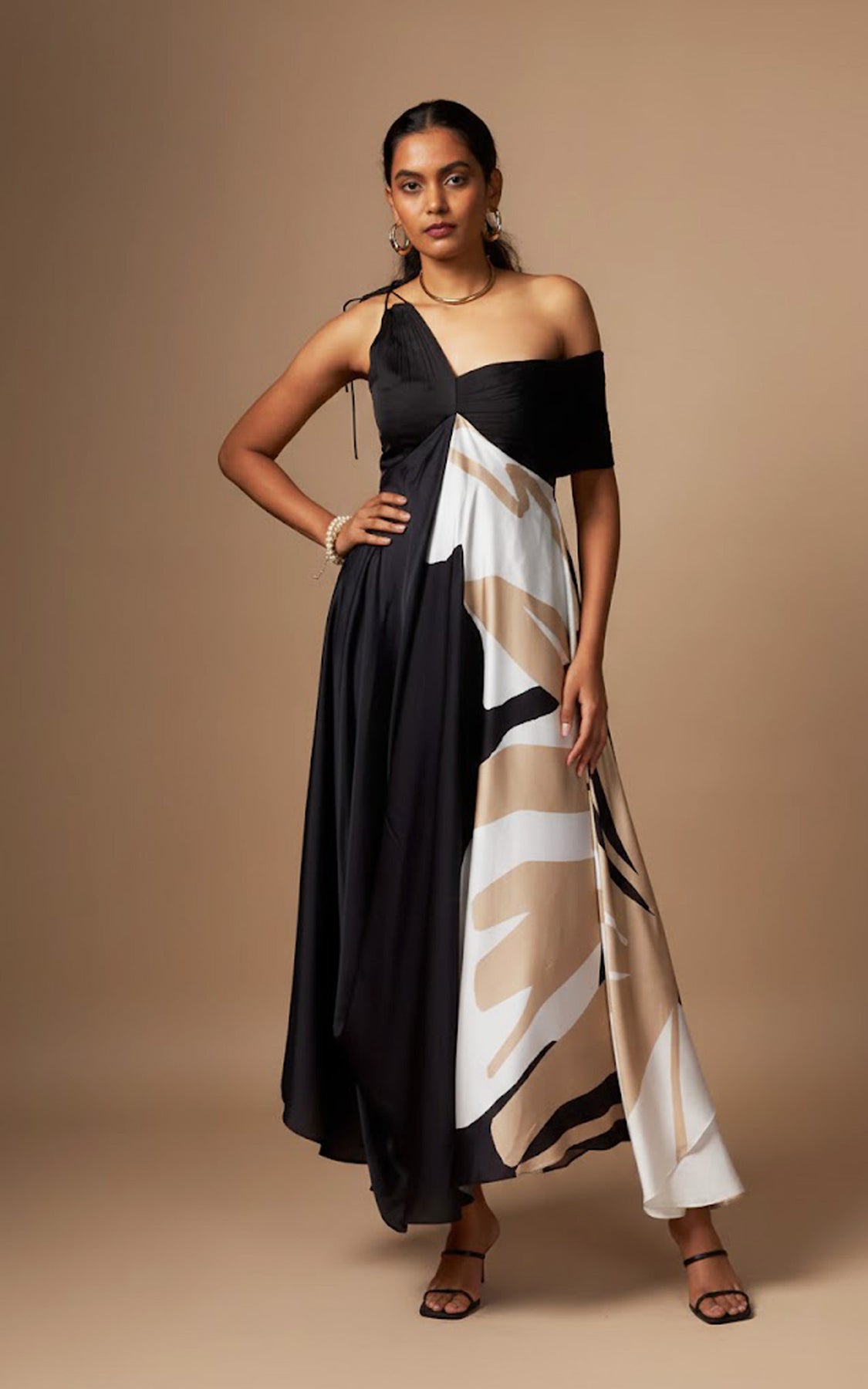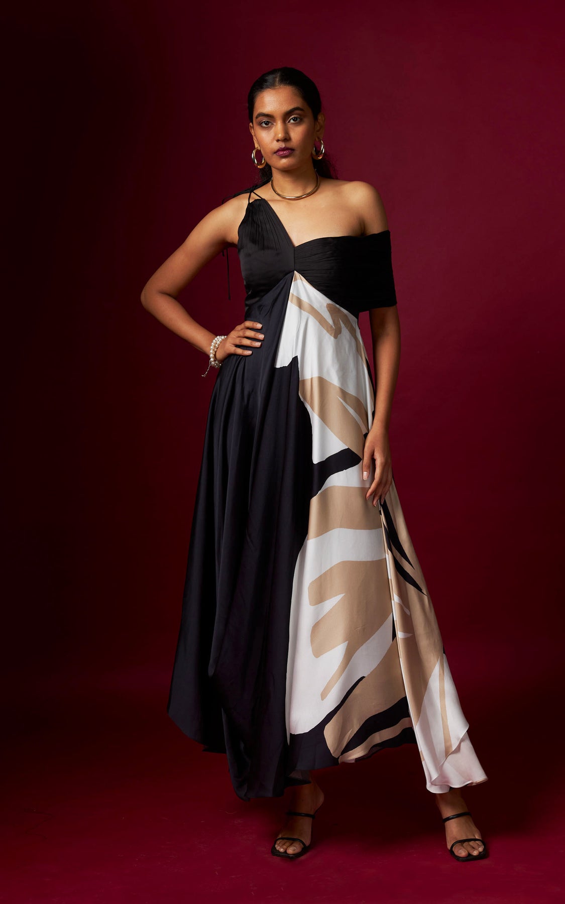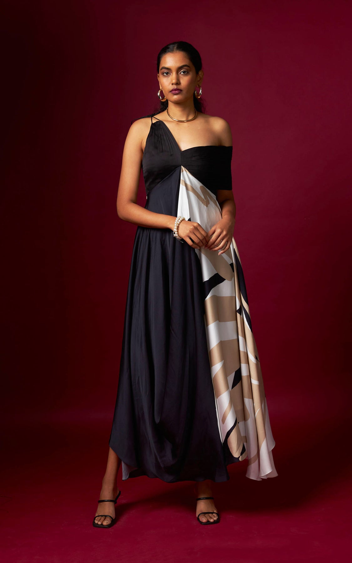 Black & White abstract print one-shoulder drape dress featuring an adjustable tie-up shoulder strap and a hand pleated drop shoulder that elegantly covers the arms.
