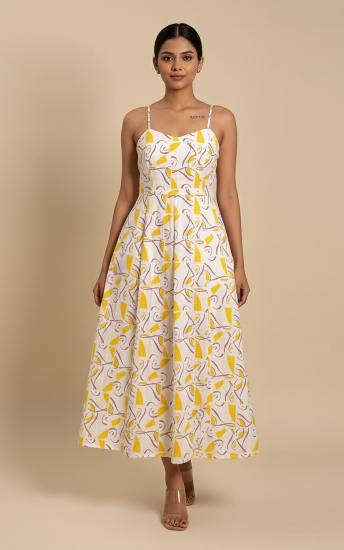 Block printed midi dress with straps and pockets o This is a fit & flare style.