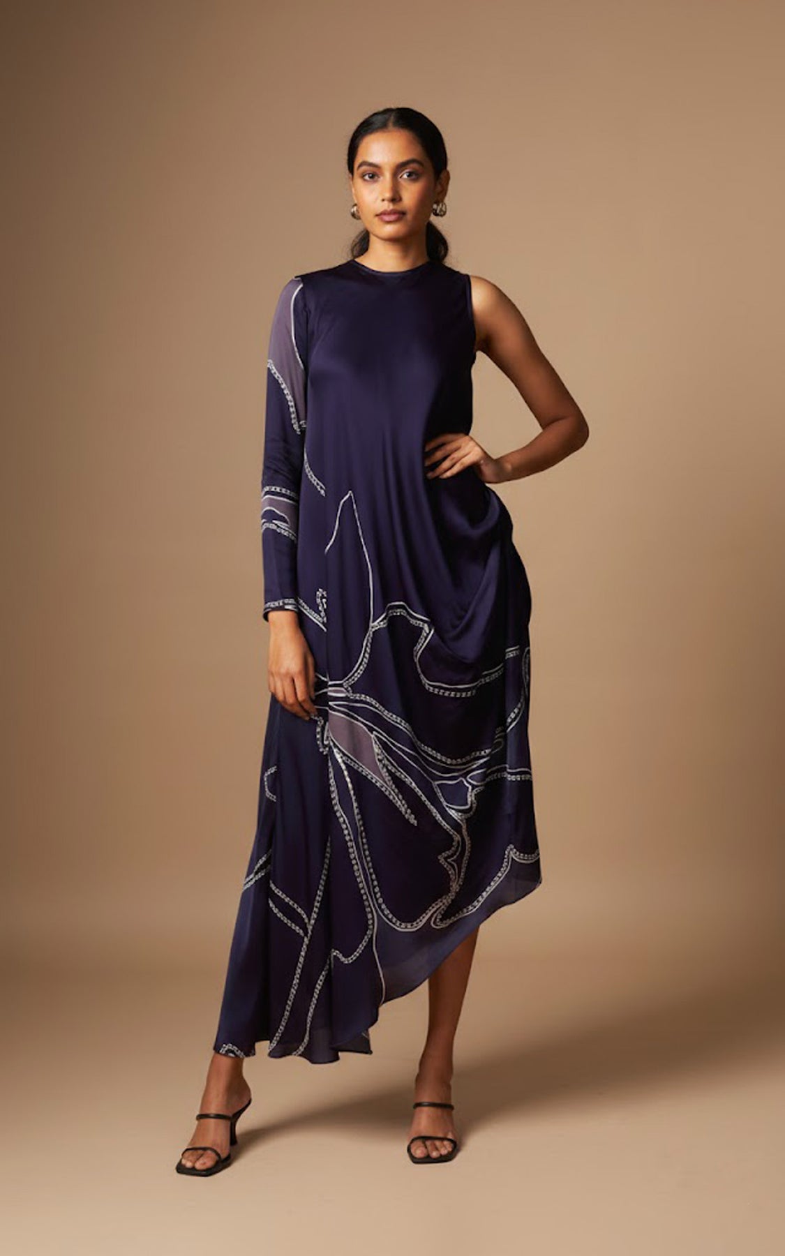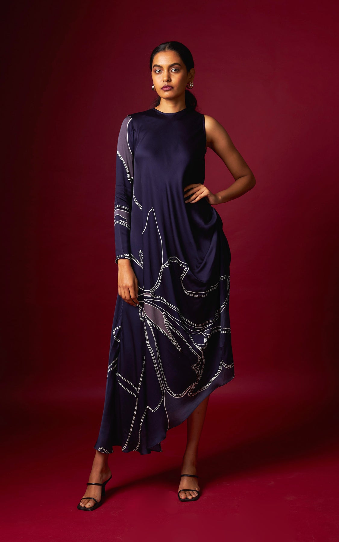 An abstract print signature drape dress featuring a one-sided sleeve and a statement asymmetric hemline.
