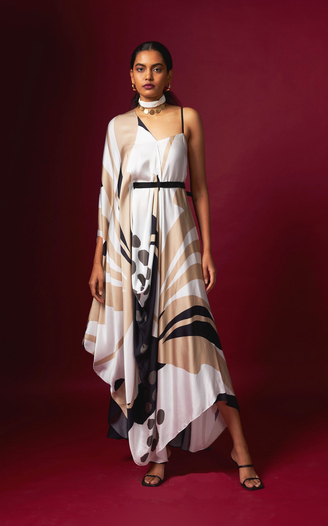 Abstract print asymmetric V-neck drape, finished with a detachable belt that cinches the waist on one side for a flattering fit. Crafted in a fluid, flowy silhouette, this style drapes beautifully and complements all body types with effortless elegance.