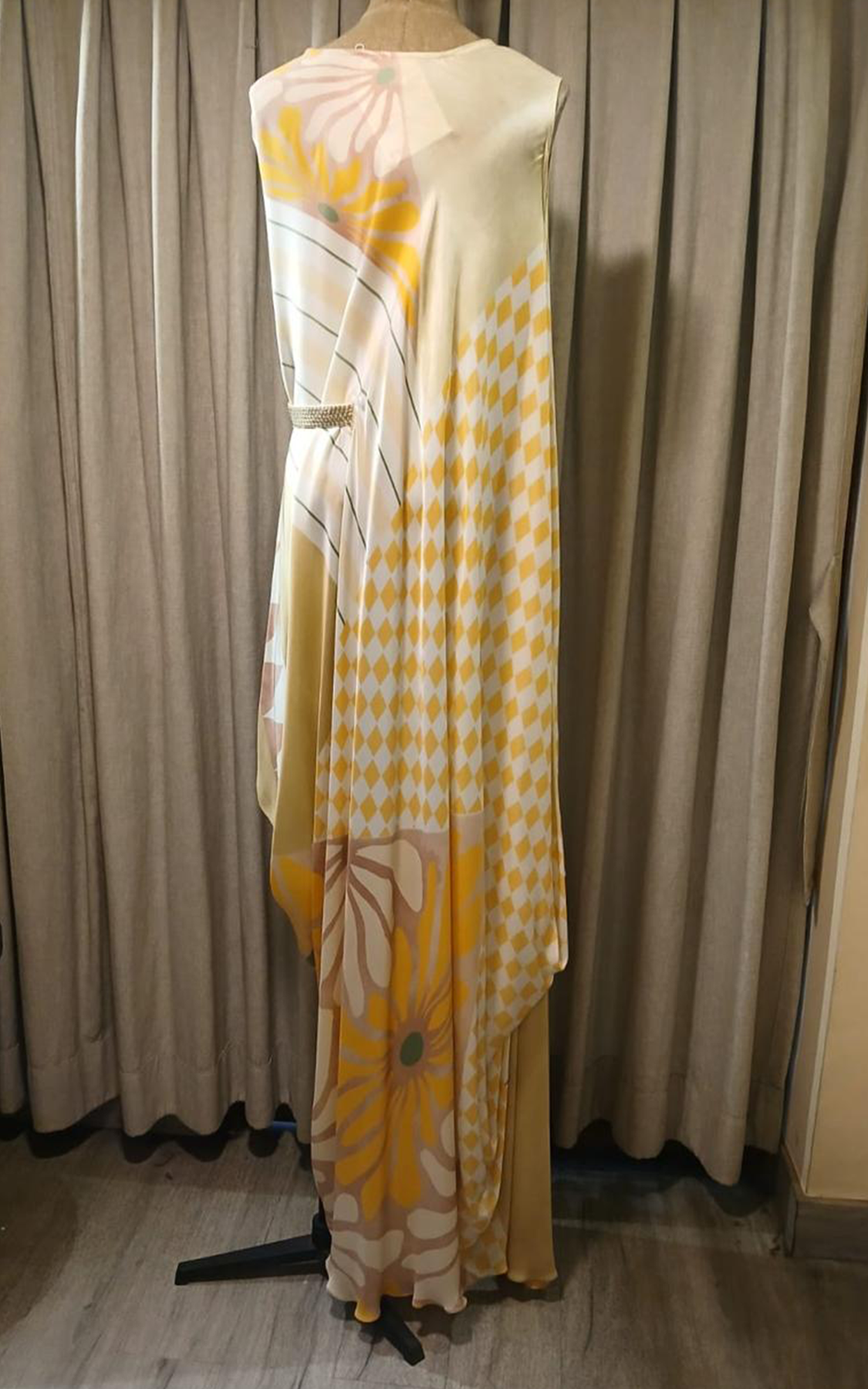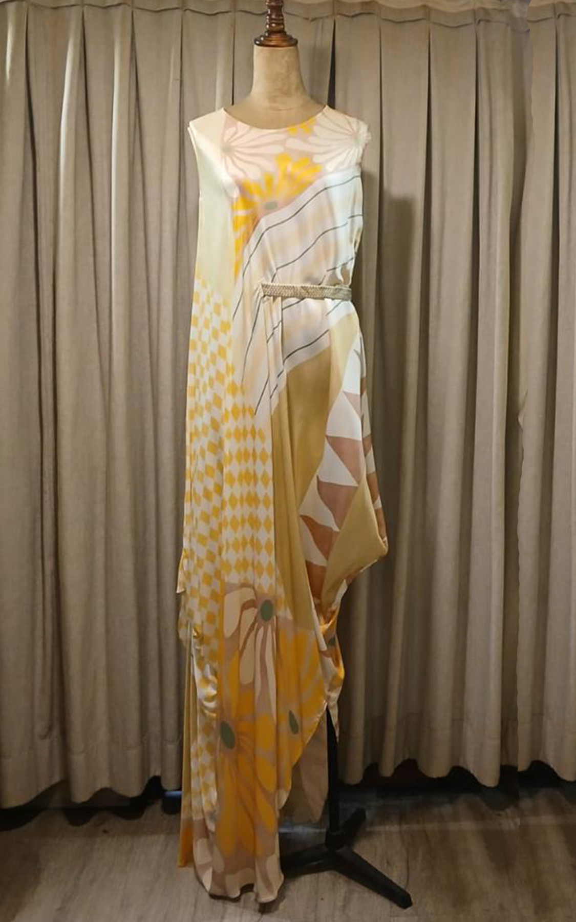 Multicoloured abstract printed asymmetric sleeveless drape. The drape comes with a sequinned belt which is a half belt concept where the belt cinches on one side of the waist. This drape is a flowy style which works very well with all body types.