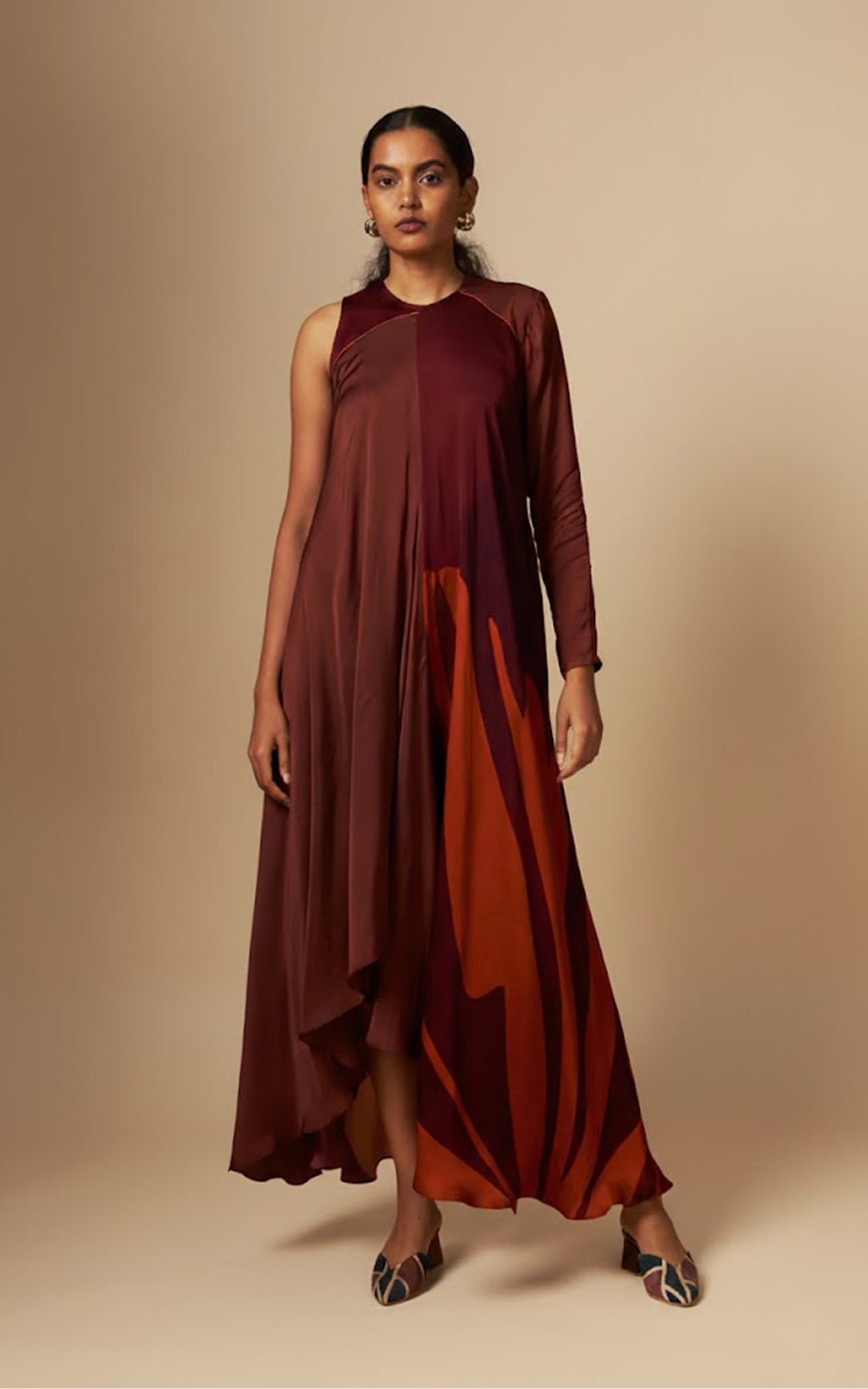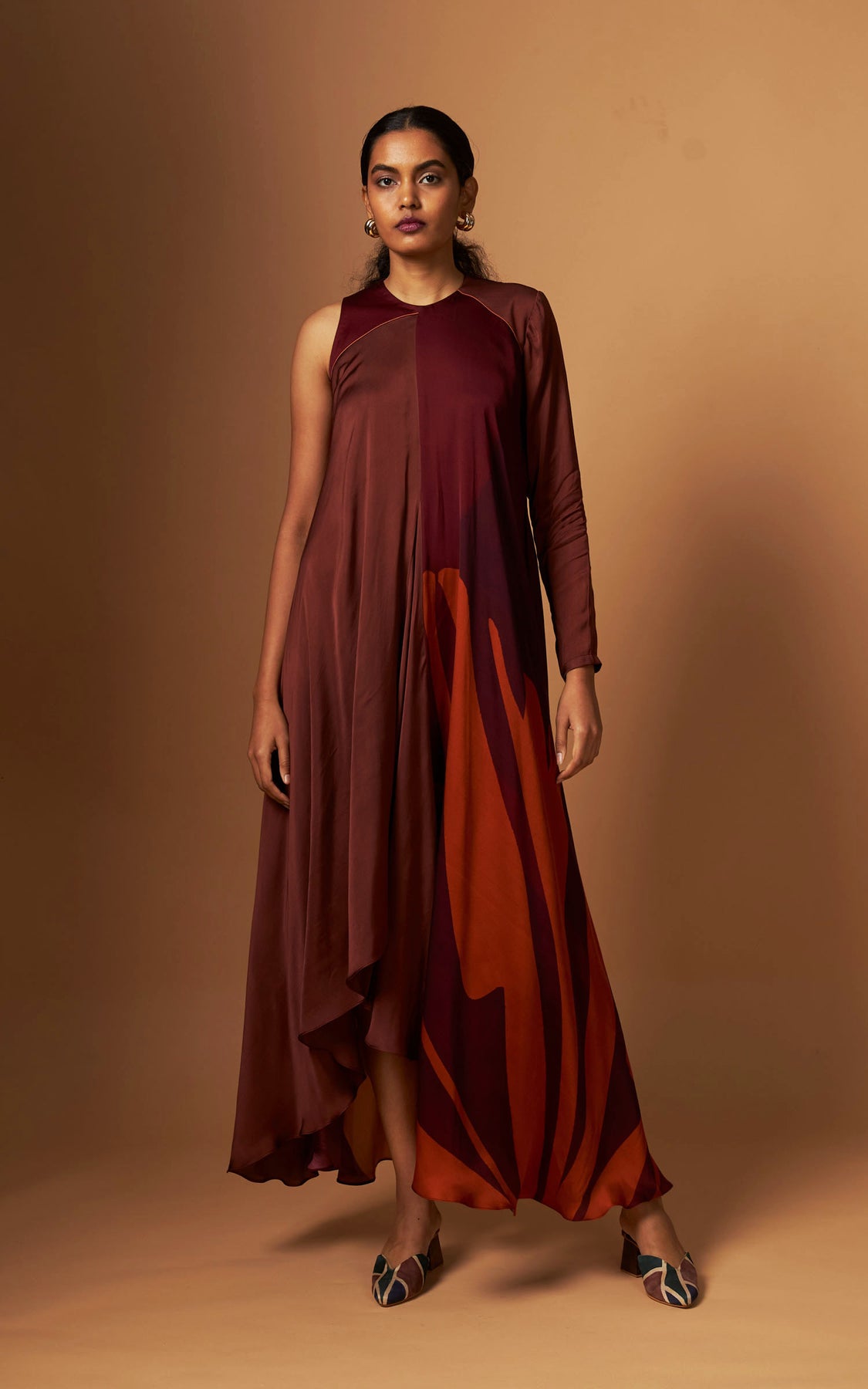 An abstract print incut flowy dress featuring a one-sided sleeve and a statement asymmetric hemline.