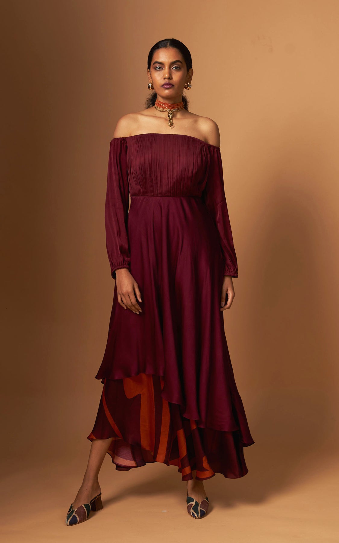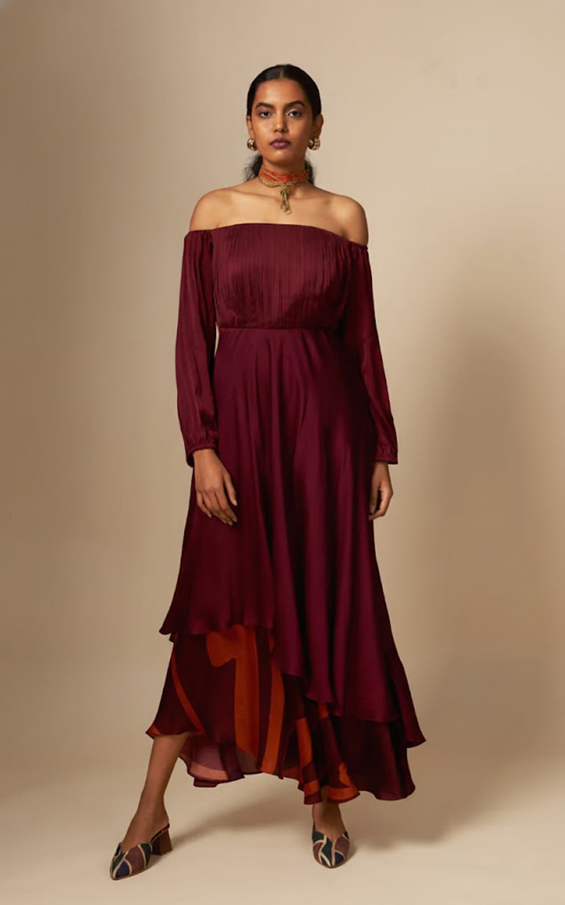 An off-shoulder dress with delicate pleating on the yoke and a fluid asymmetric layered hemline detailed with our abstract print.