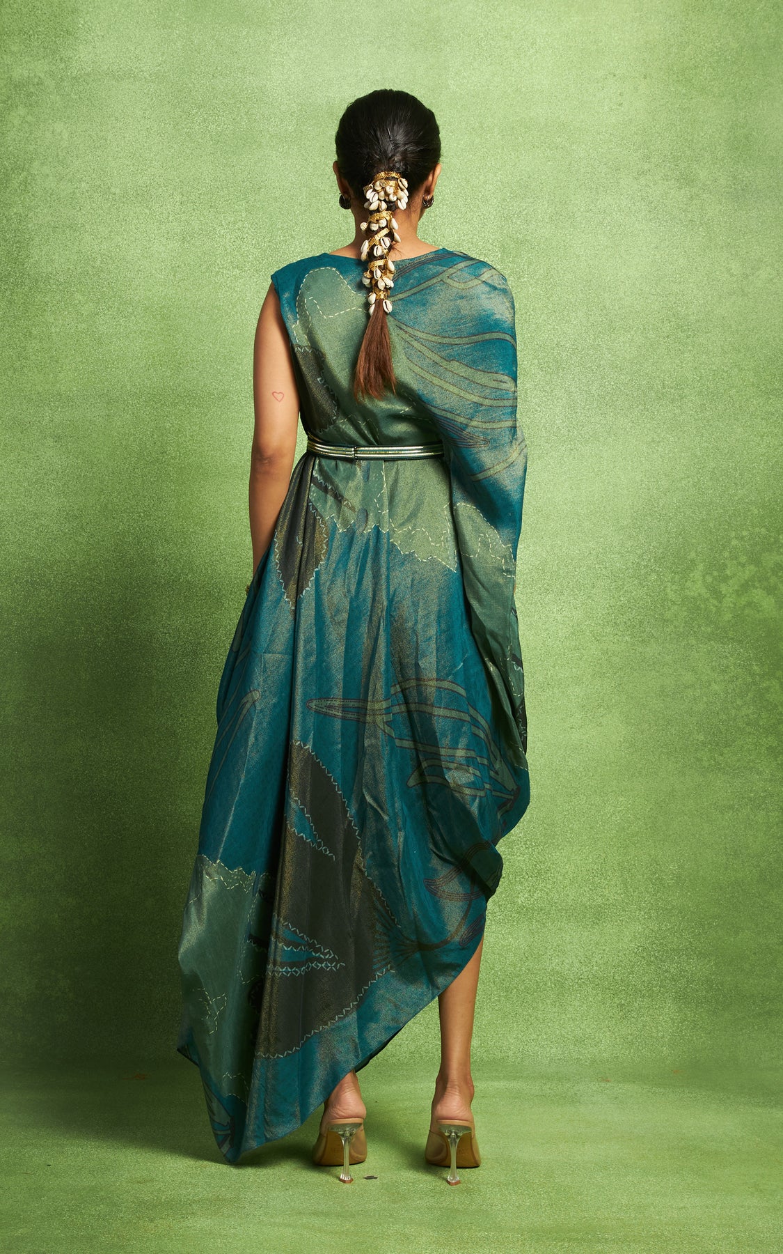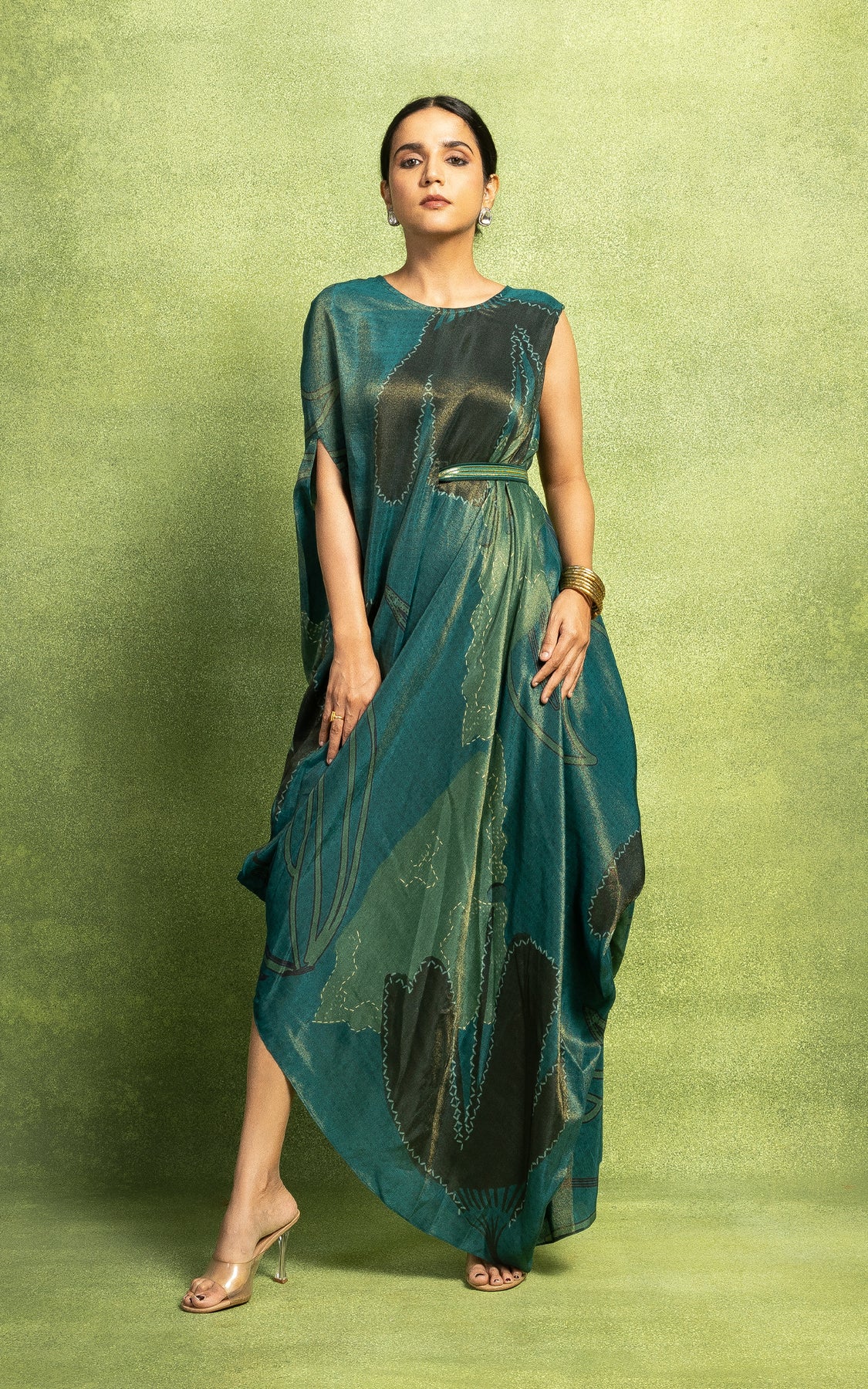 Abstract printed sleeveless drape. It comes along with a sequined belt which cinches on one side of the waist.