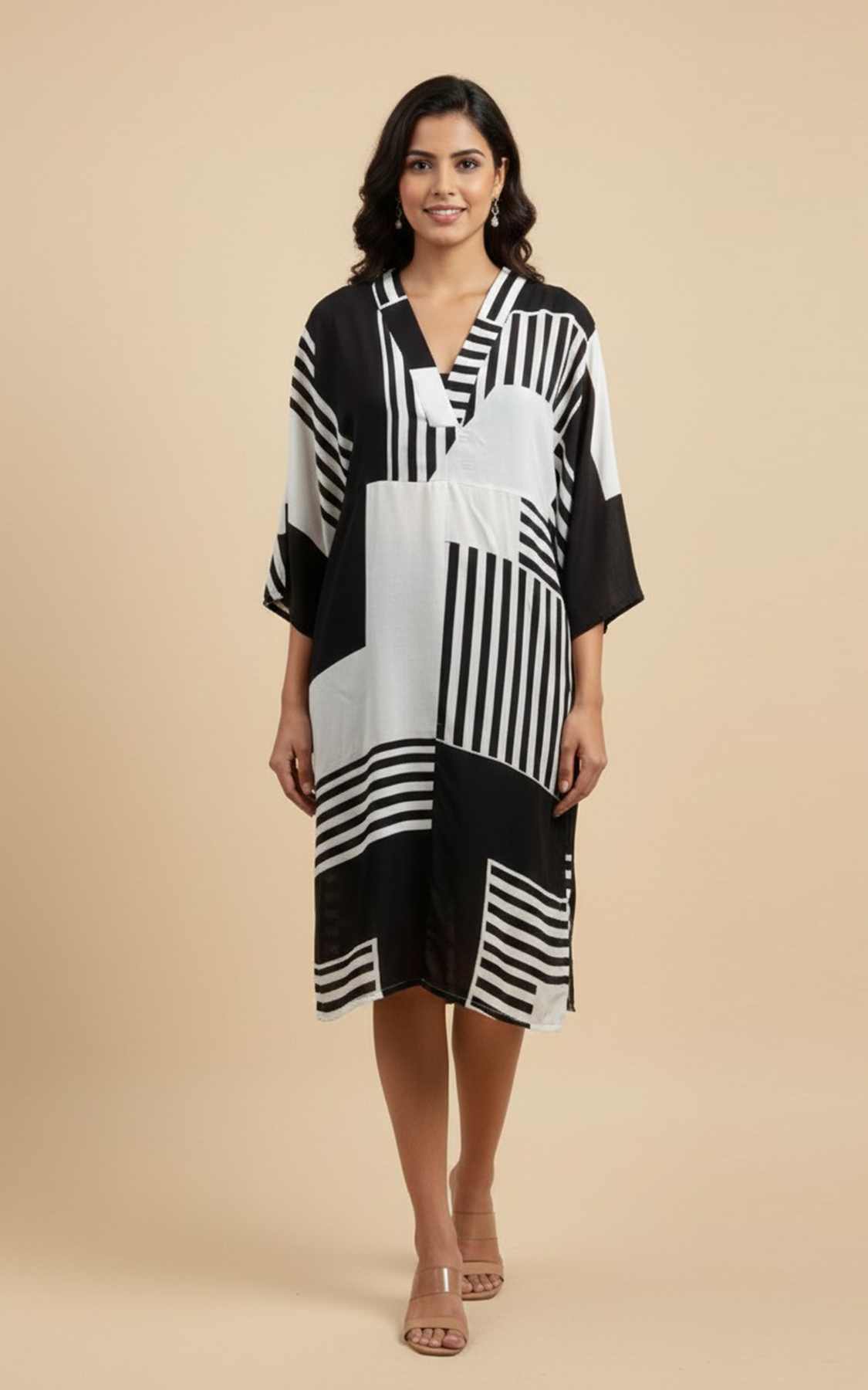 Abstract geometric print midi dress with slit in front.
