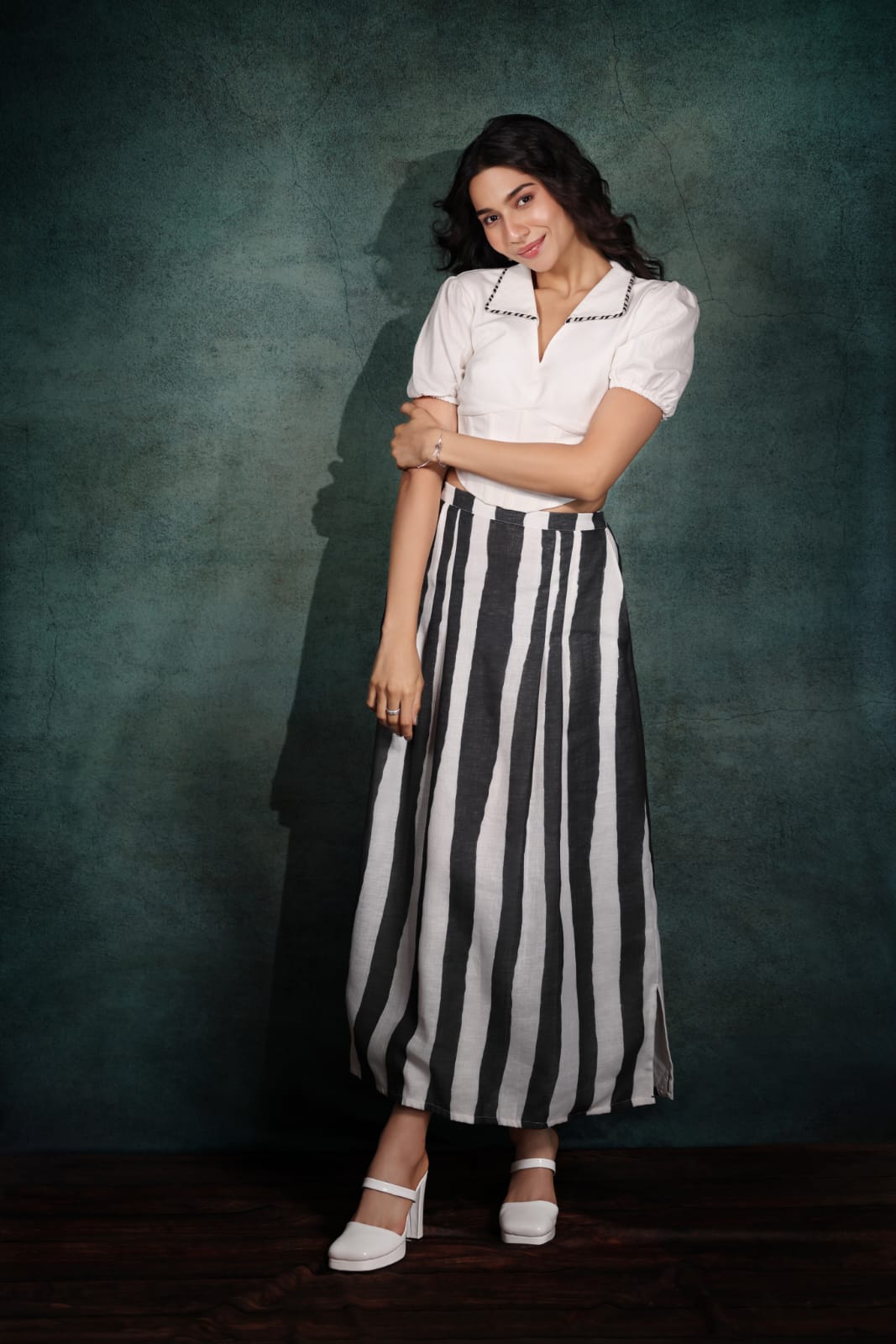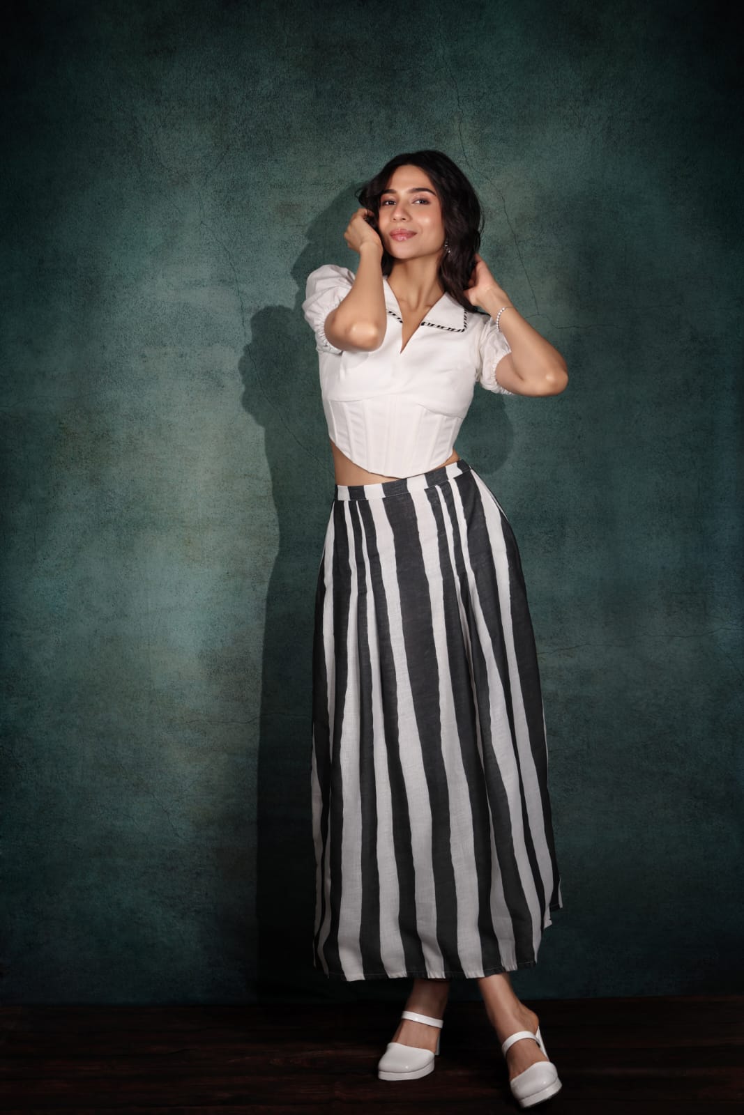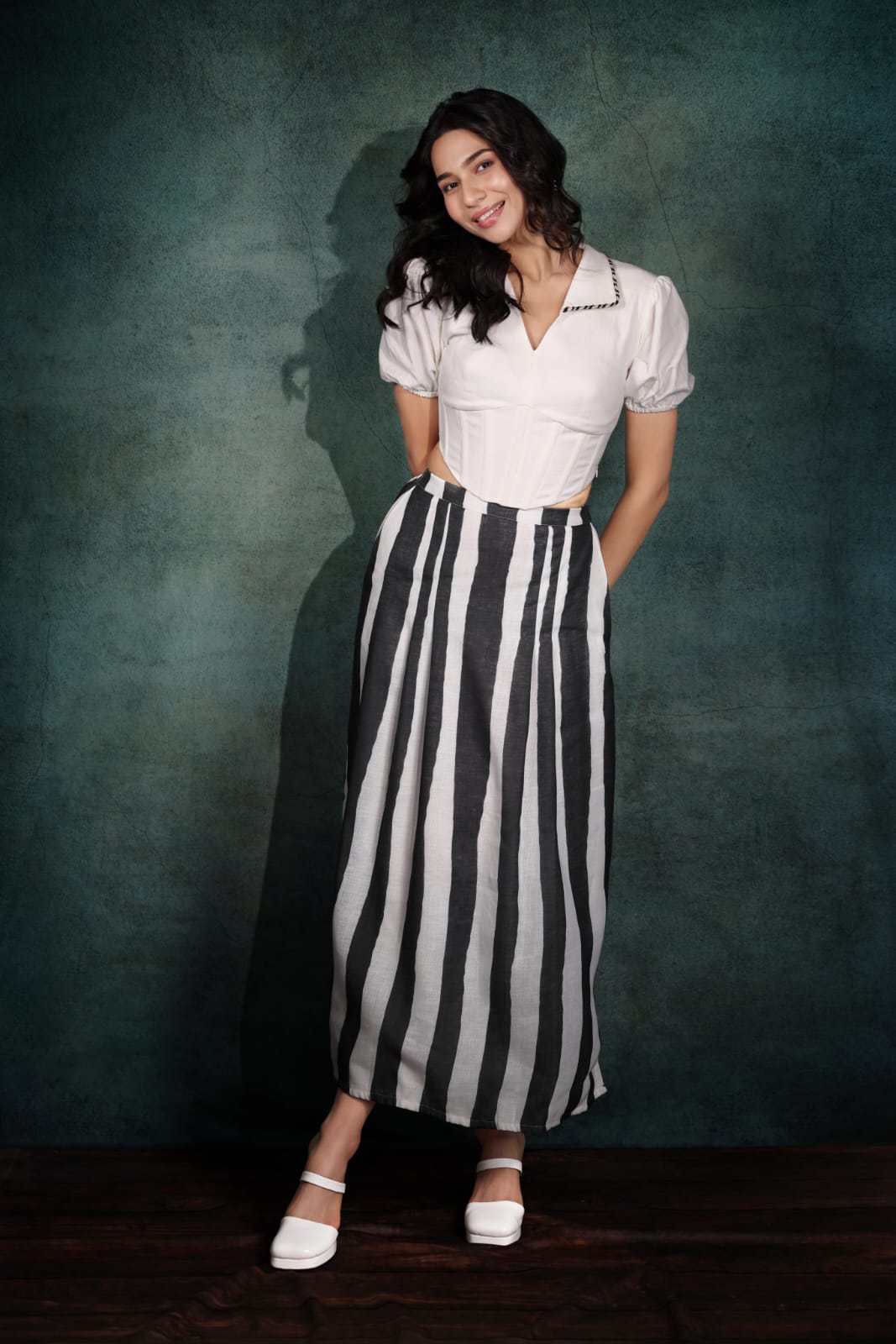 Black & white corset skirt set with back cut out and button detailing. The corset shirt comes with a striped skirt with an elastic at the back of the waist band. The skirt has side pockets.