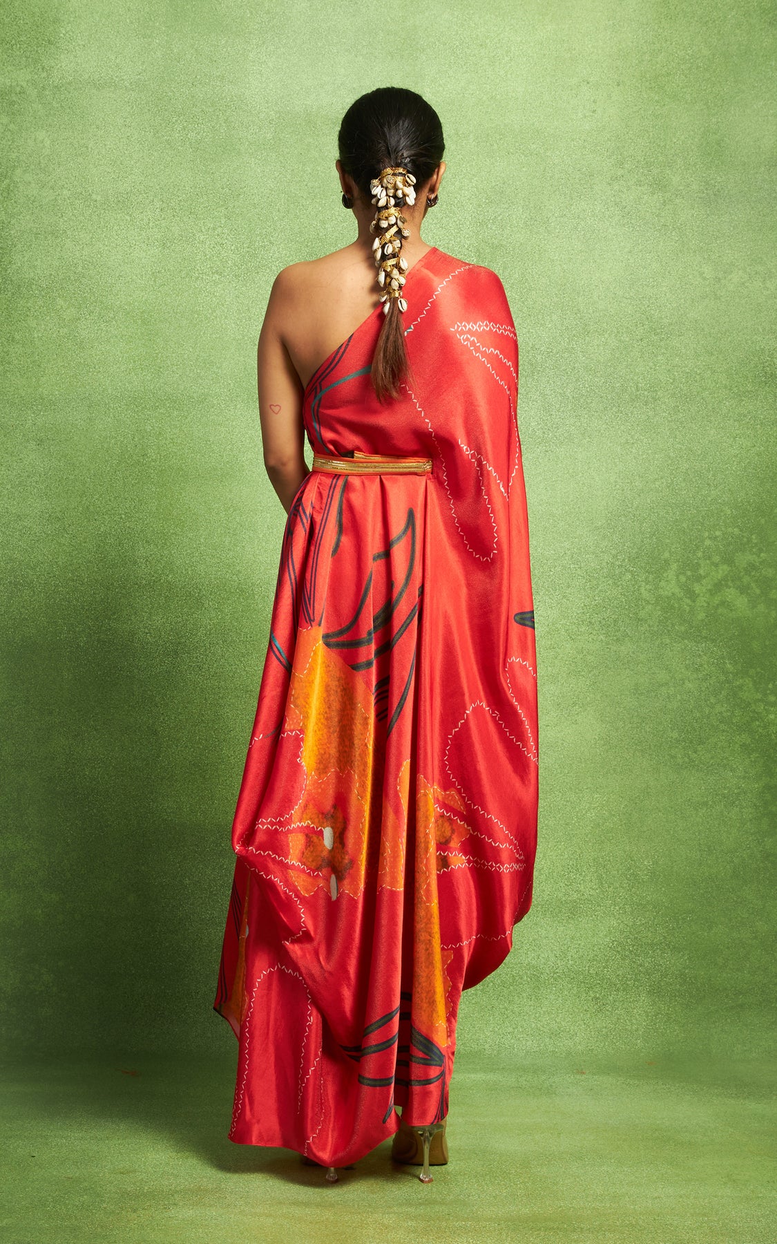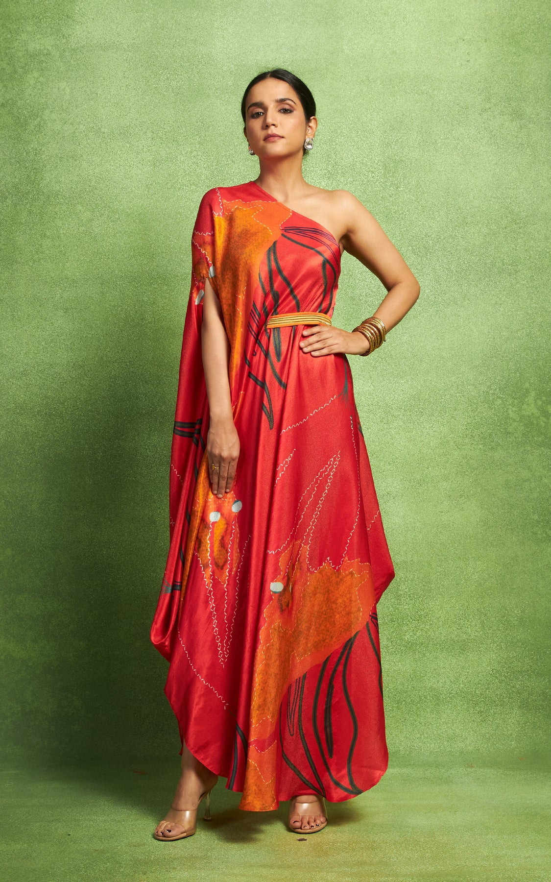 Abstract floral printed one shoulder drape.