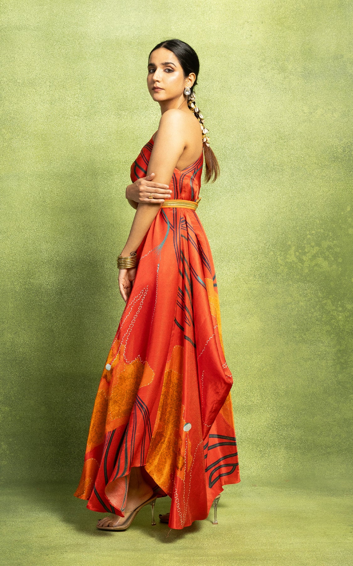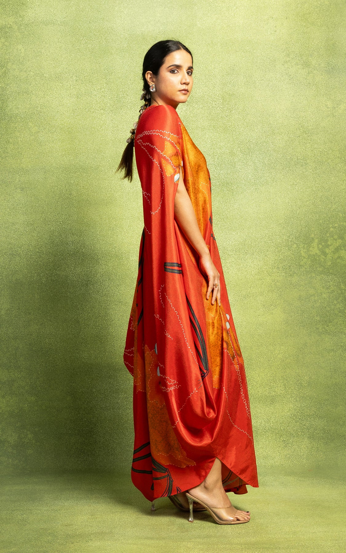 It comes along with a sequined belt which cinches on one side of the waist. This drape is a flowy style which works very well with all body types