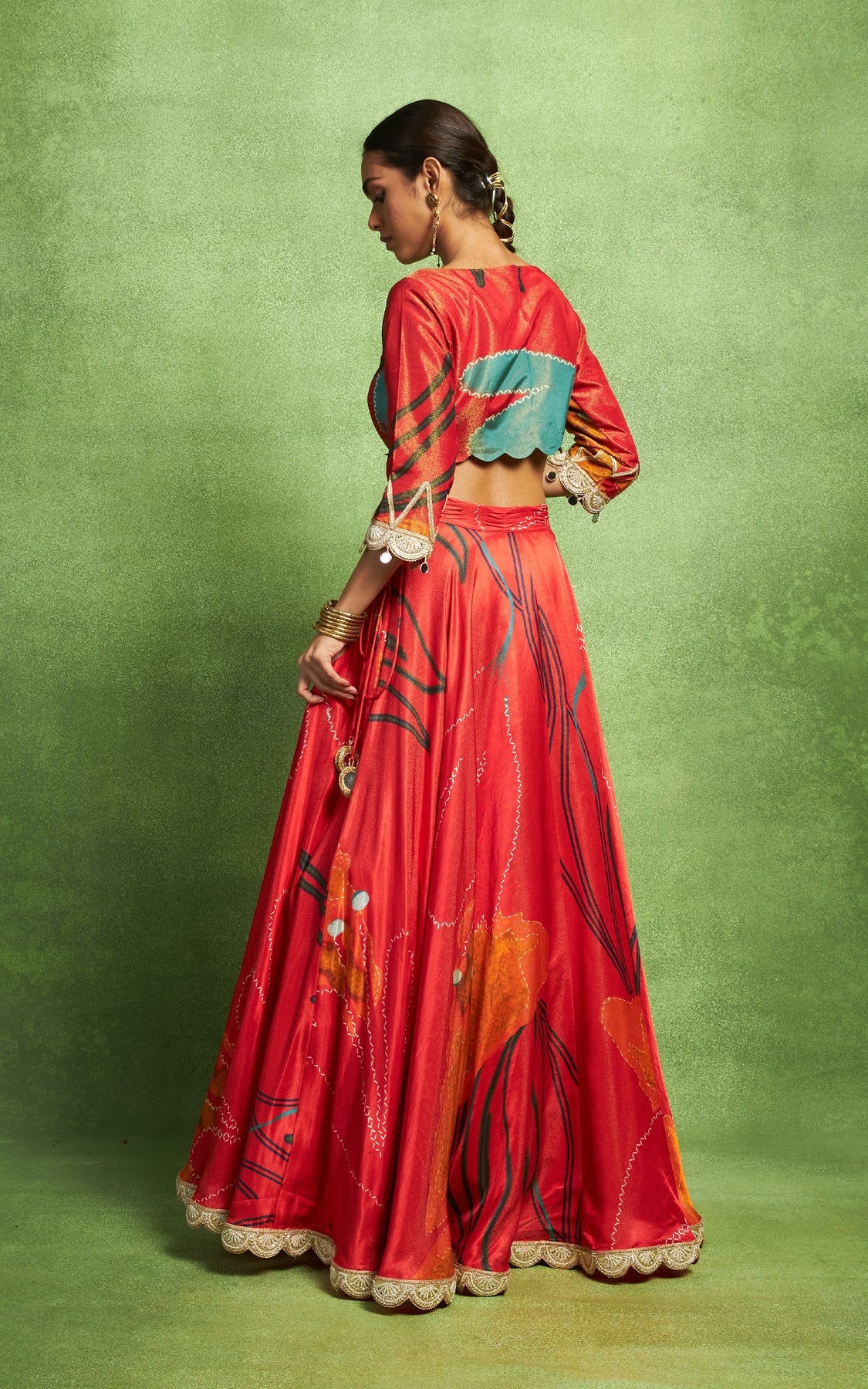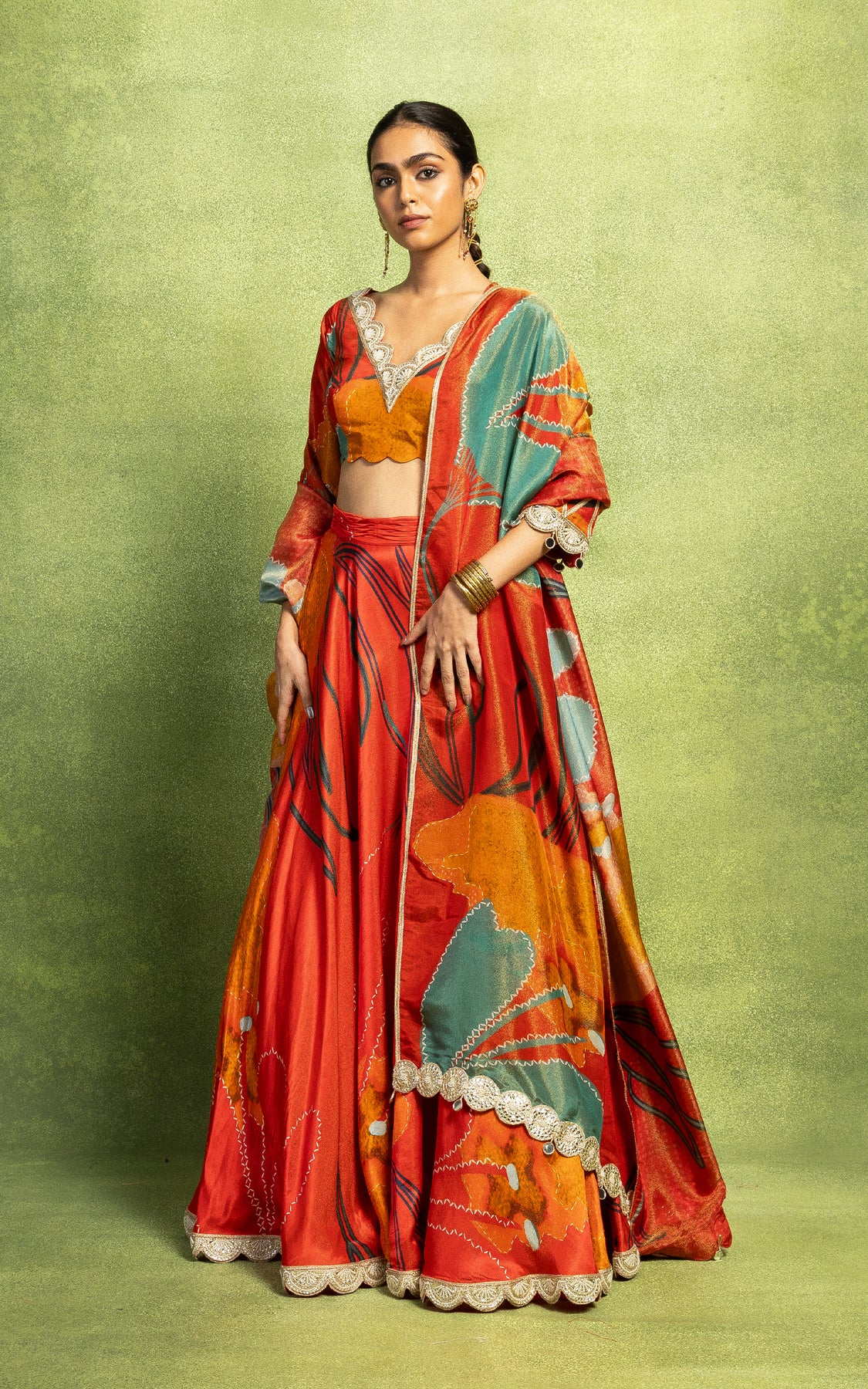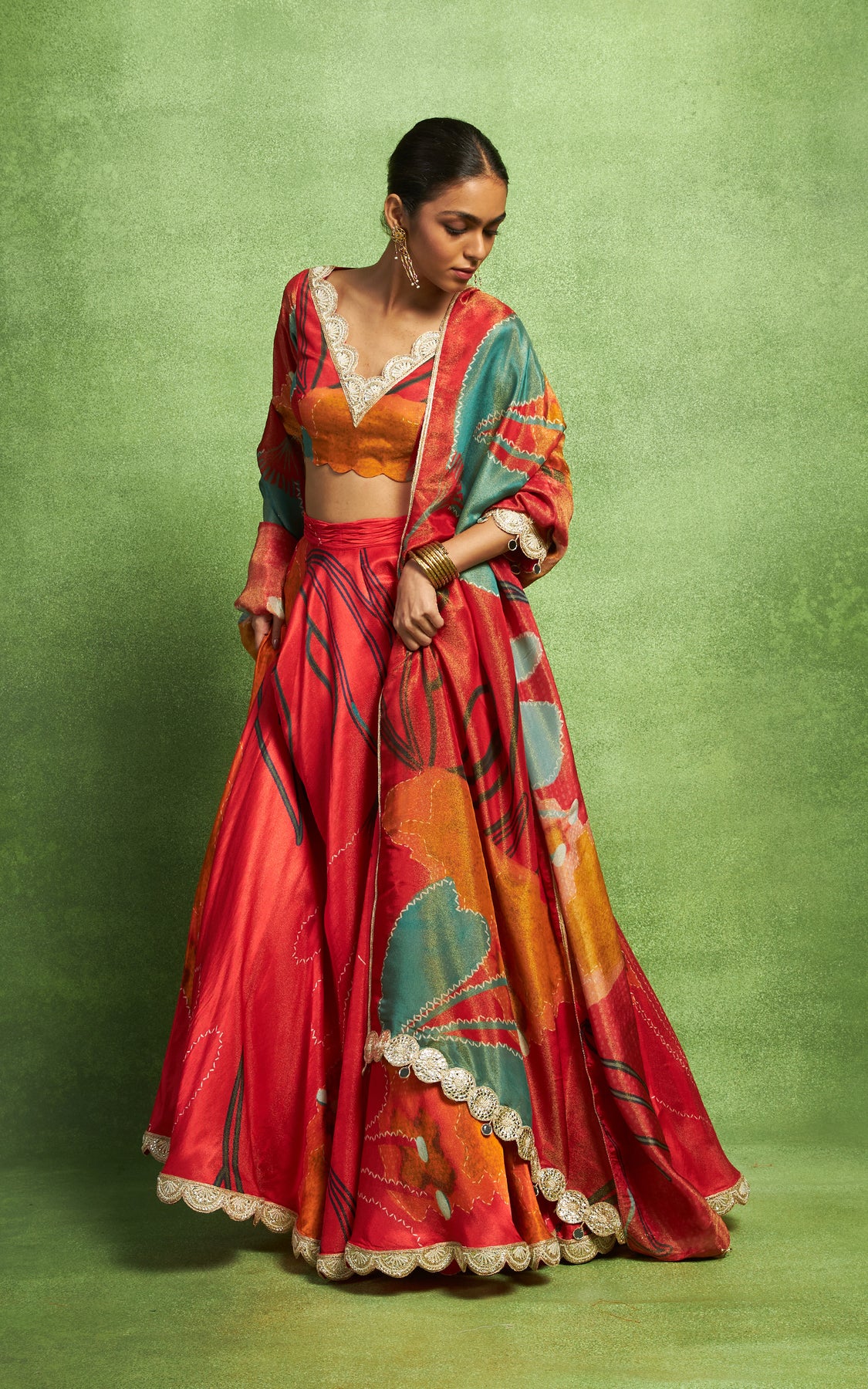 The lehenga comes with a hand embroidered border detail all along the hemline with hand pleated details on the waist band.
