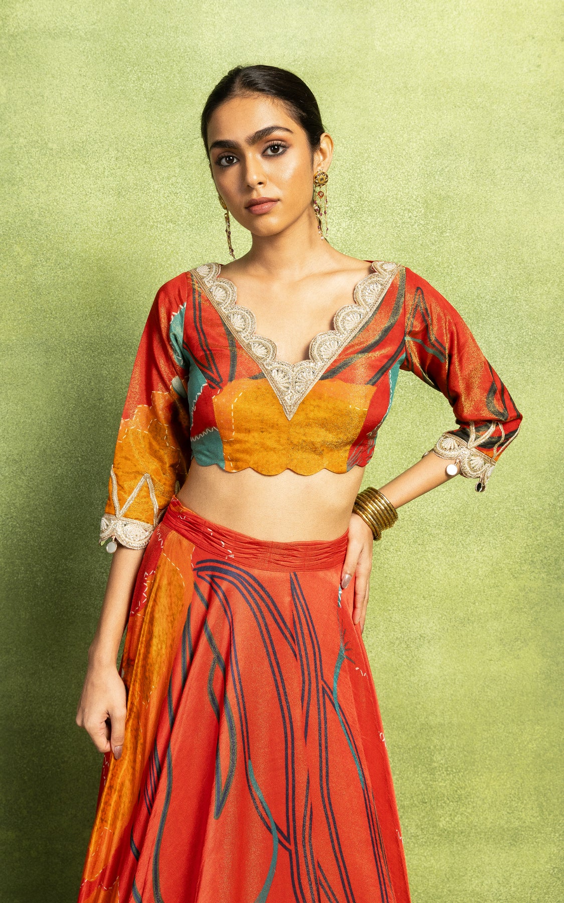 The printed blouse comes with hand embroidery detailing on the neck line and the cuff of the sleeves along with mirror details.
