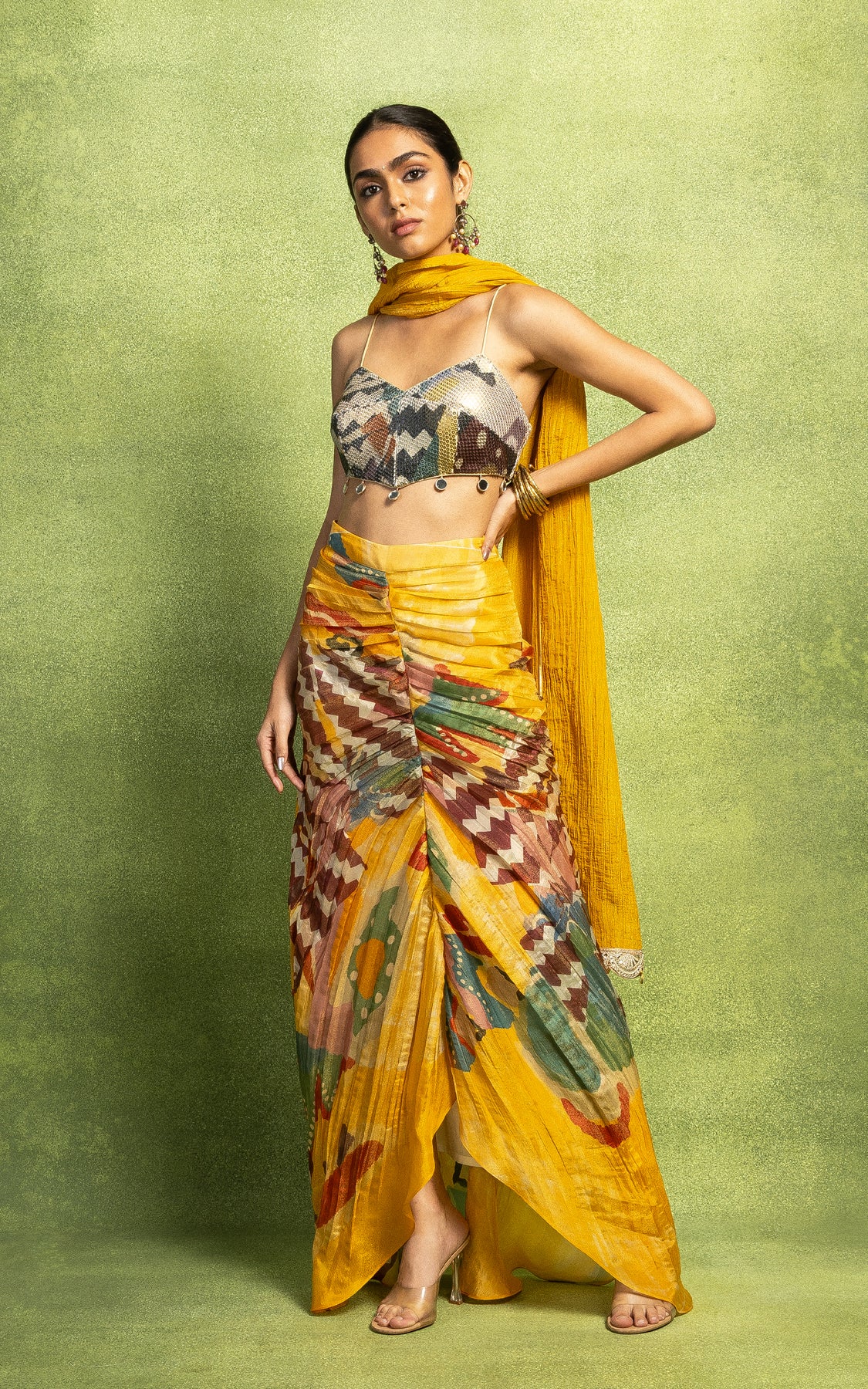 This skirt is paired with a sequin embroidered bustier with mirror detailing and a solid dupatta with a hand embroidered border.