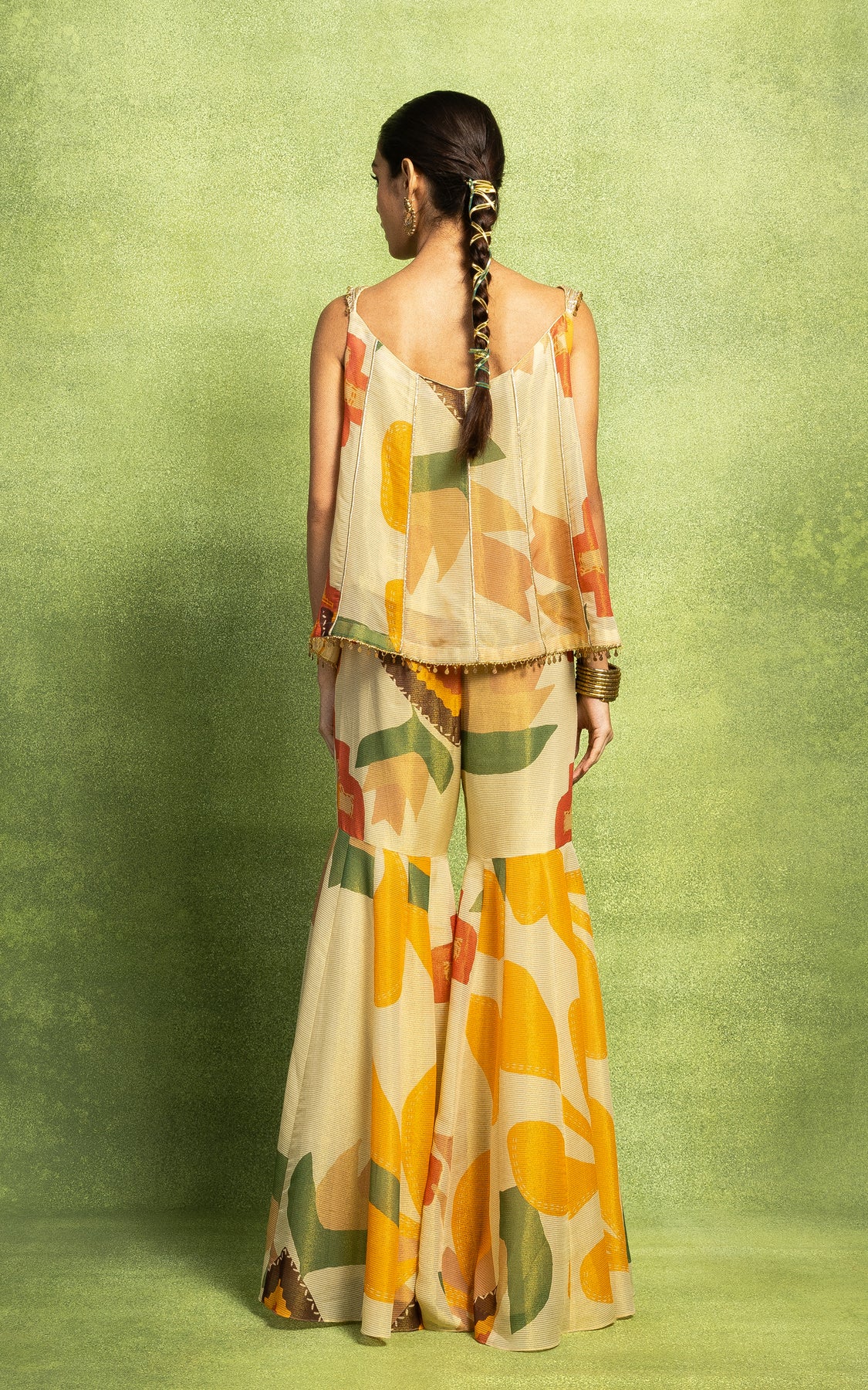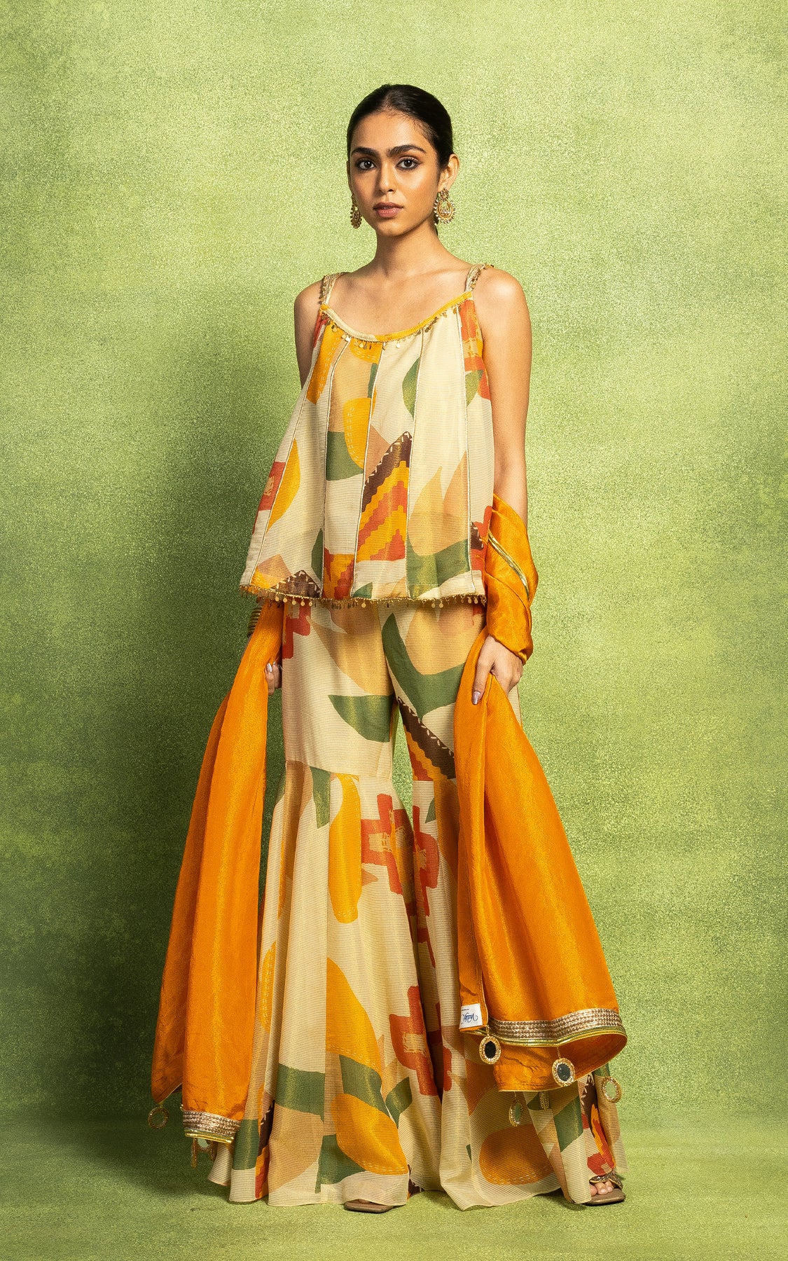 The top is paired with printed sharara pants and a solid dupatta with embroidery border details and mirror hangings.