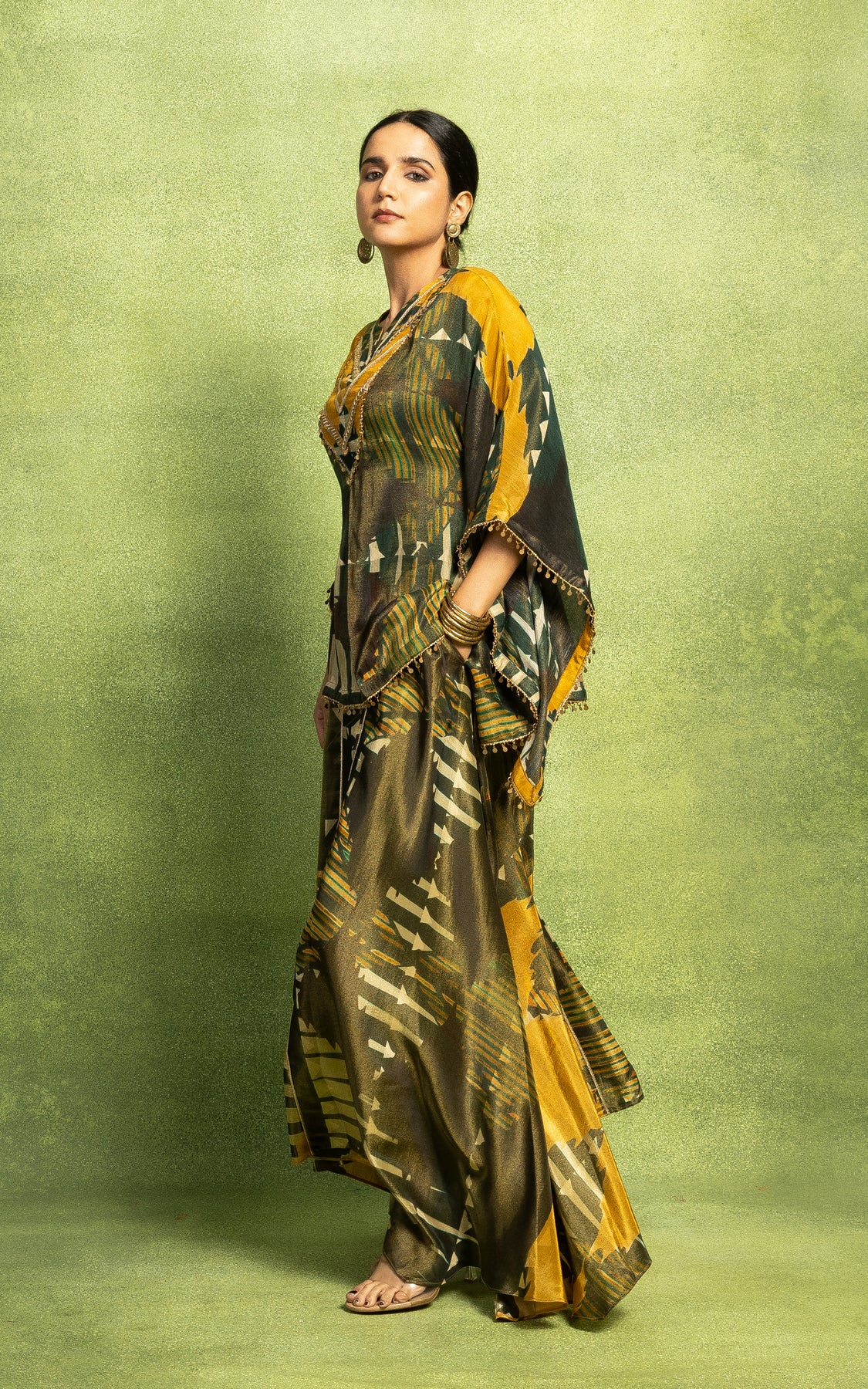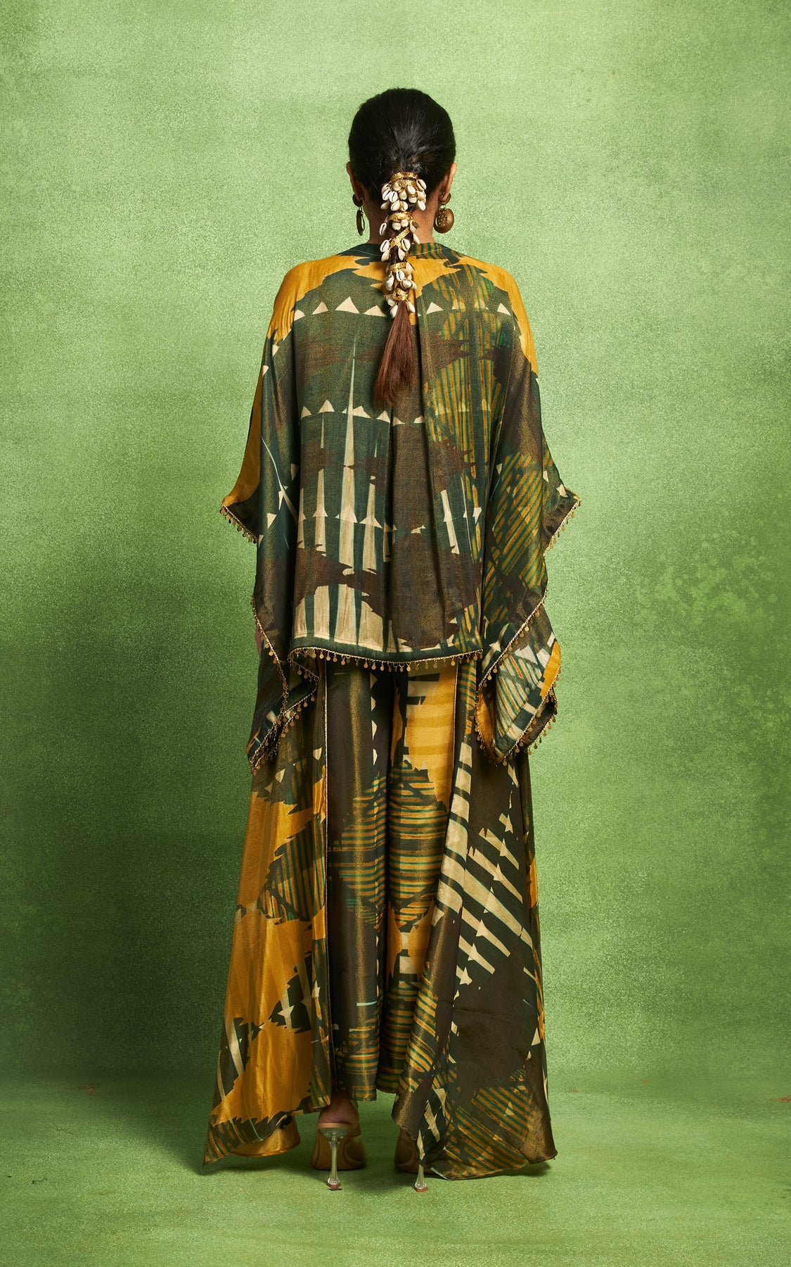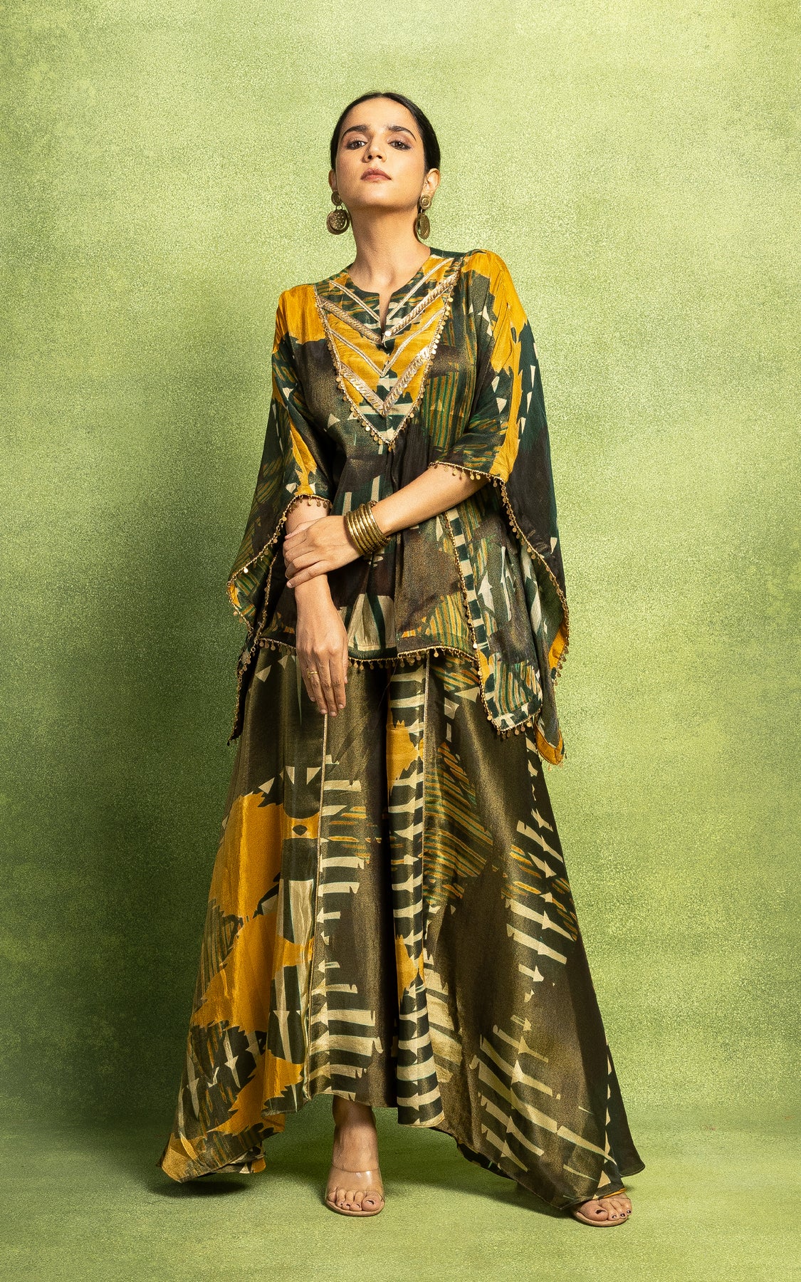 Abstract print short kurta with detailing around the neck line and sleeves. This kurta is paired with asymmetric flared pants.