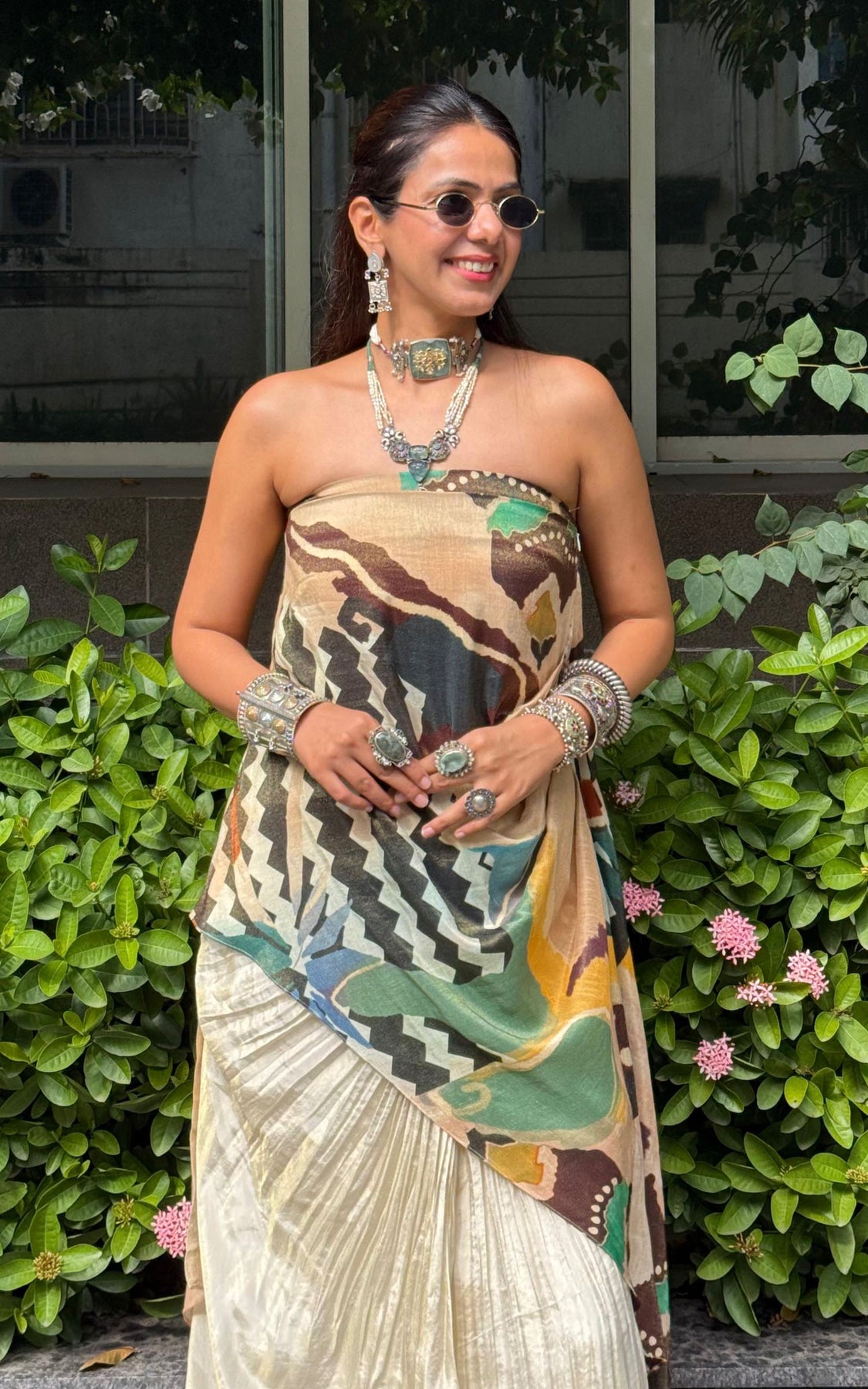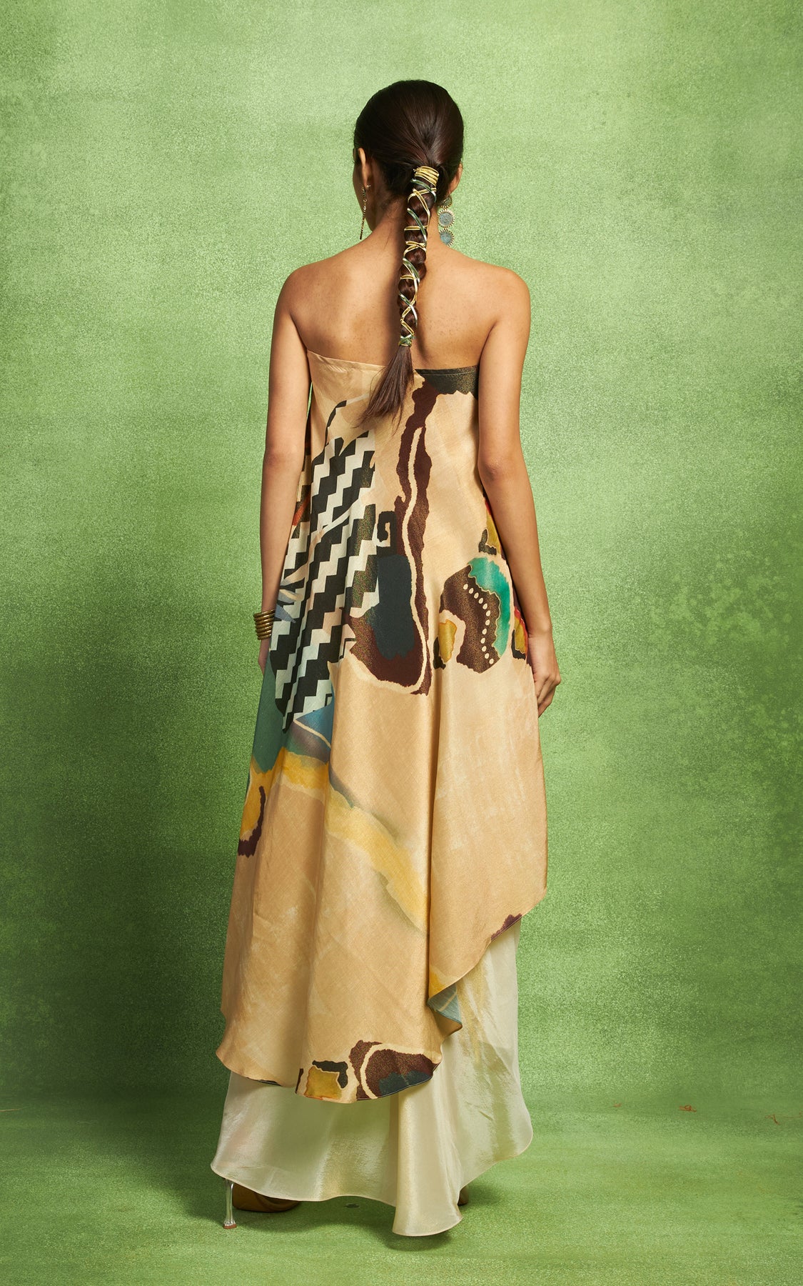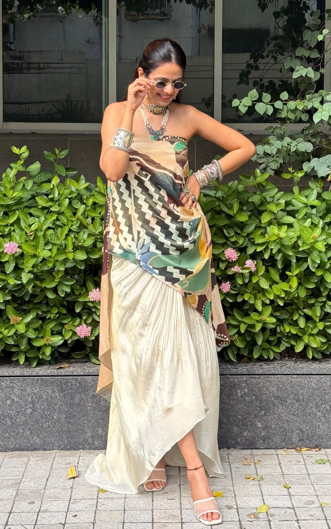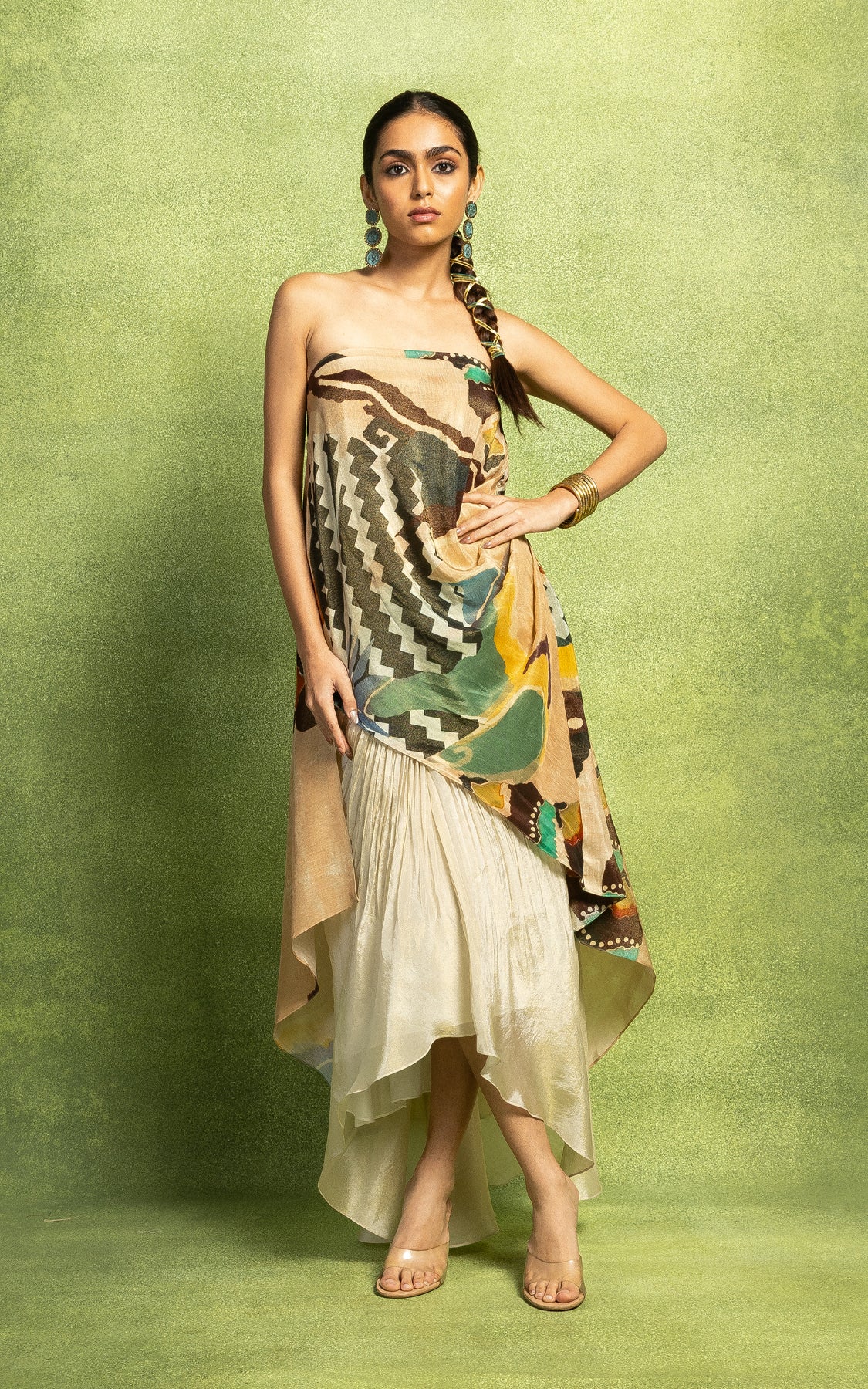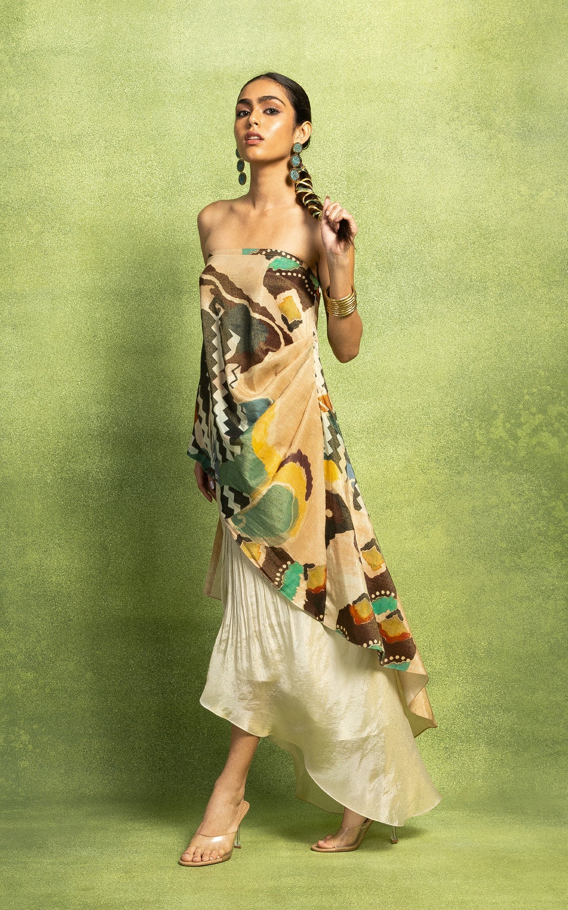 Abstract print draped top with an off shoulder style. The top is paired with a hand pleated skirt.