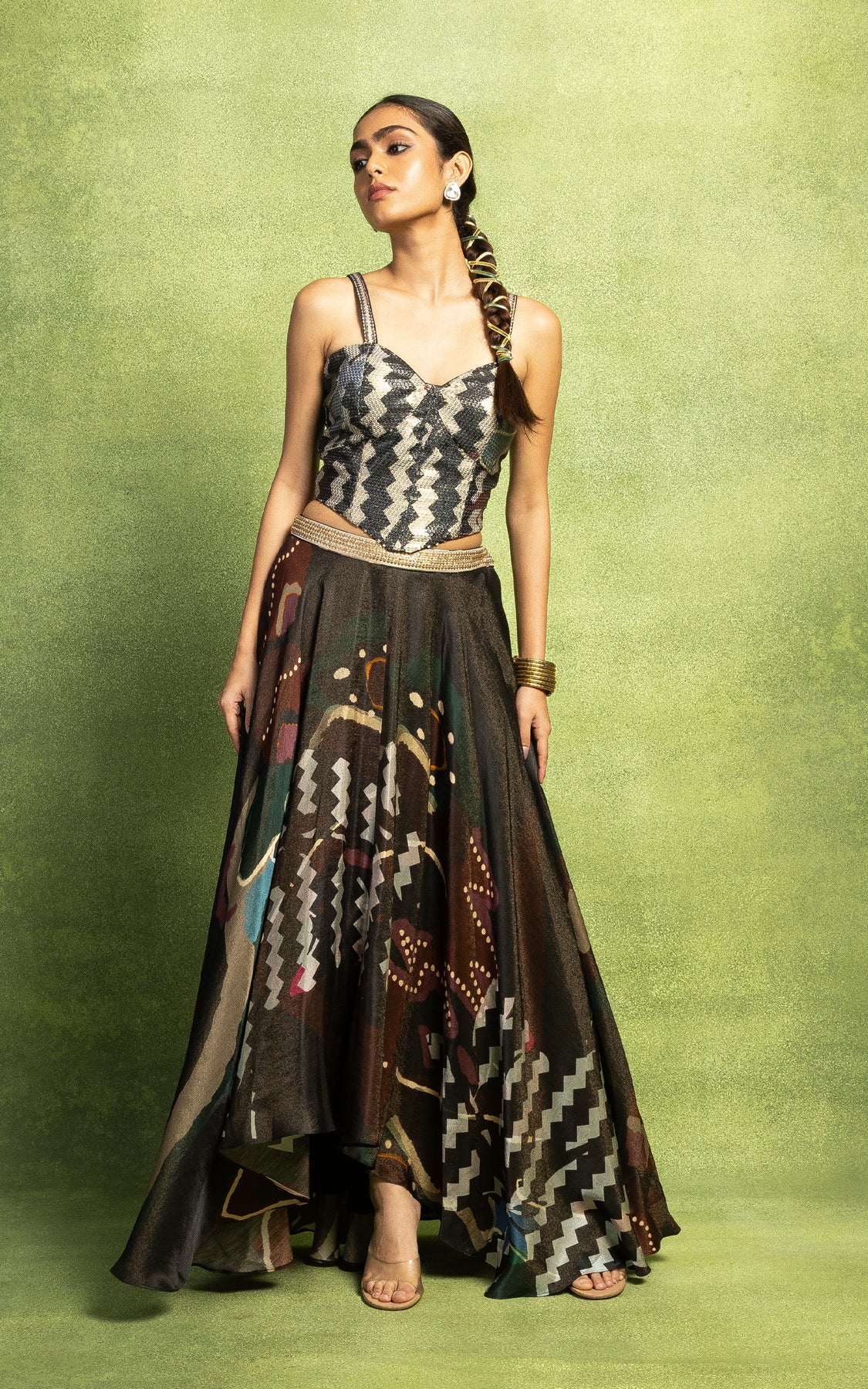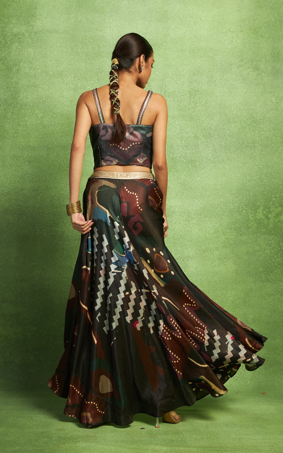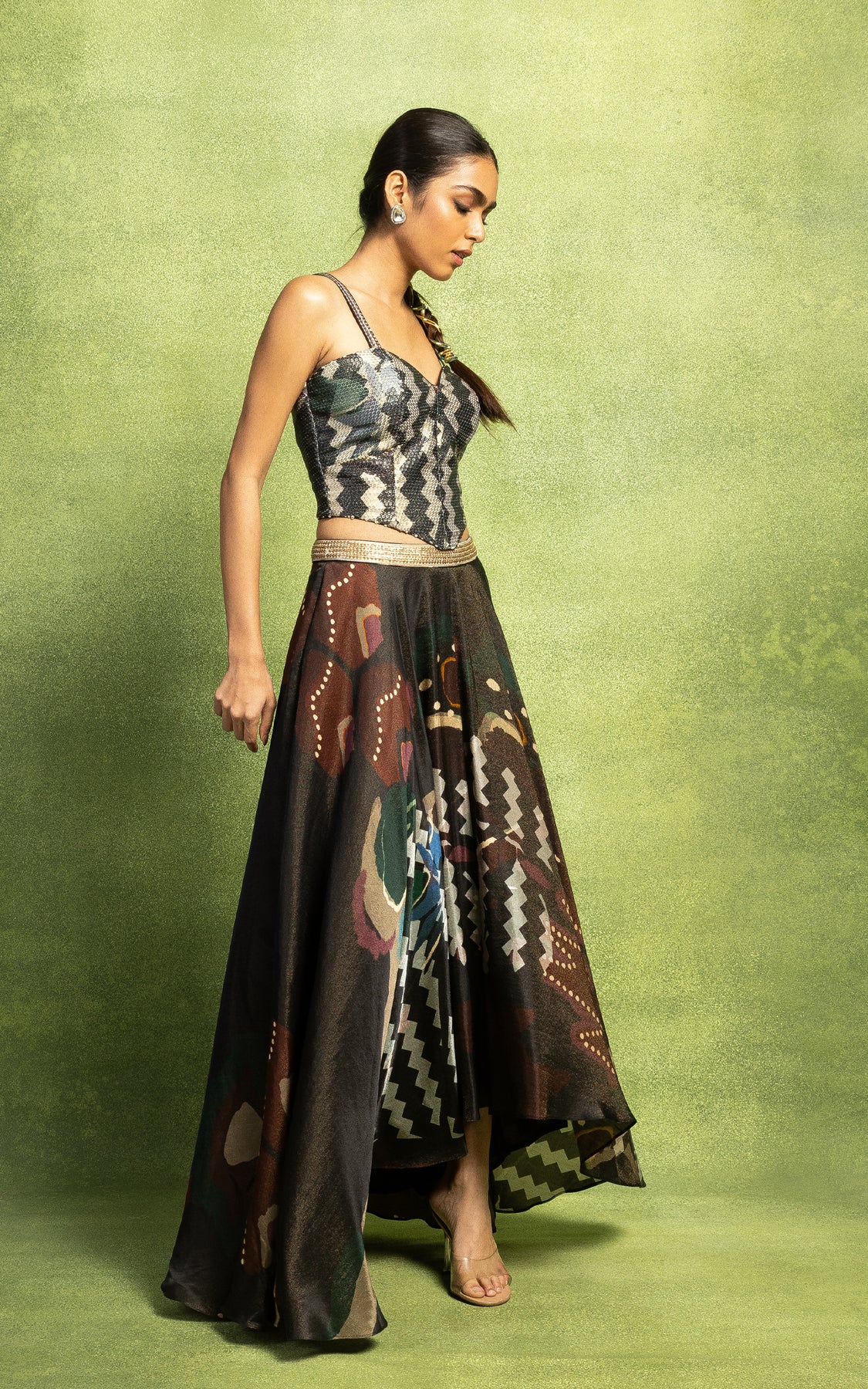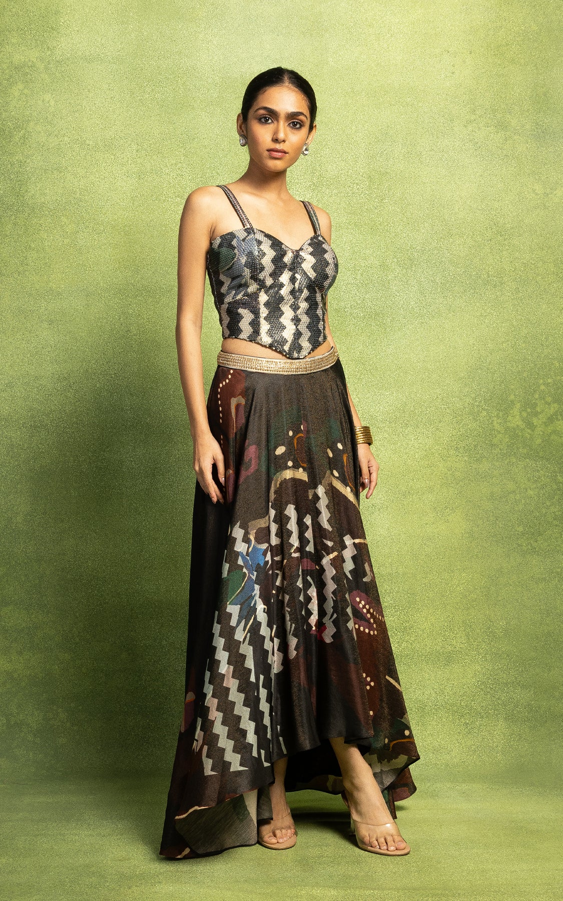 This top is paired with an abstract printed asymmetric skirt with hand embroidery detailing on the waist and pockets on both sides.