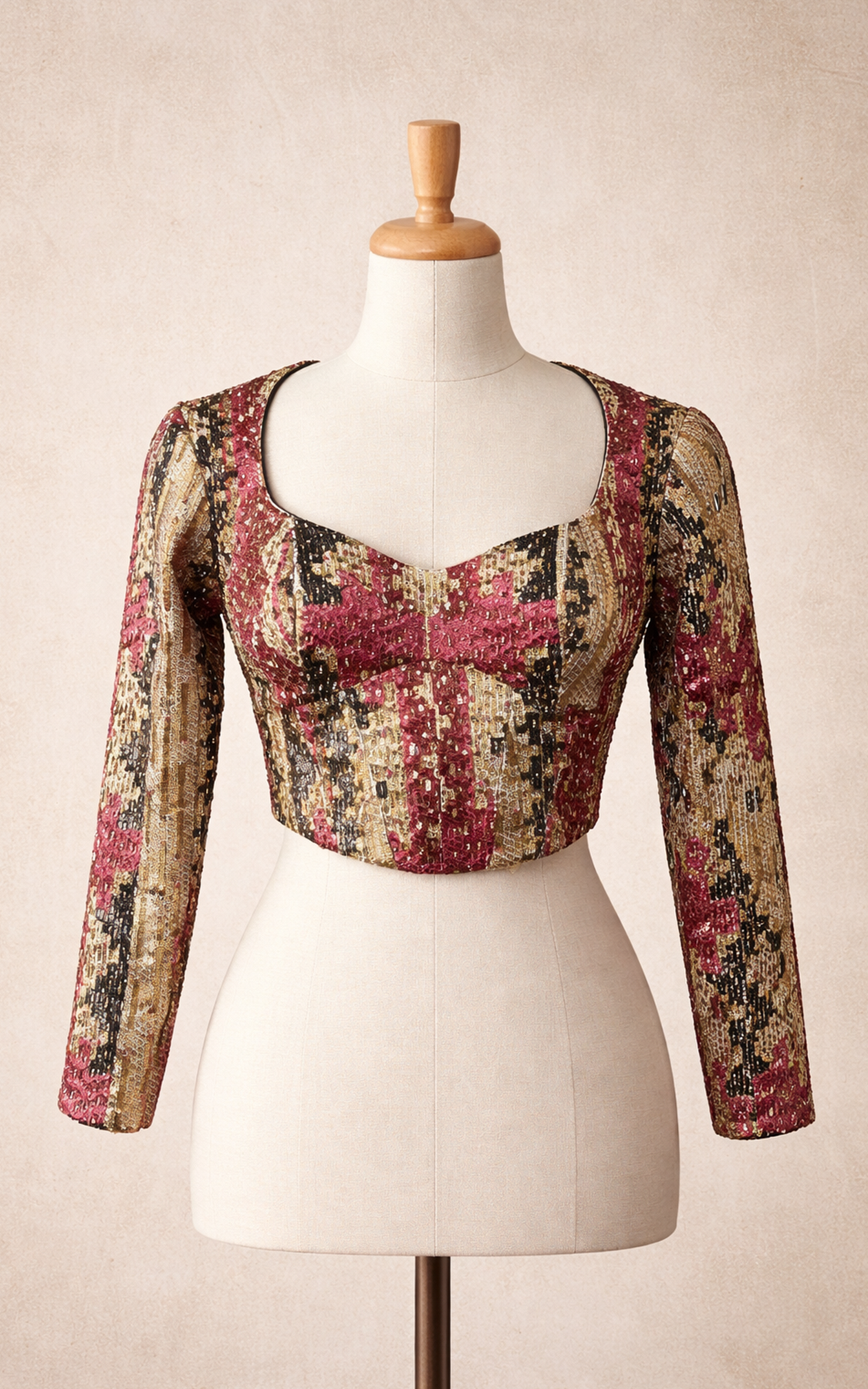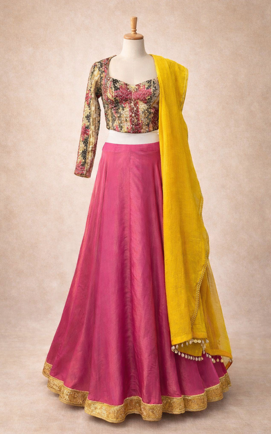 This lehenga set comes with a corset style printed blouse with hand embroidery on it.