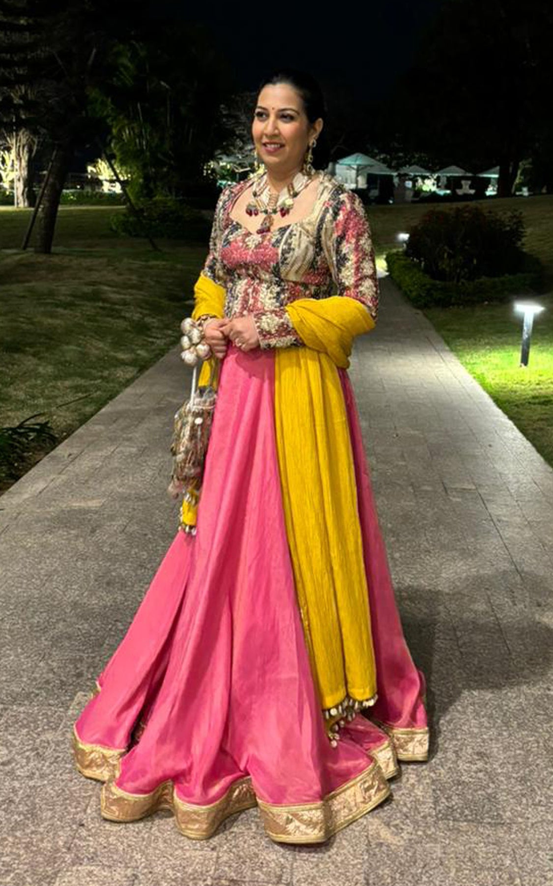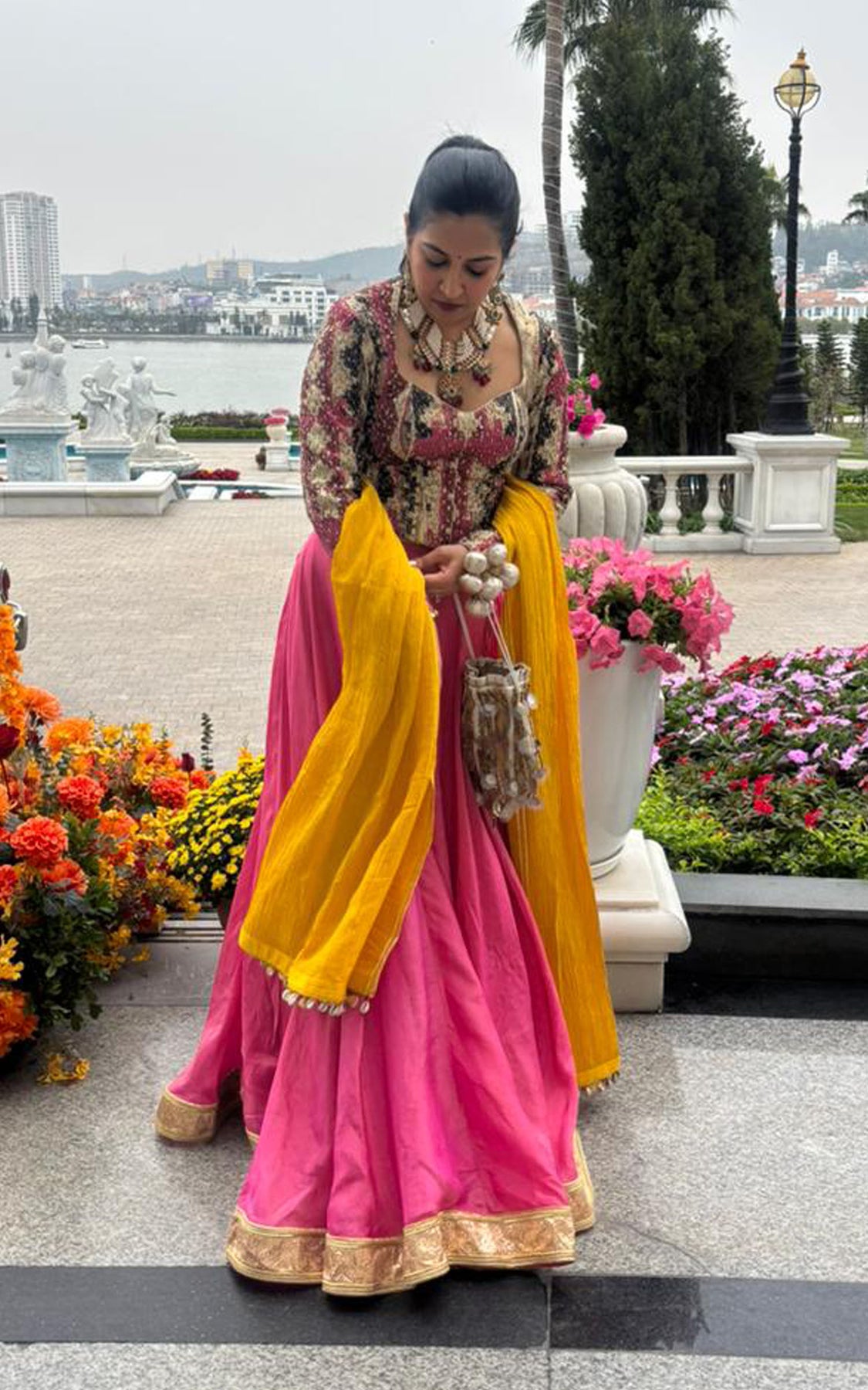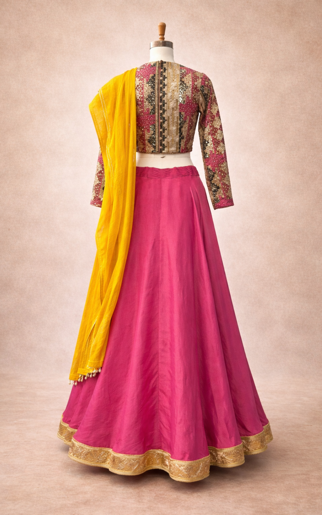 The lehenga comes with a hand pleated detailing on the waist band and zari border on the hemline. The yellow solid dupatta comes with border detailing and shell hangings to enhance the look.