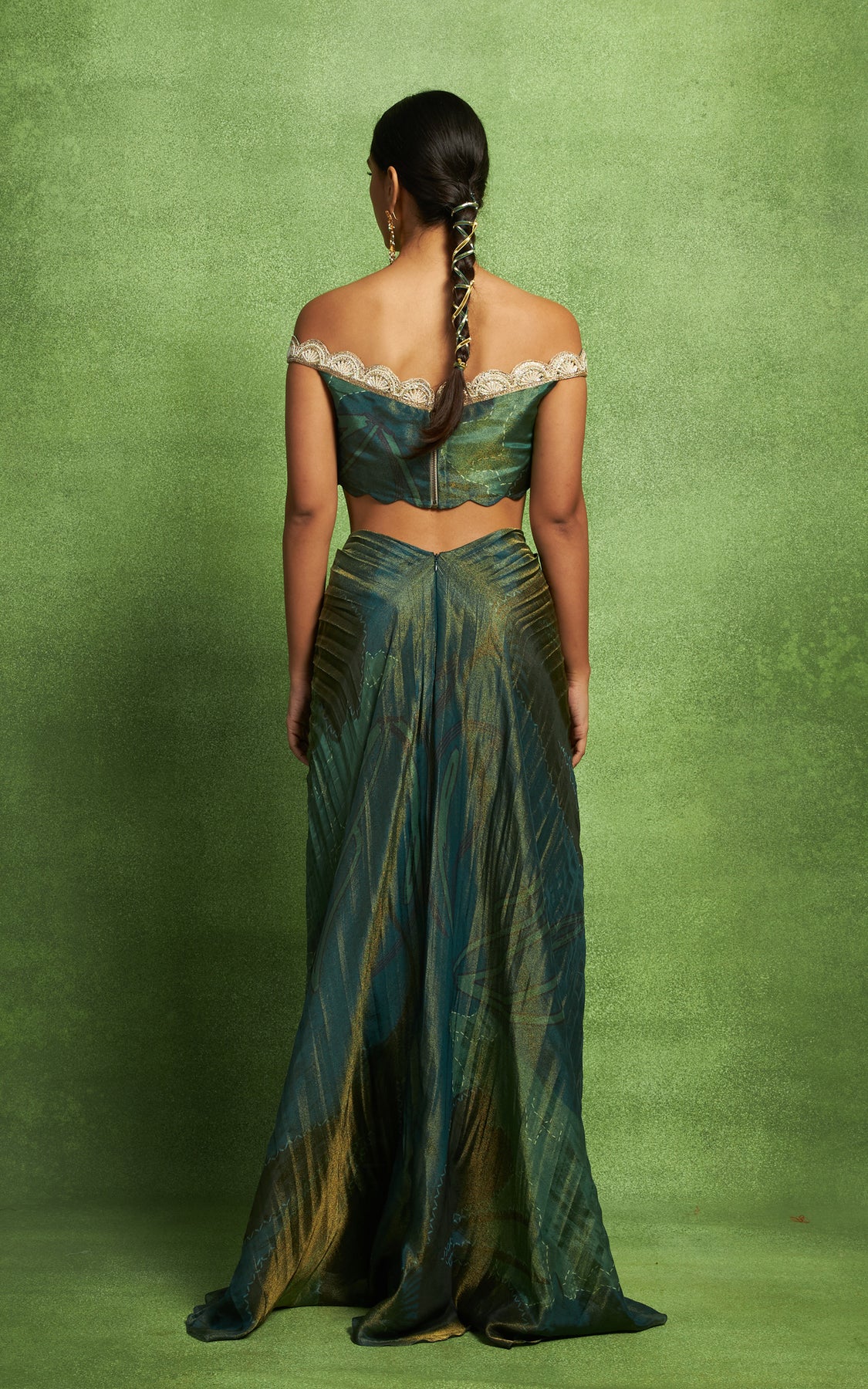The bustier comes with hand embroidery detailing on the off shoulder neckline and is paired with a hand pleated skirt.