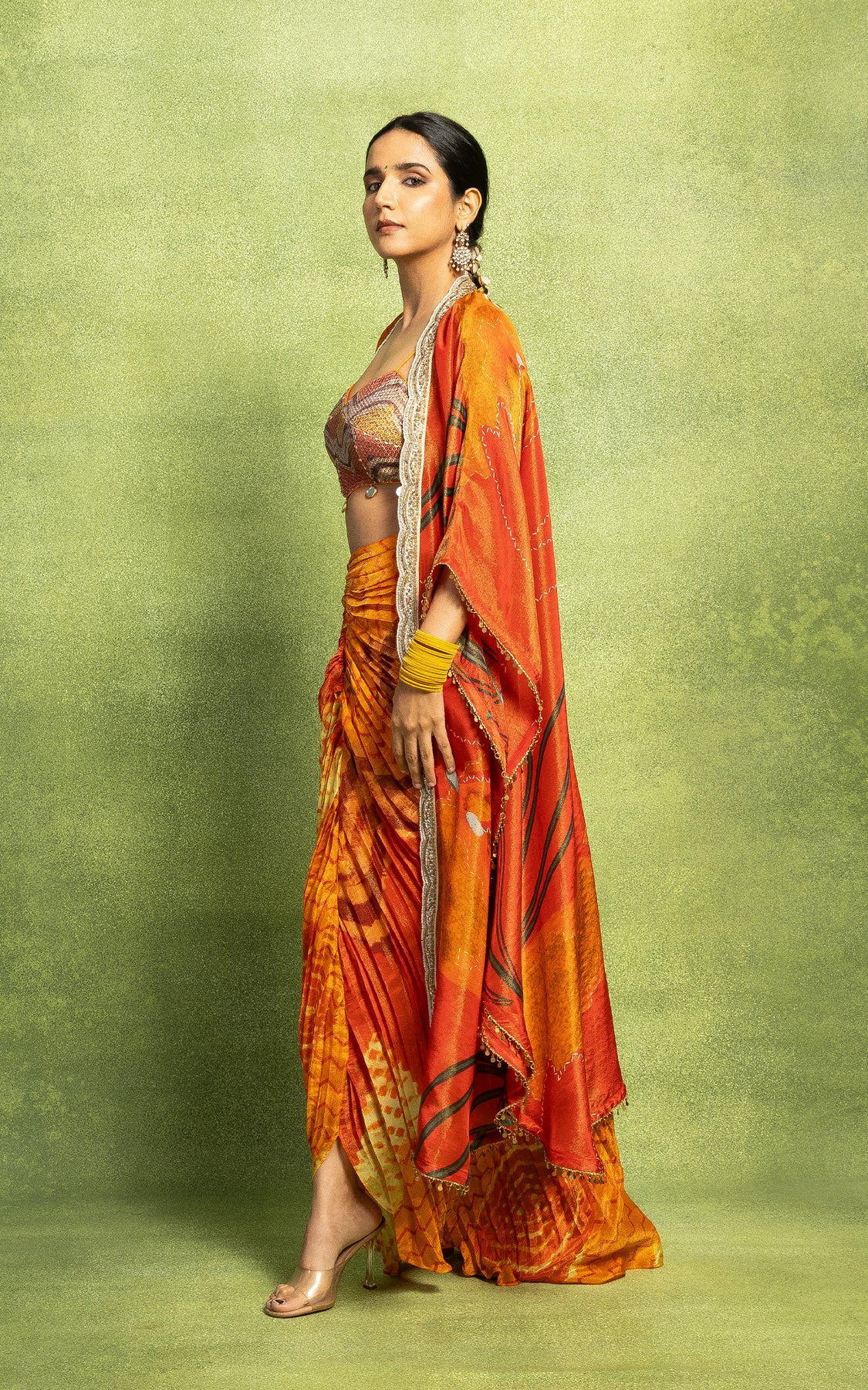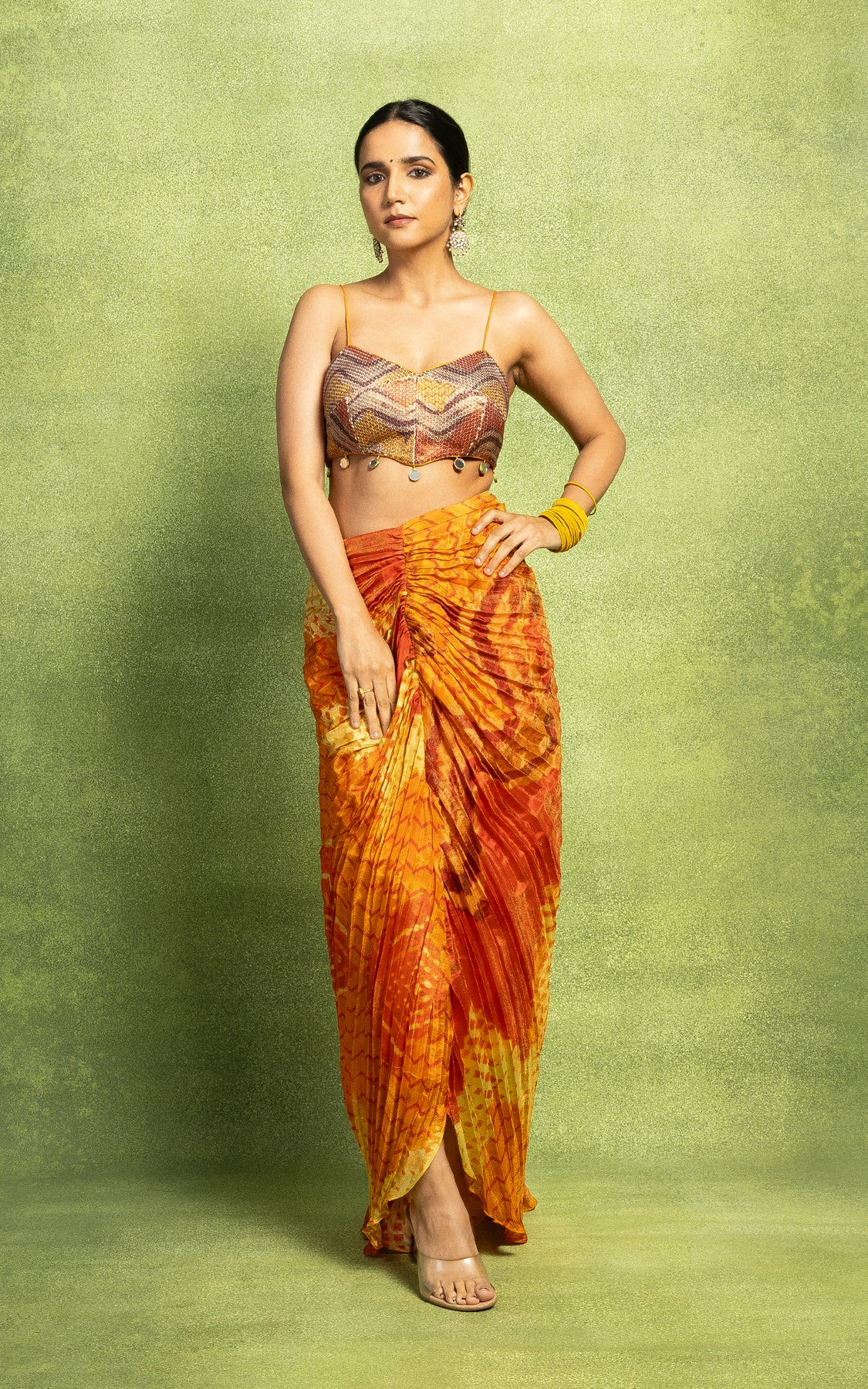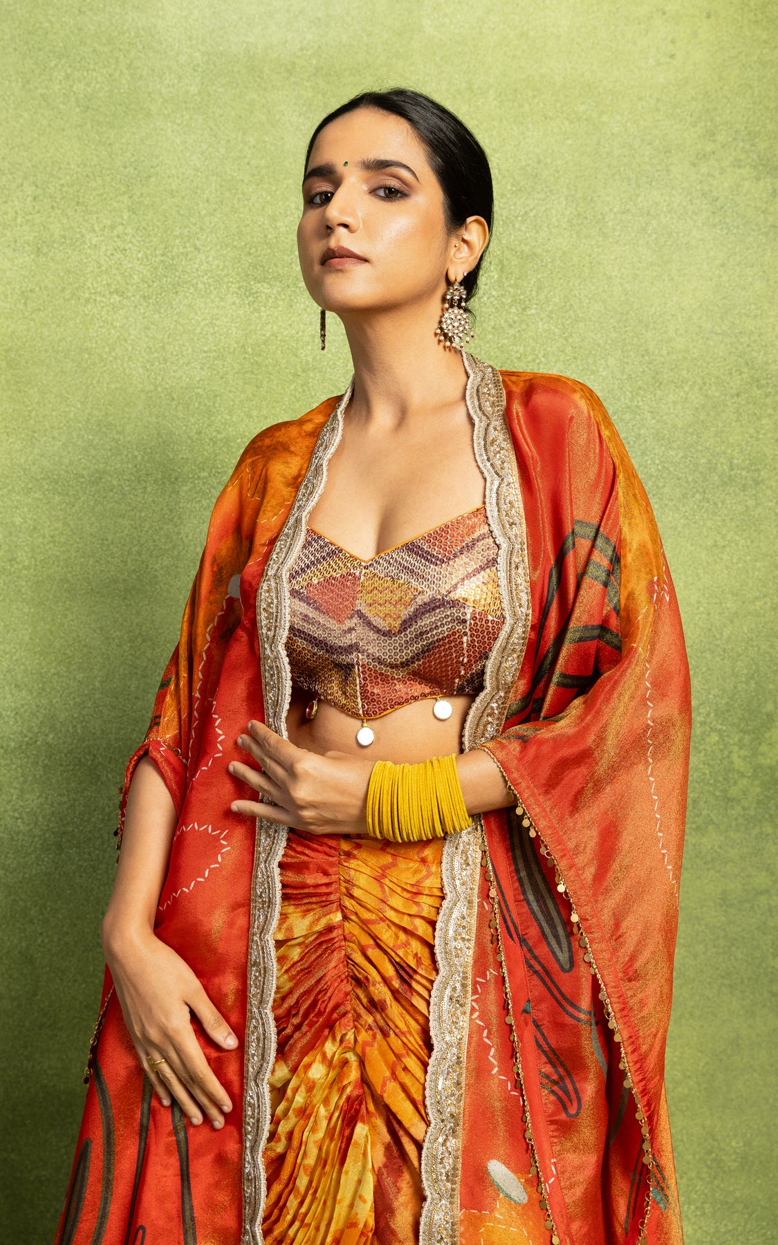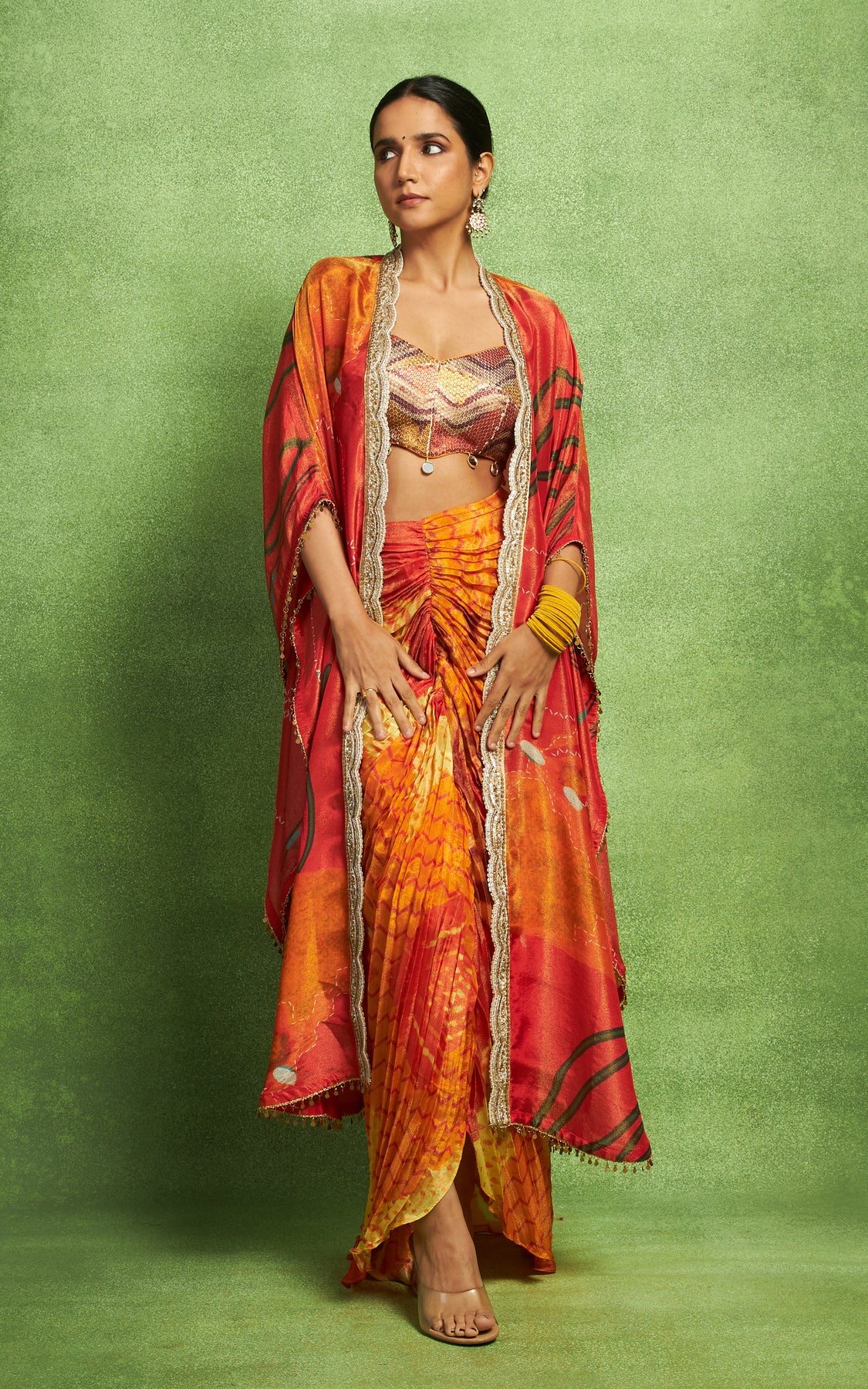 The jacket is paired with a hand pleated skirt and a sequin embroidered bustier.