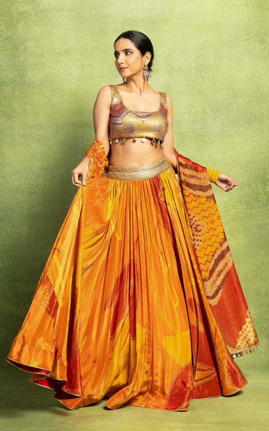 Floral abstract printed gathered lehenga in shades of orange and yellow with hand embroidery