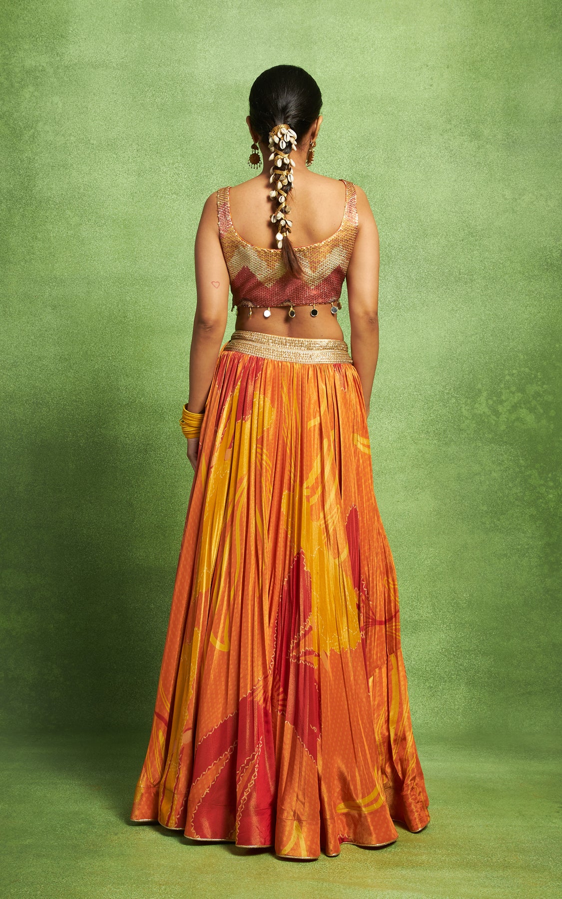 details on the waist, paired with a fully sequin detail bustier & a dupatta. The bustier & dupatta are adorned with shells and mirror tassels.