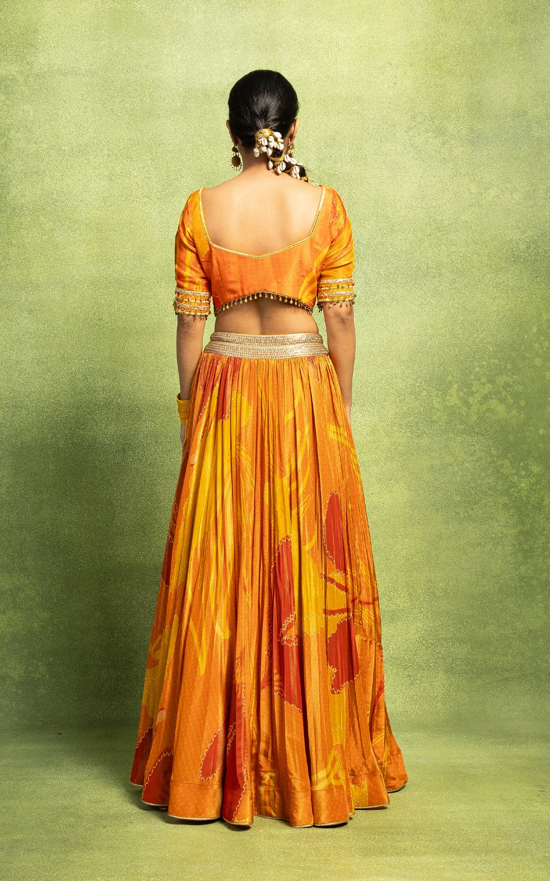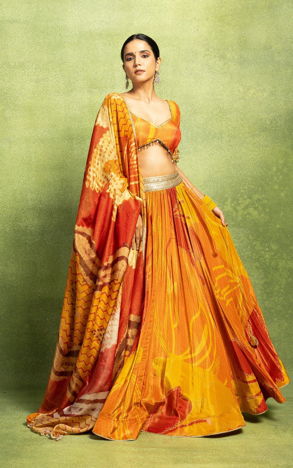 Floral abstract printed gathered lehenga in shades of orange and yellow with hand embroidery details on the waist, paired with a bustier with elbow length sleeves and embroidery details & a dupatta which is adorned with shells and mirror tassels.