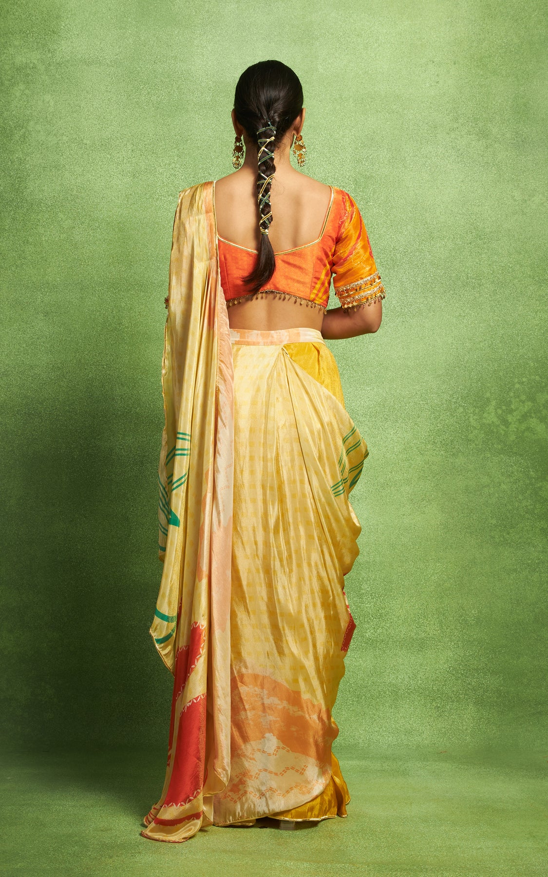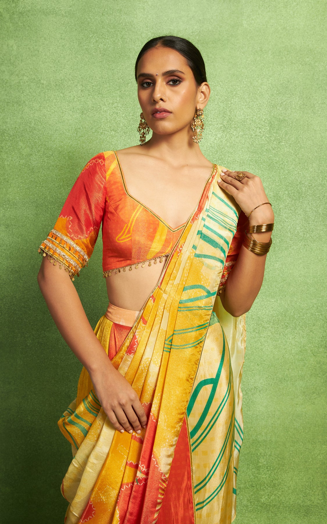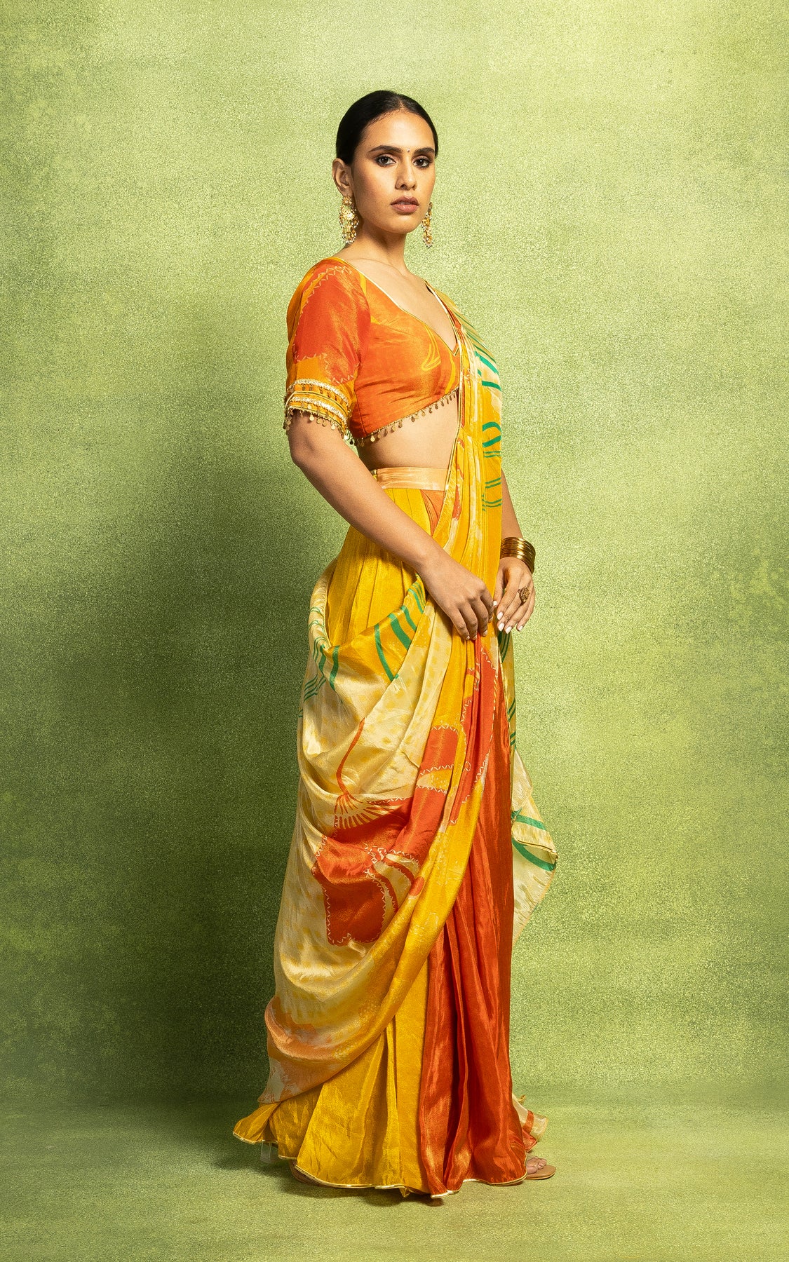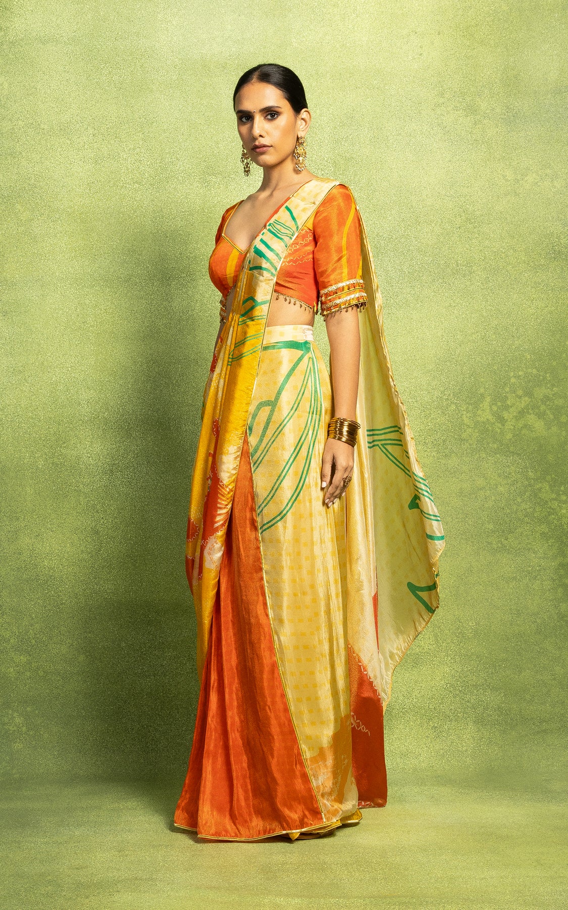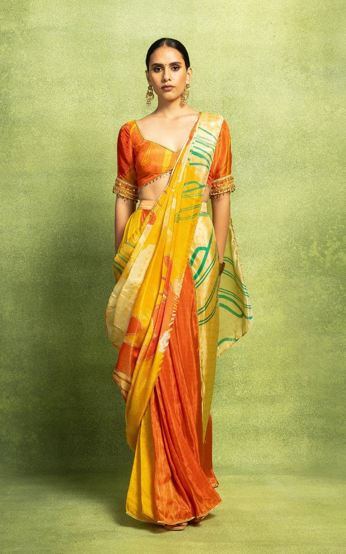 Abstract floral print pre-draped saree with a pre-pleated pallu and border detailing, is paired with an orange printed blouse with sleeves and embroidery details.