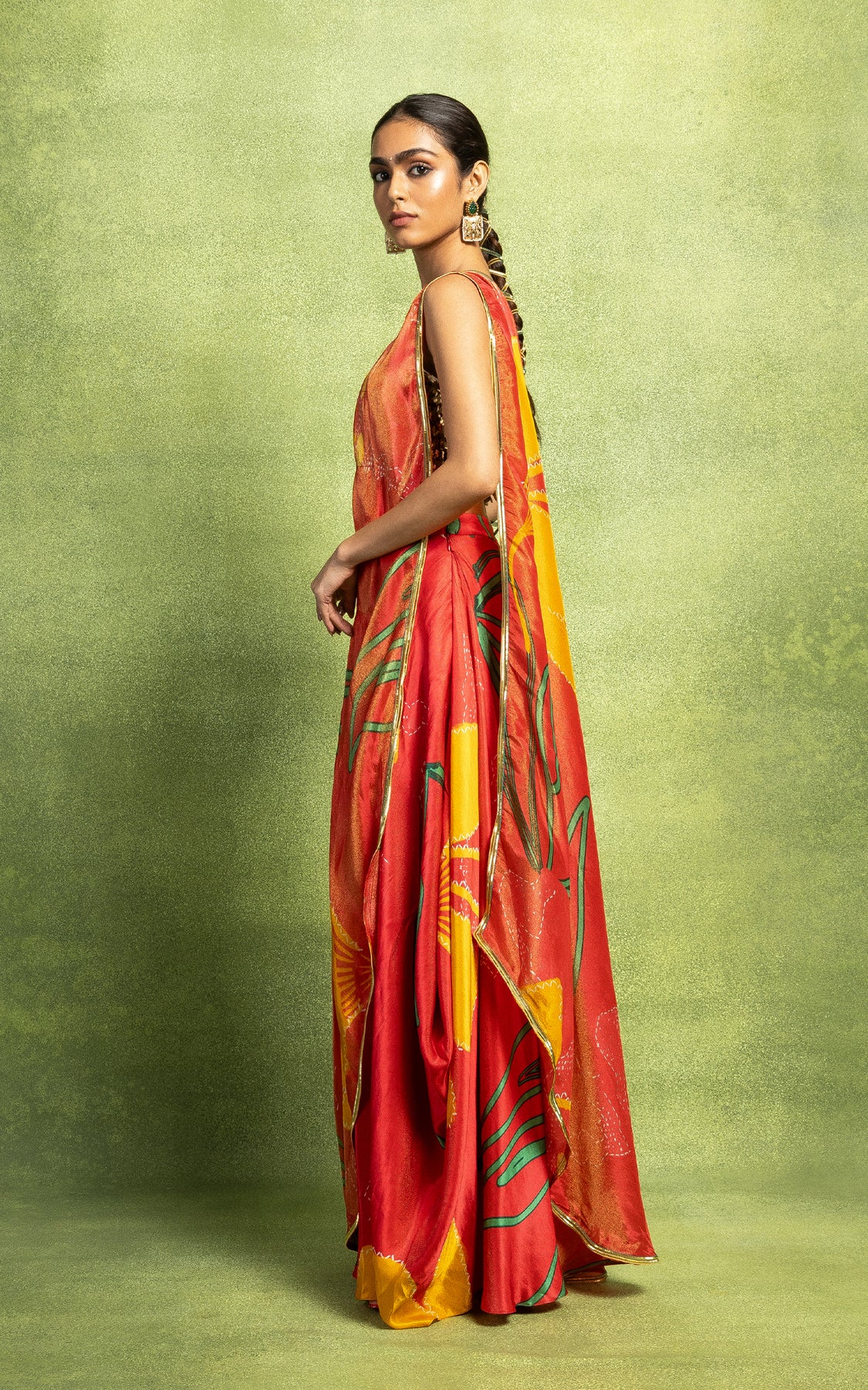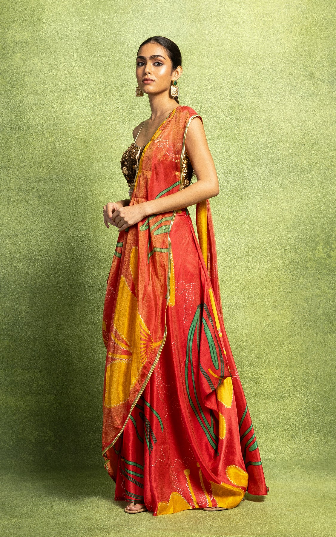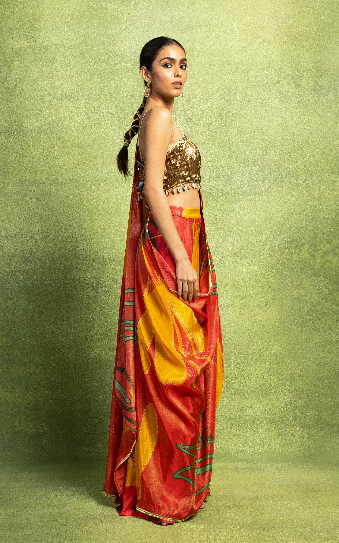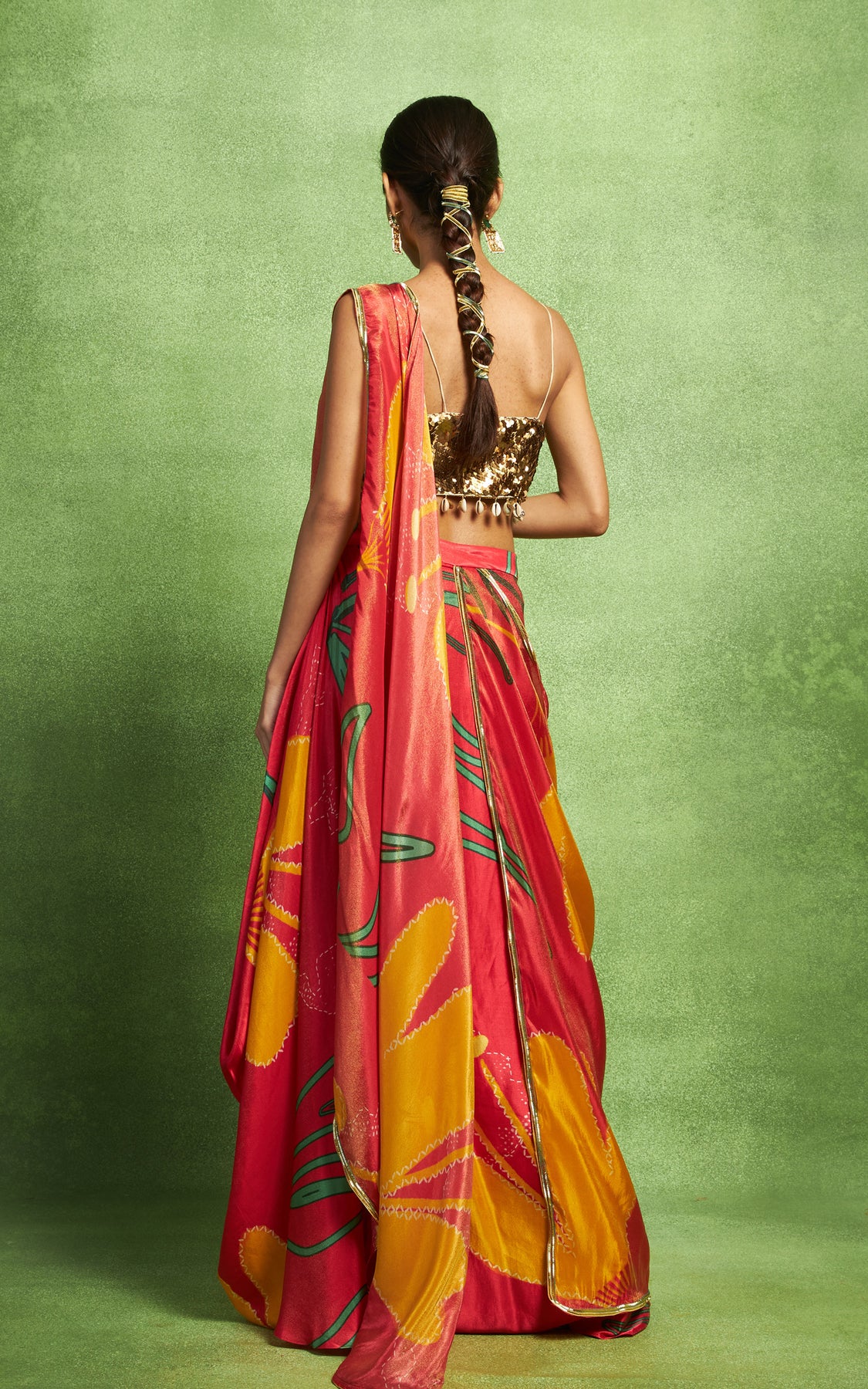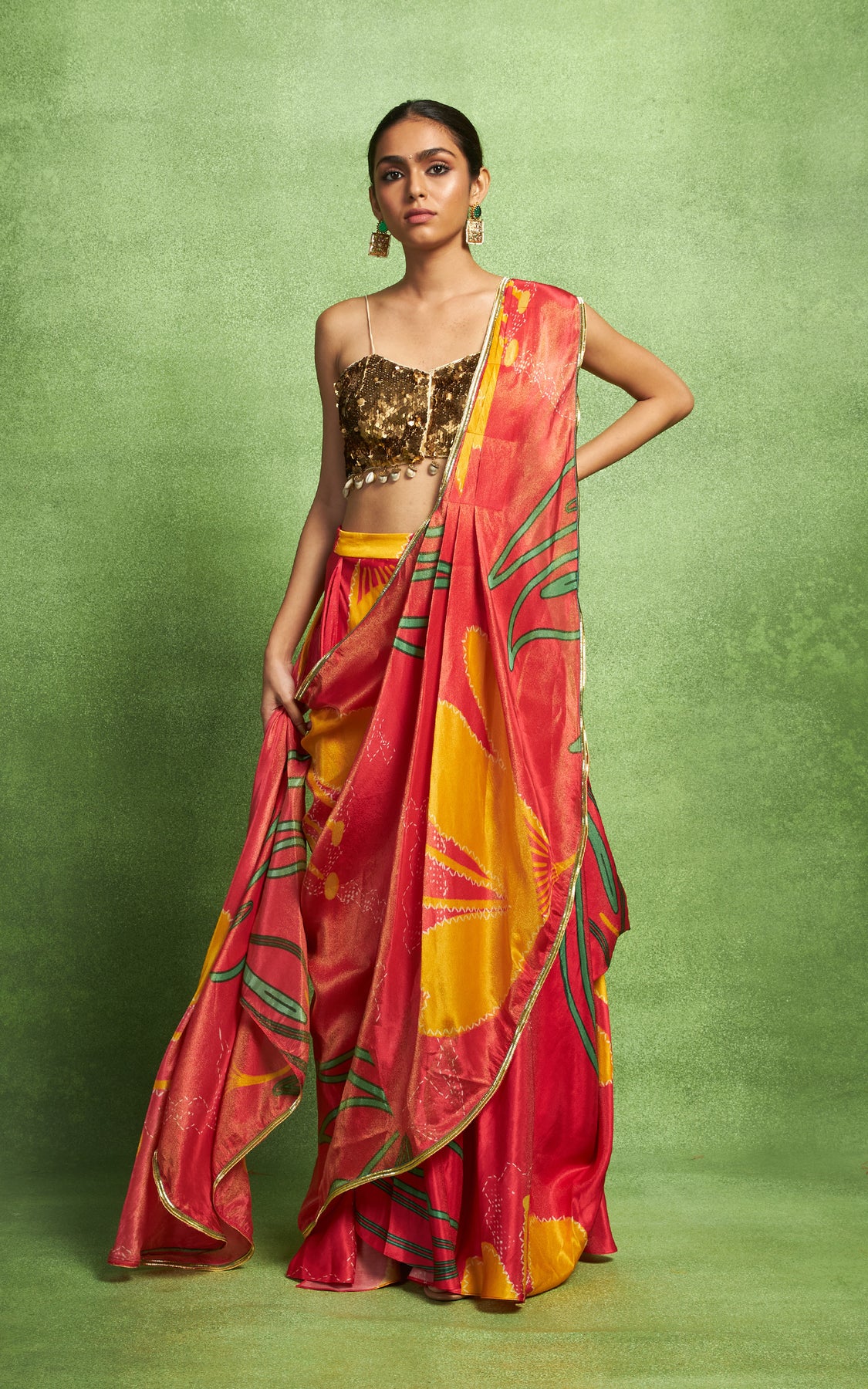 Abstract floral print pre stitched saree paired with a dull gold sequin work blouse.
