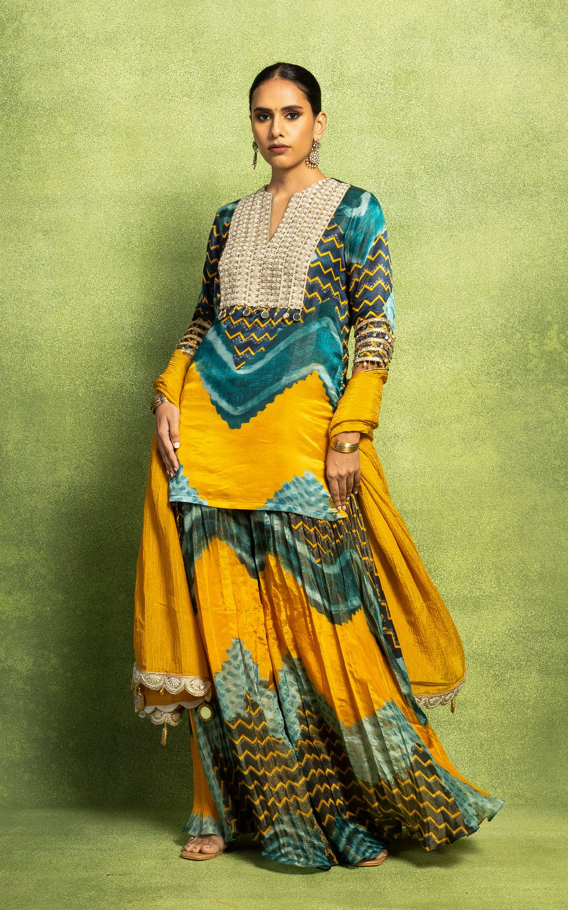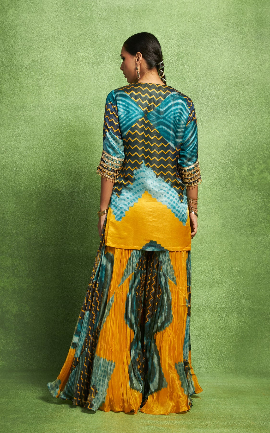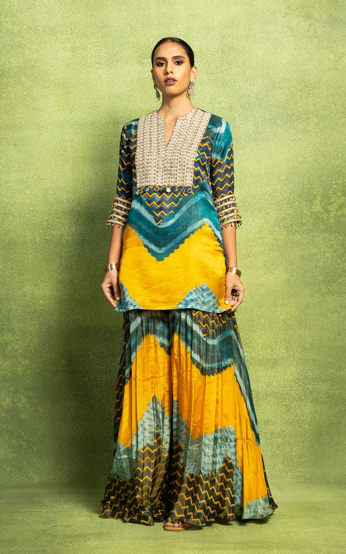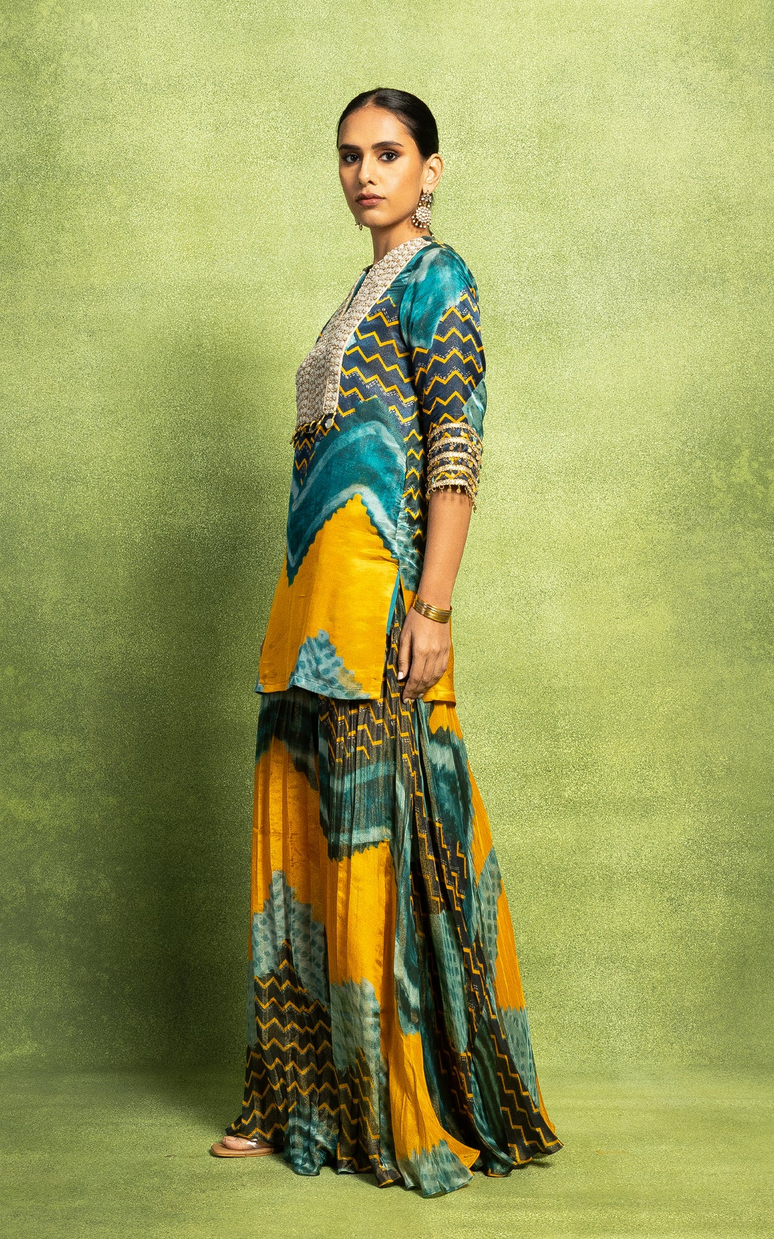V-Neck abstract print short kurta with embroidery and mirror work detailing around the neck line and cuff of the sleeves.