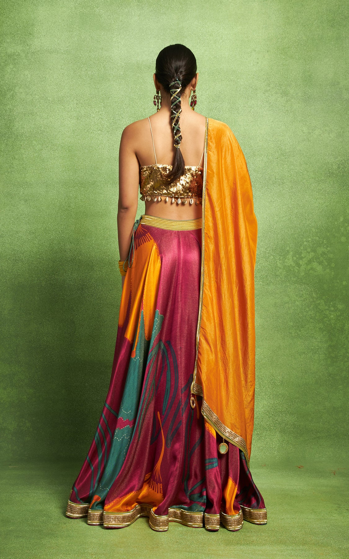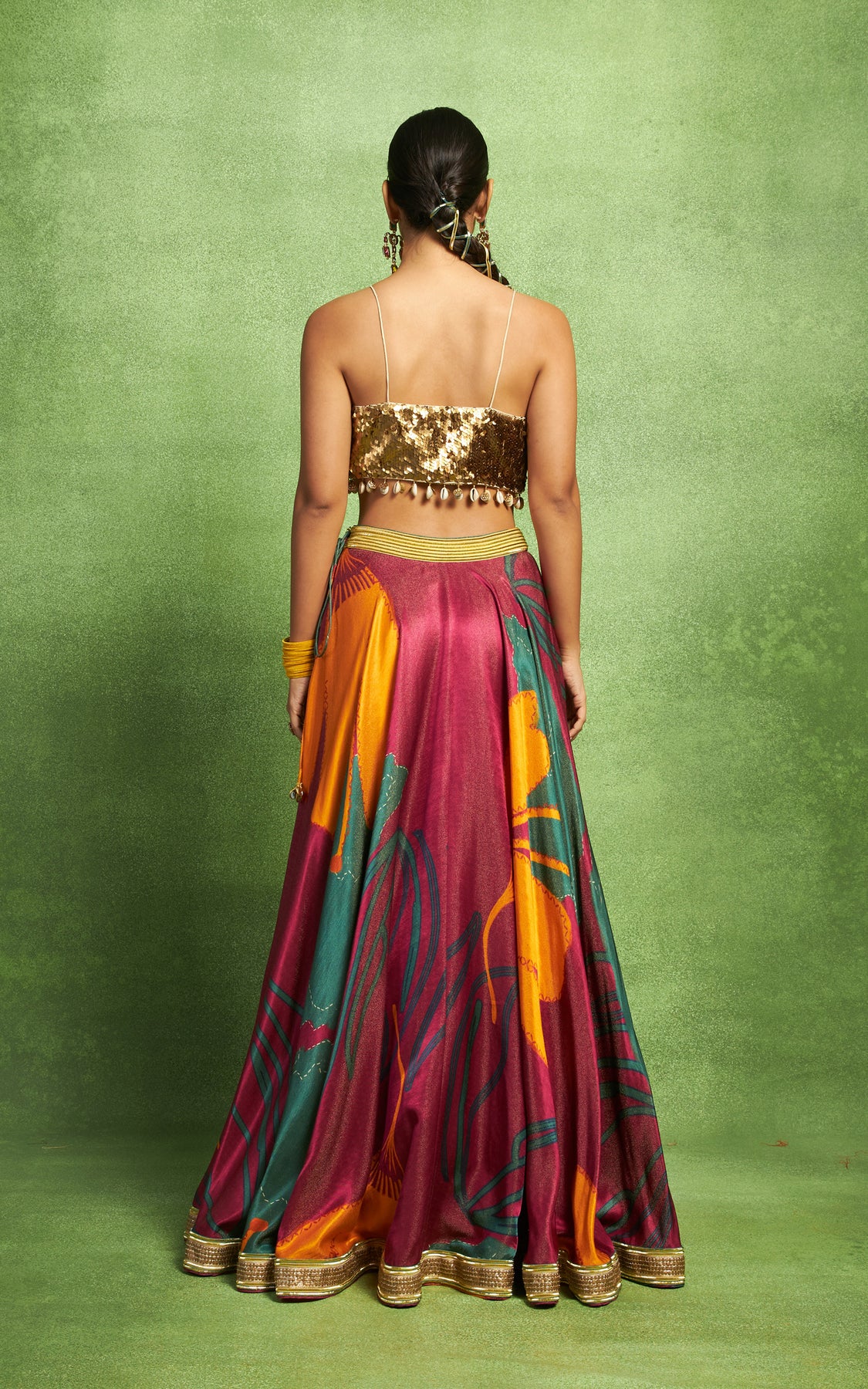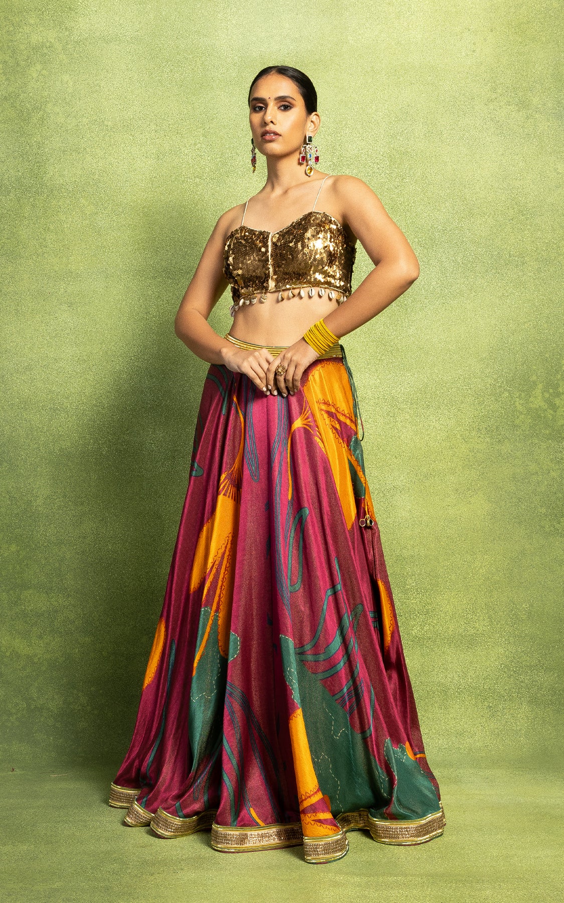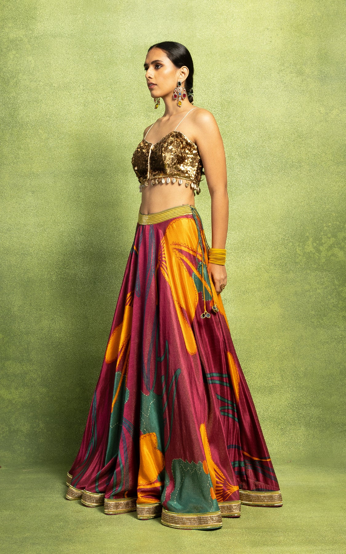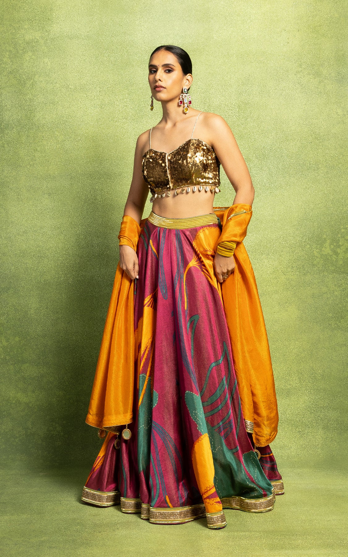 Abstract Floral Printed Lehenga set with a full sequined buster & dupatta.