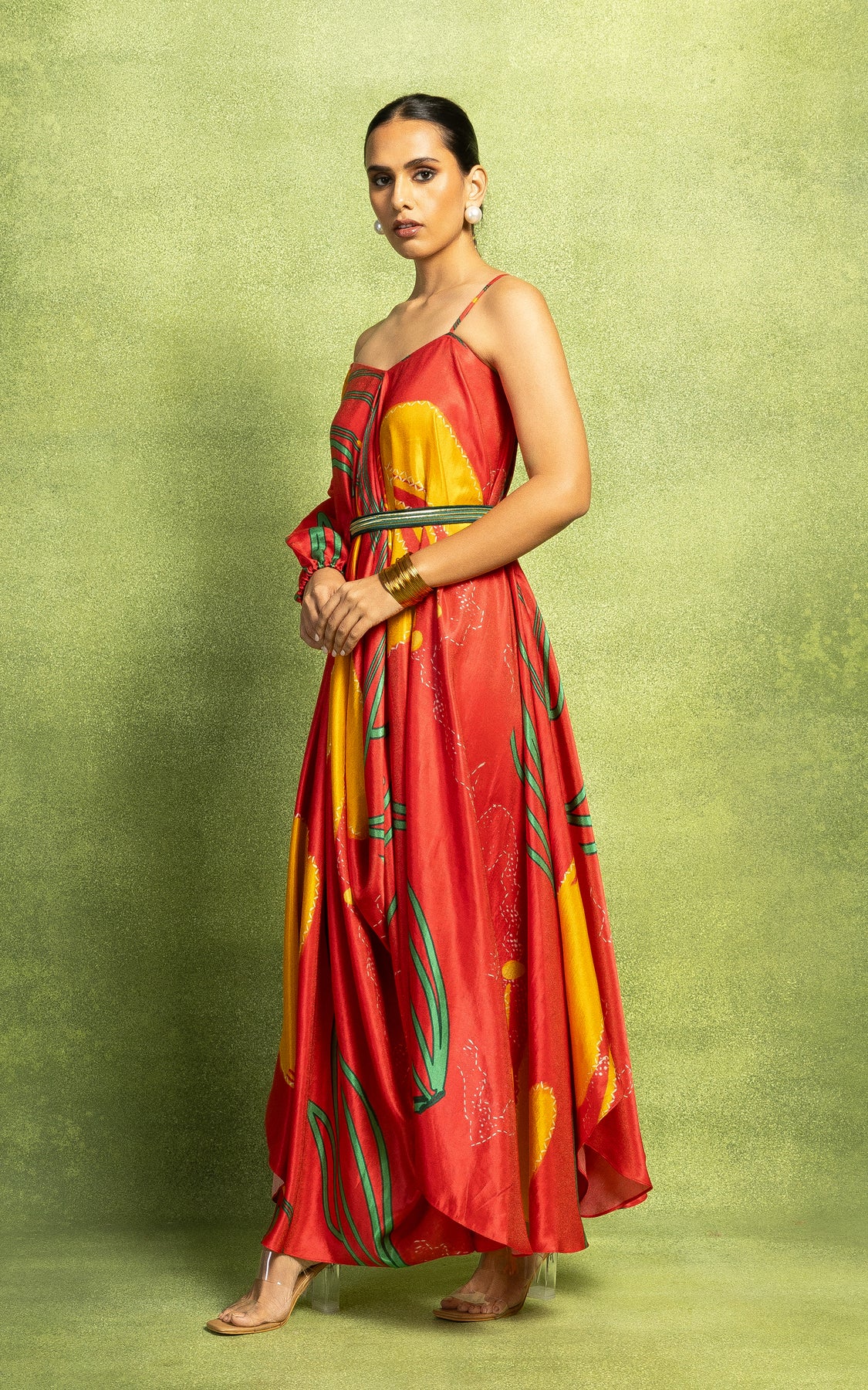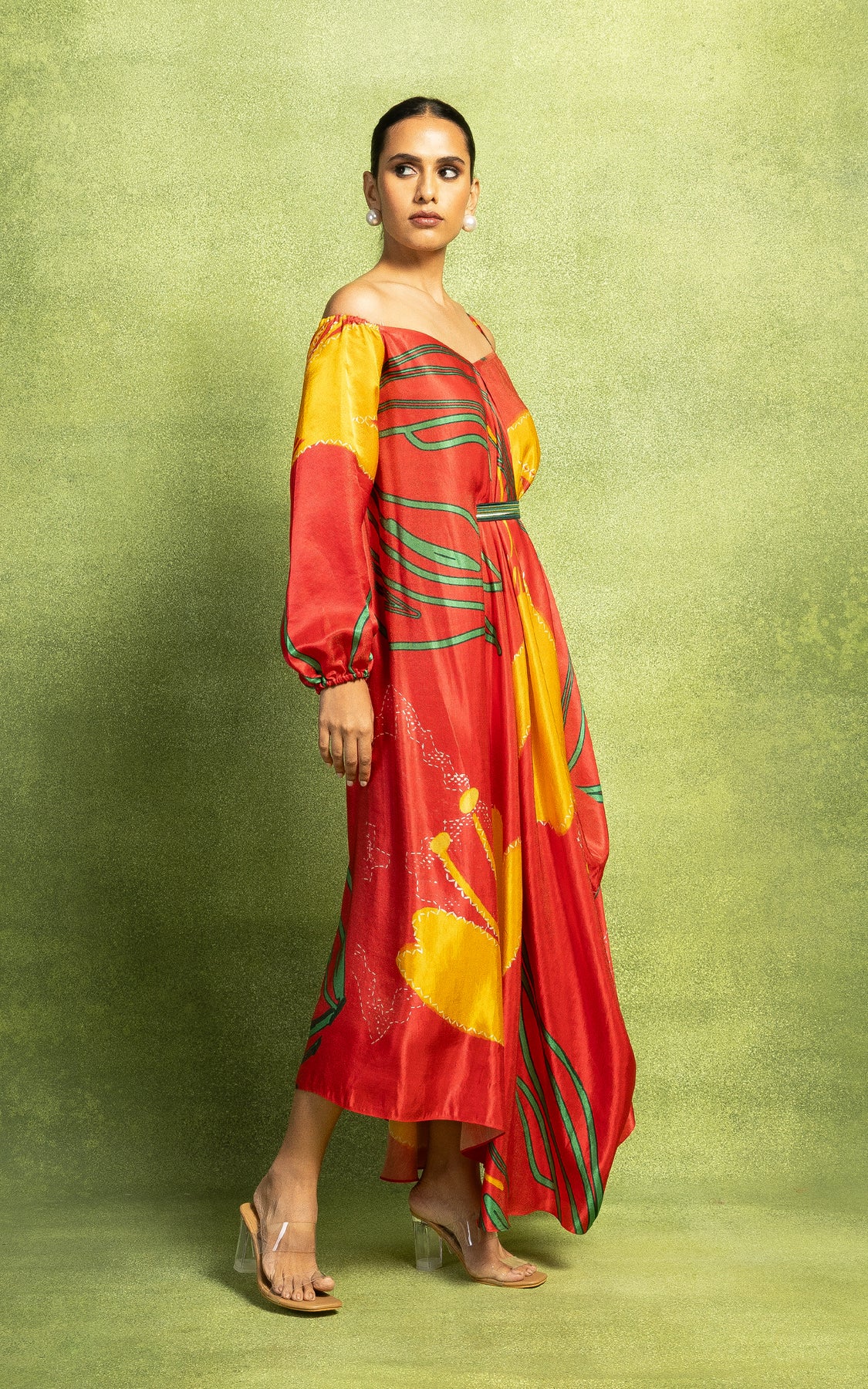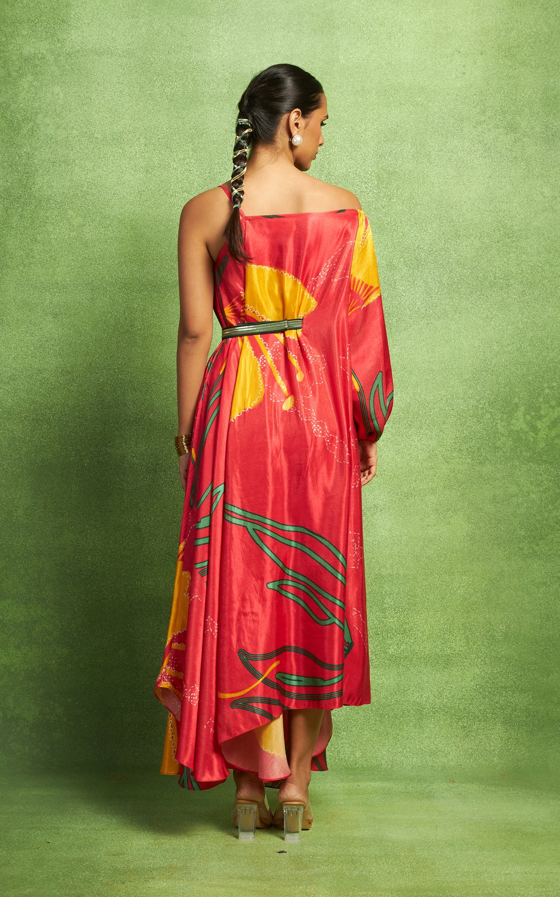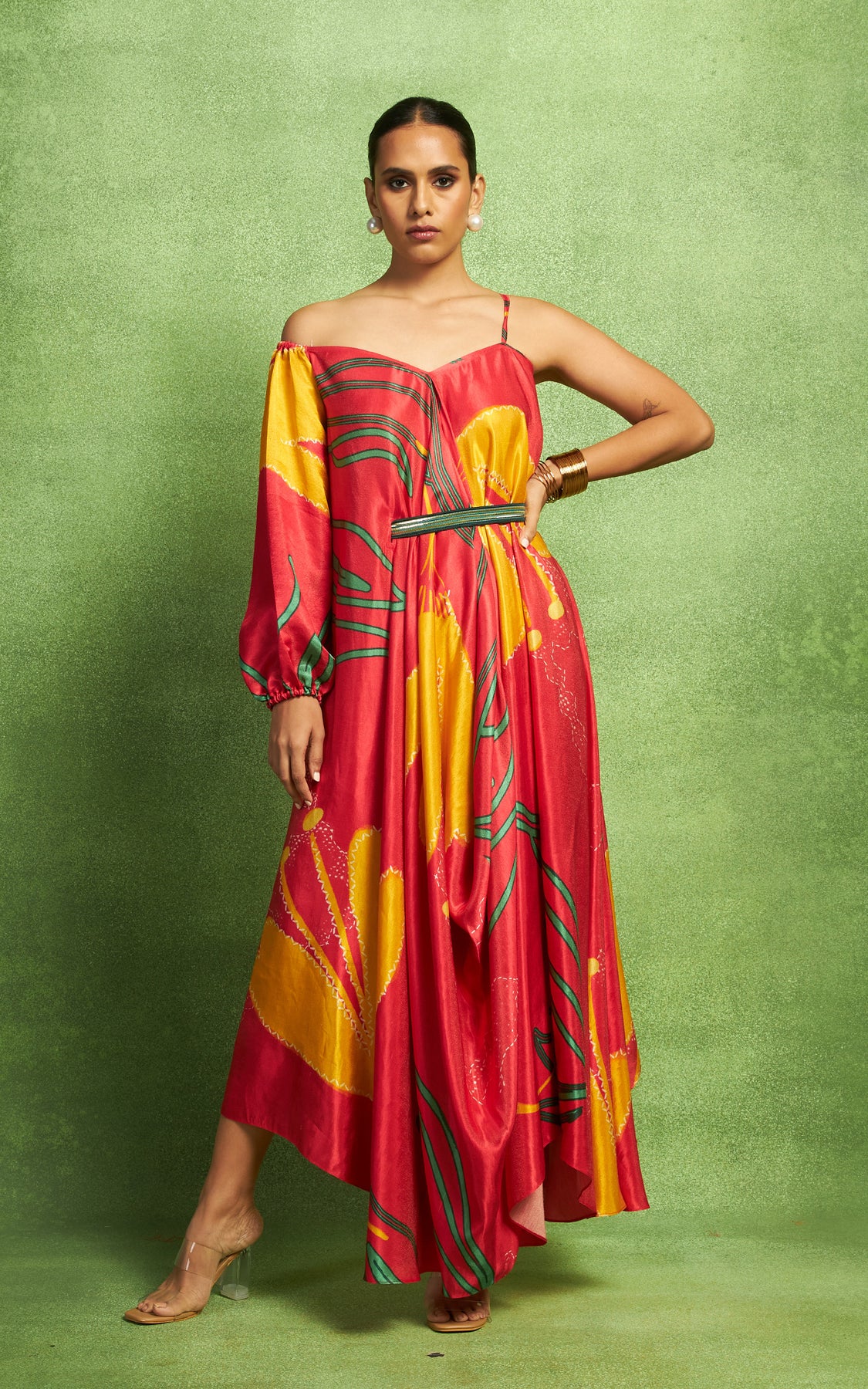 Abstract floral print off-shoulder style drape dress with an asymmetric hemline & one side full sleeves. It comes along with a sequined belt which cinches on one side of the waist. The sleeve has an elastic cuff detailing.