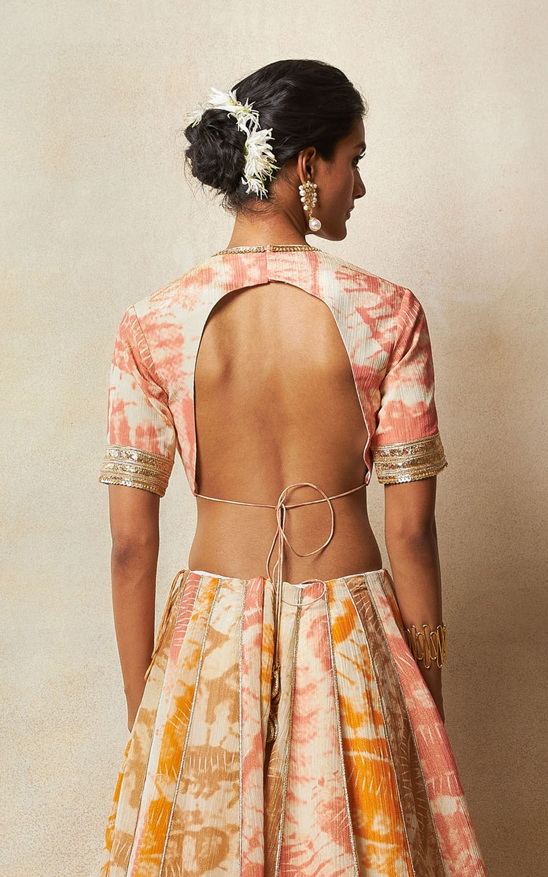 Pink abstract bandhani printed v- neck blouse with zari and embroidery border detailing. the blouse has a cutout back adorned with latkans.