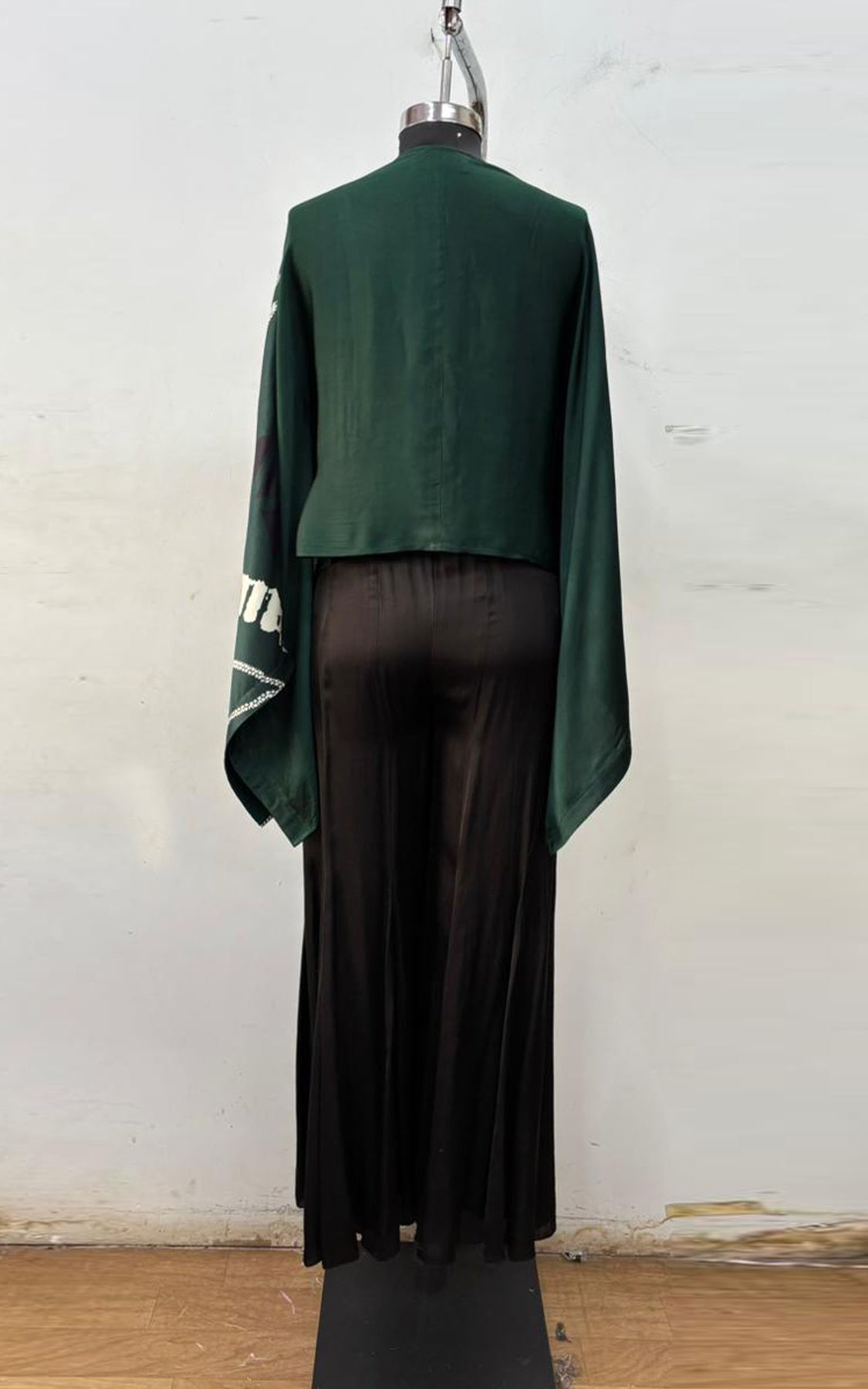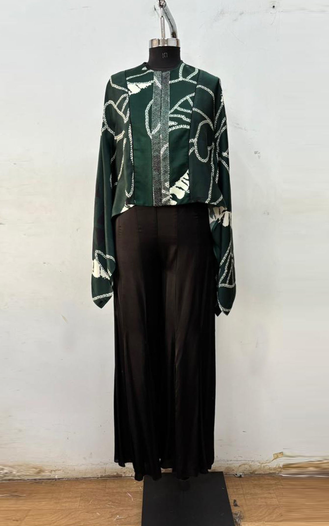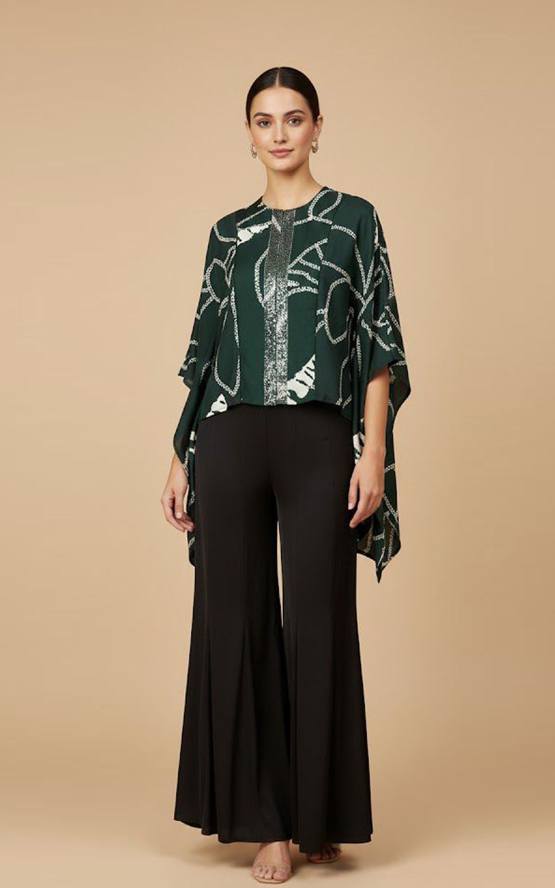 Paneled kaftan style flowy top with sequin detailing in the front. The top is paired with a solid black flared godet pants.