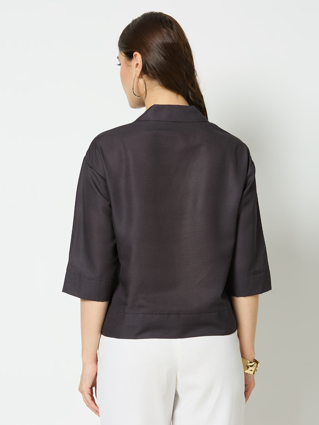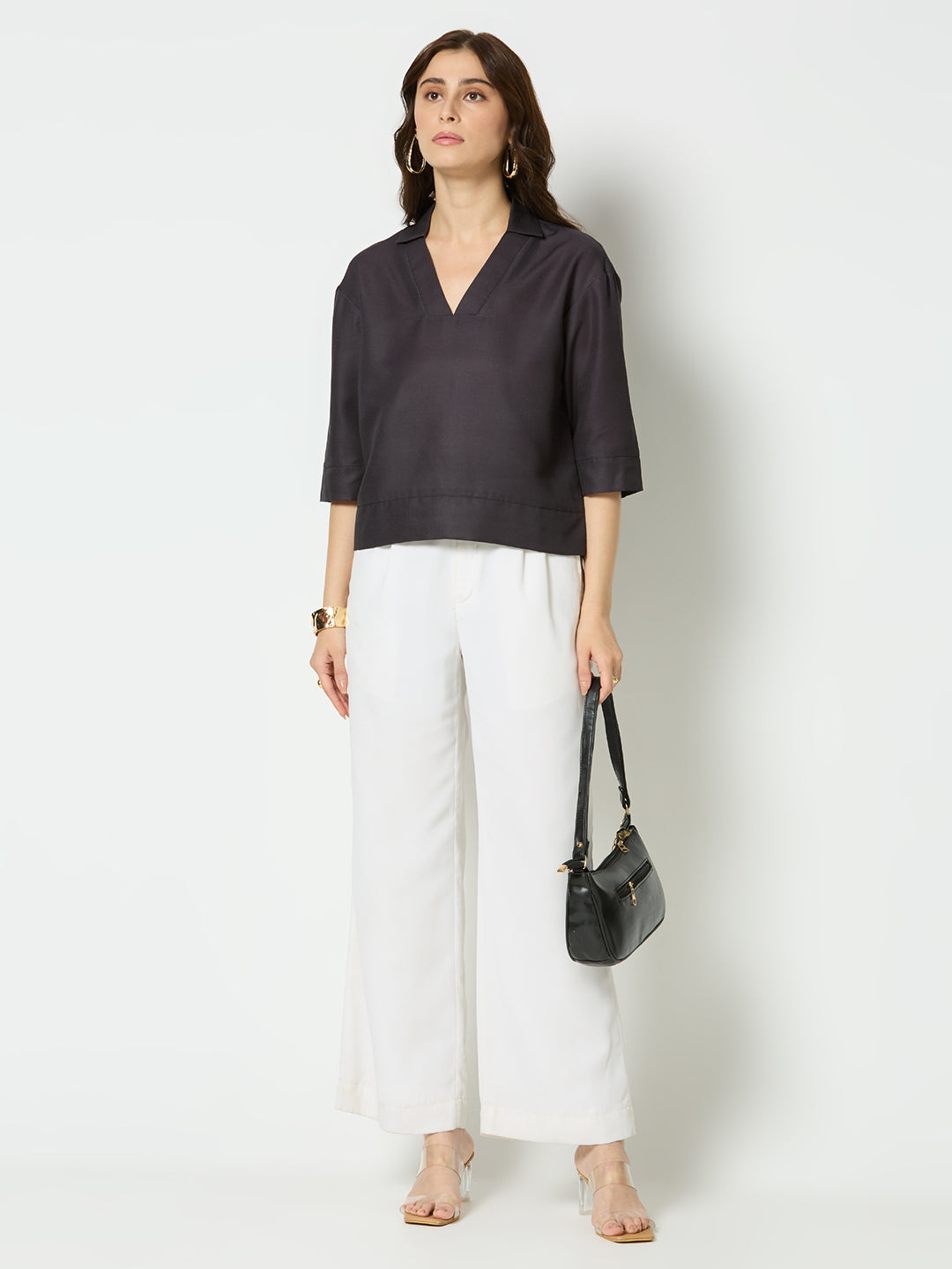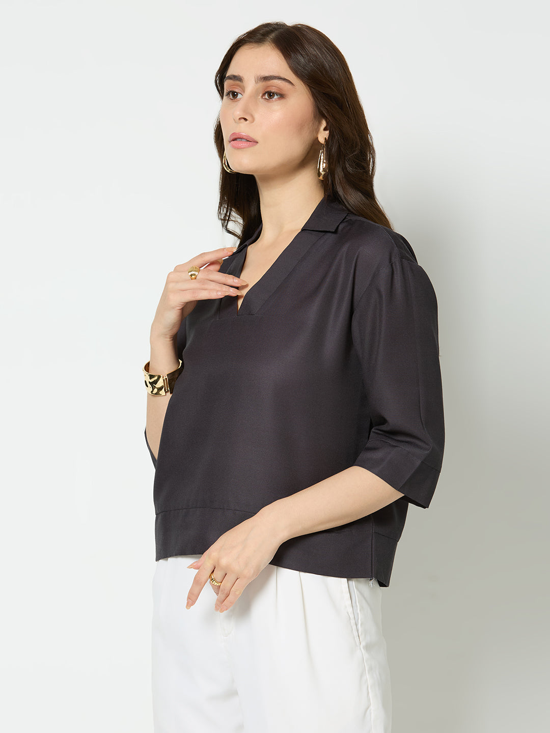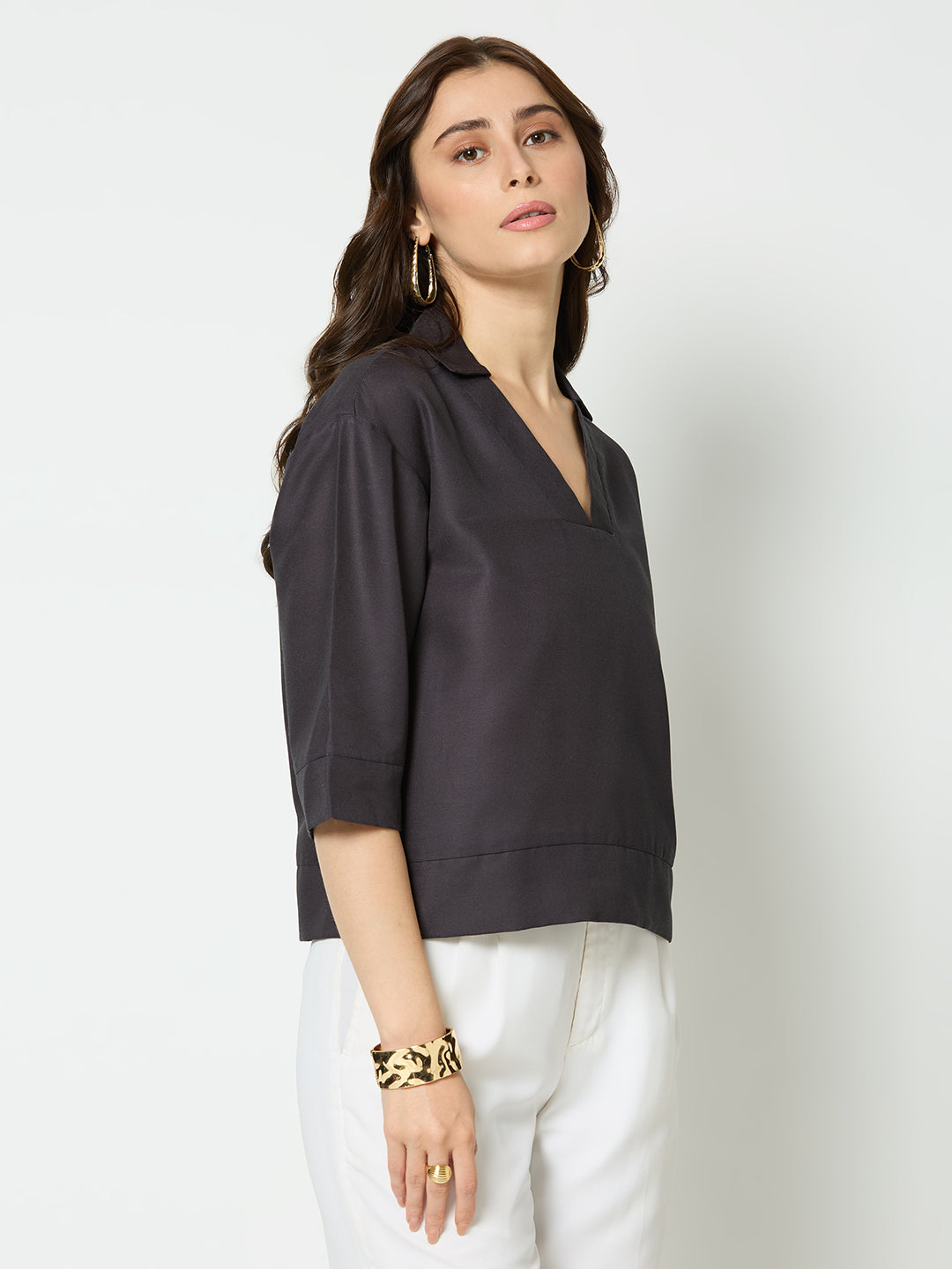 Solid black straight fit v-neck top.
