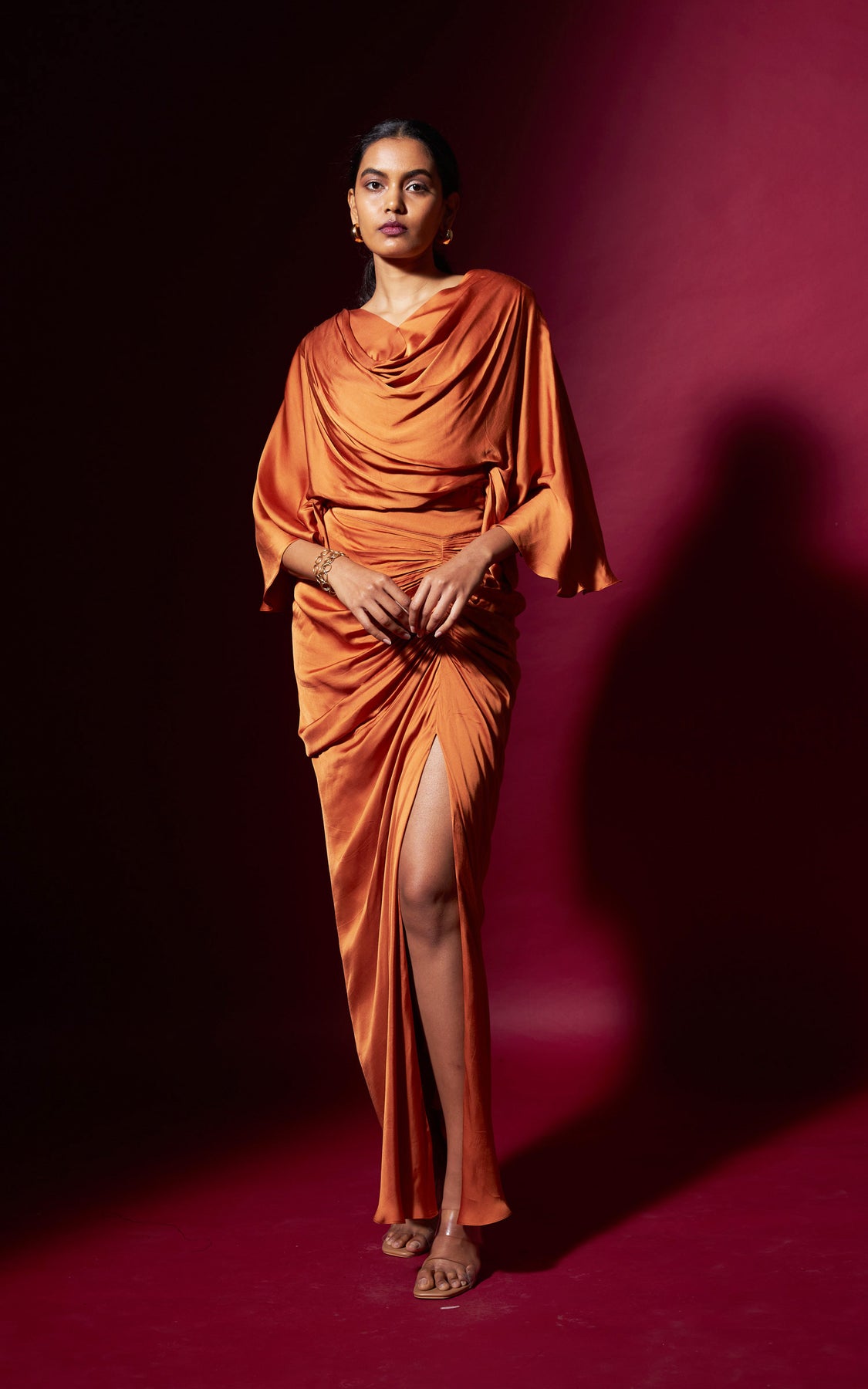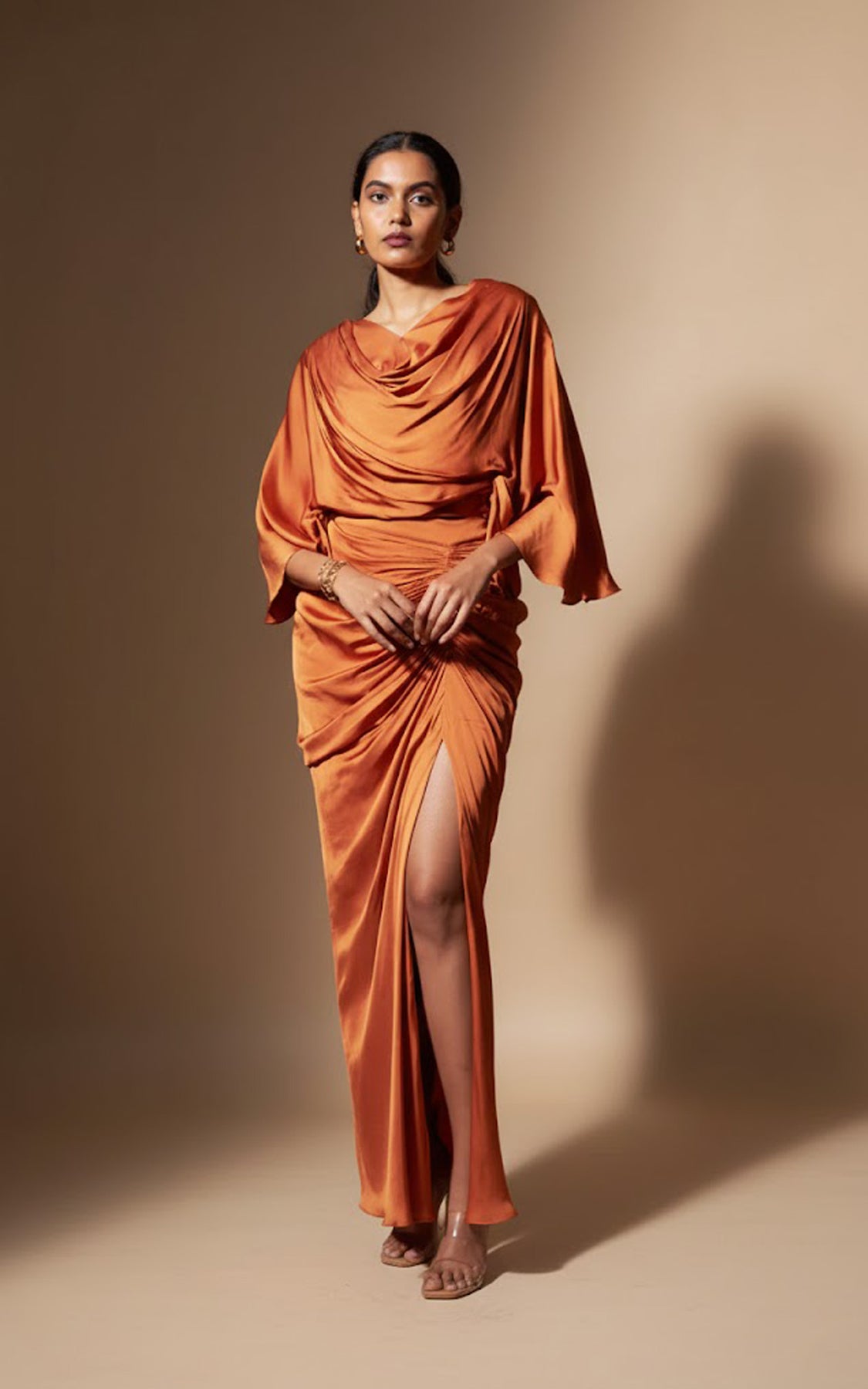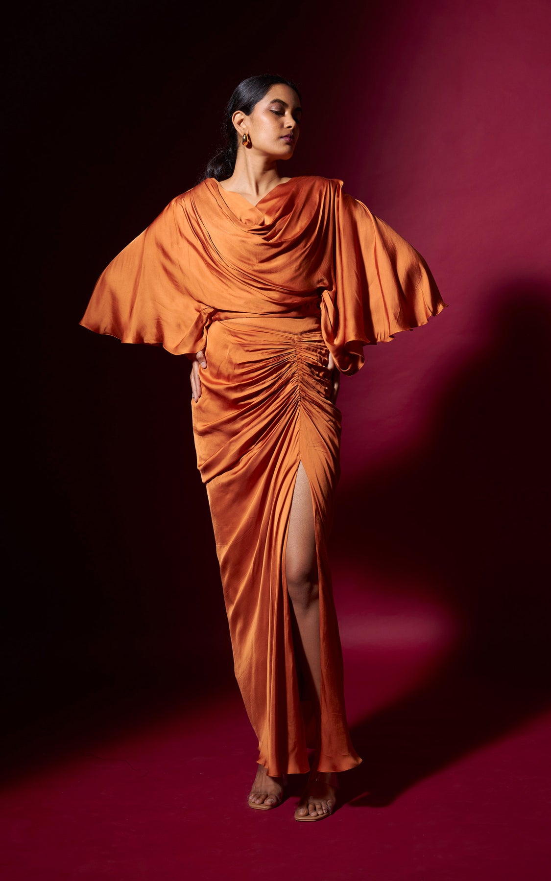 A cowl-style top paired with flare sleeves and a draped skirt featuring pleated detailing and a statement side slit.
