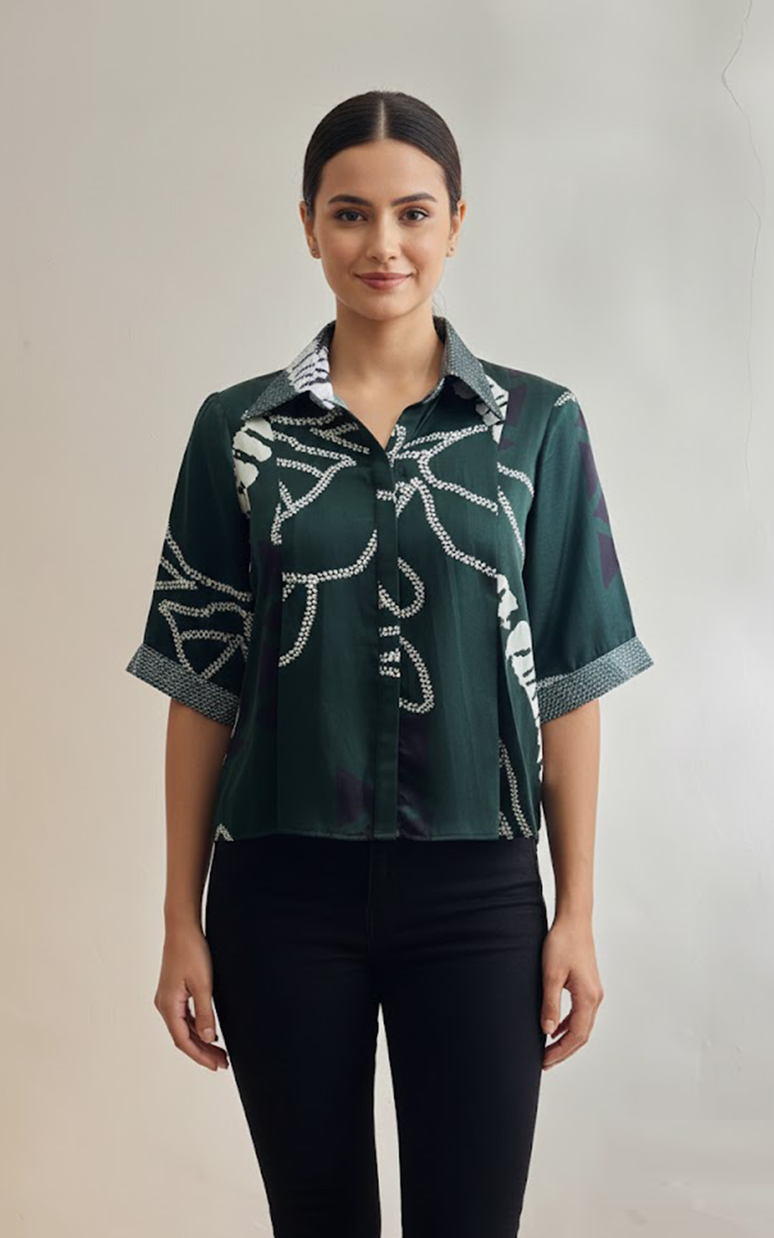 Green & black abstract printed shirt with sequin detail on collar and cuff.