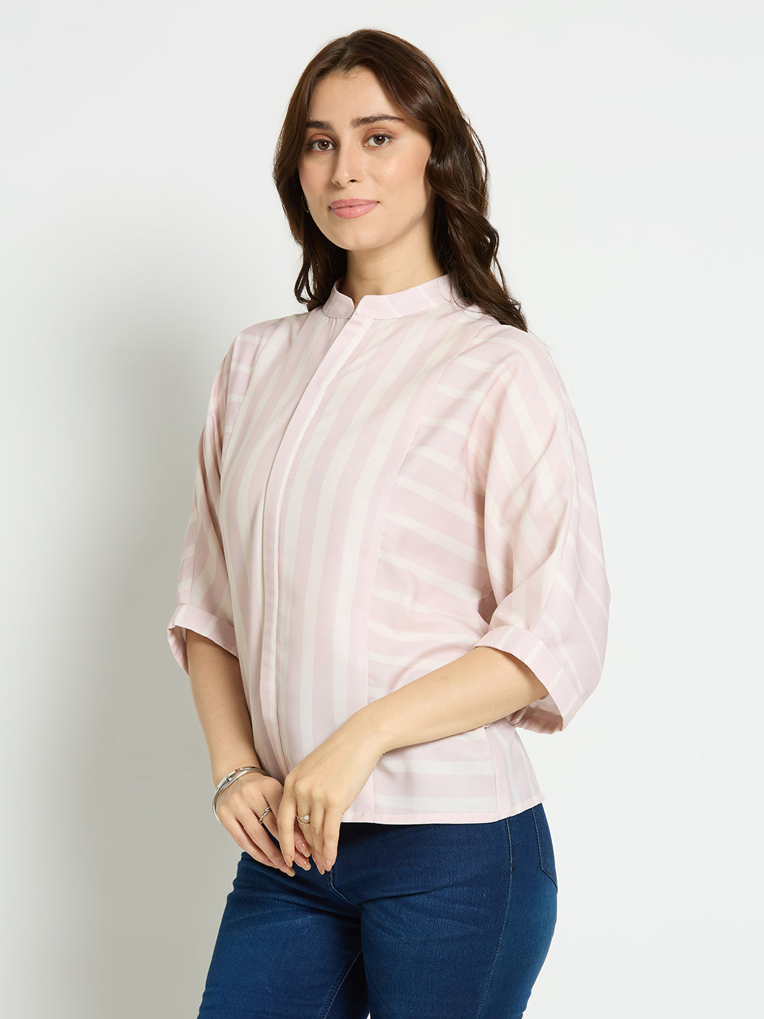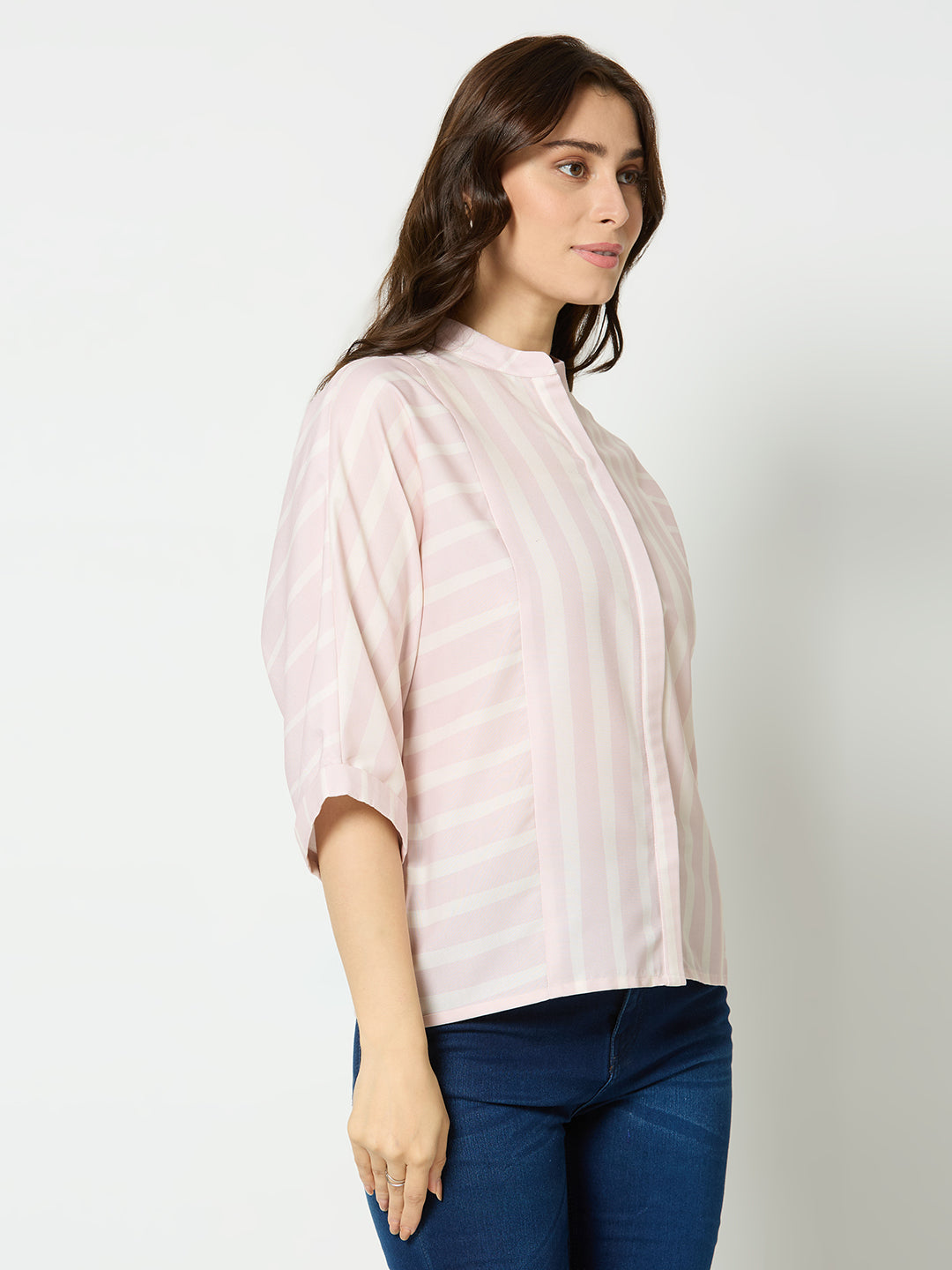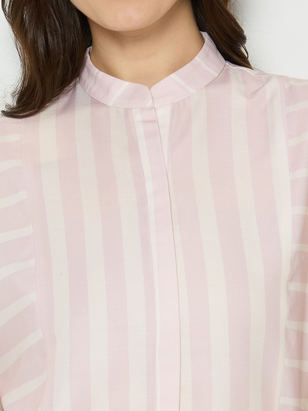 Stripe print with mandarin collar top.