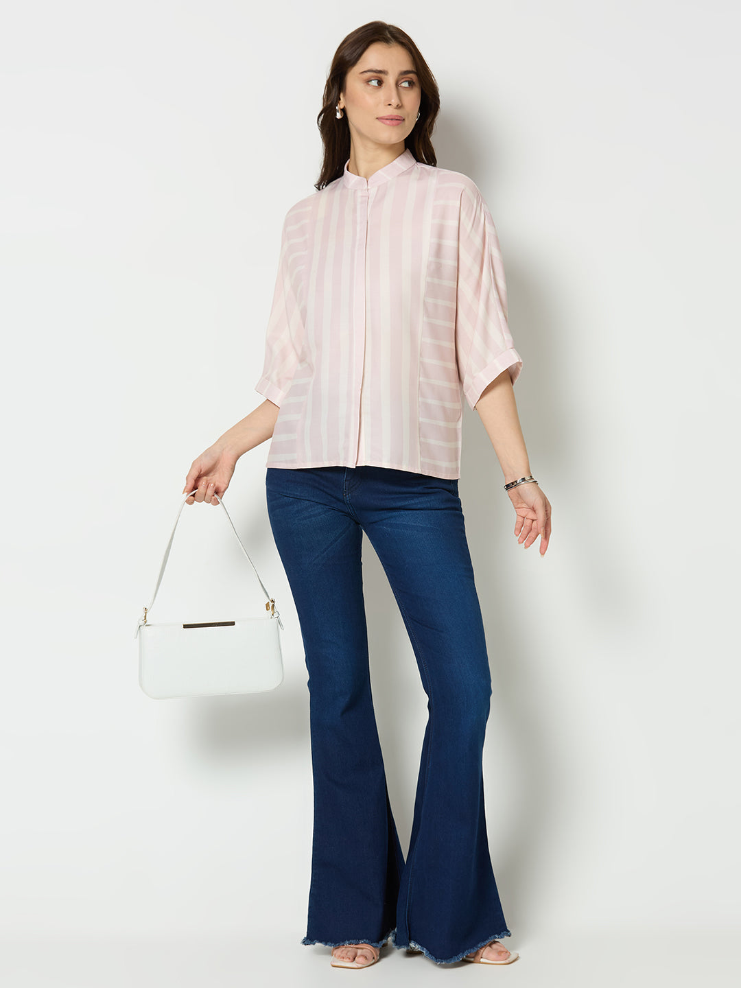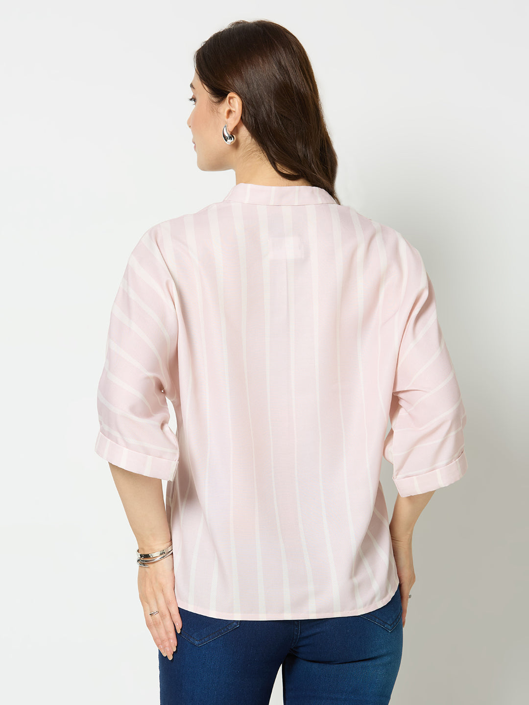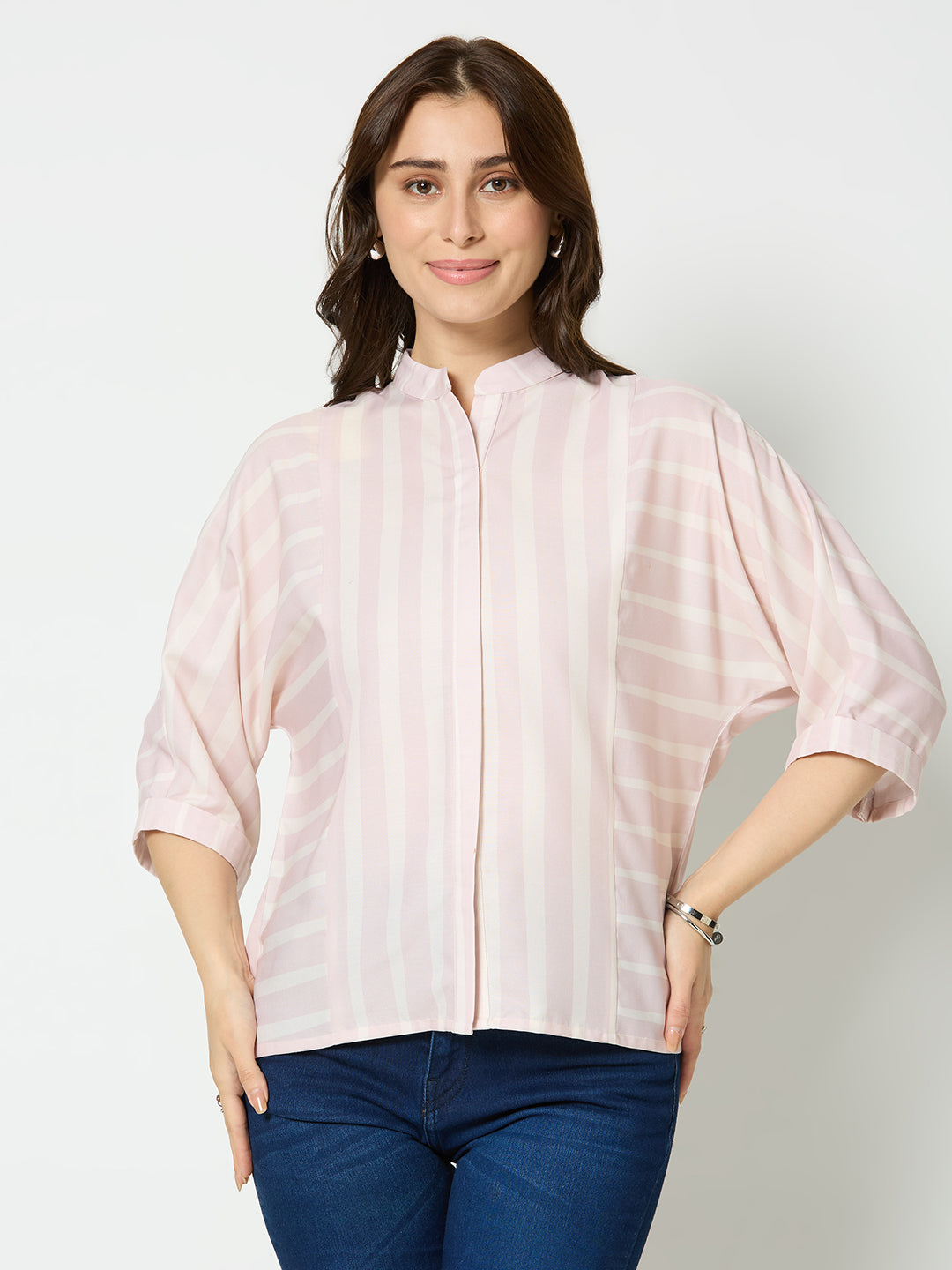 Stripe print with mandarin collar top.